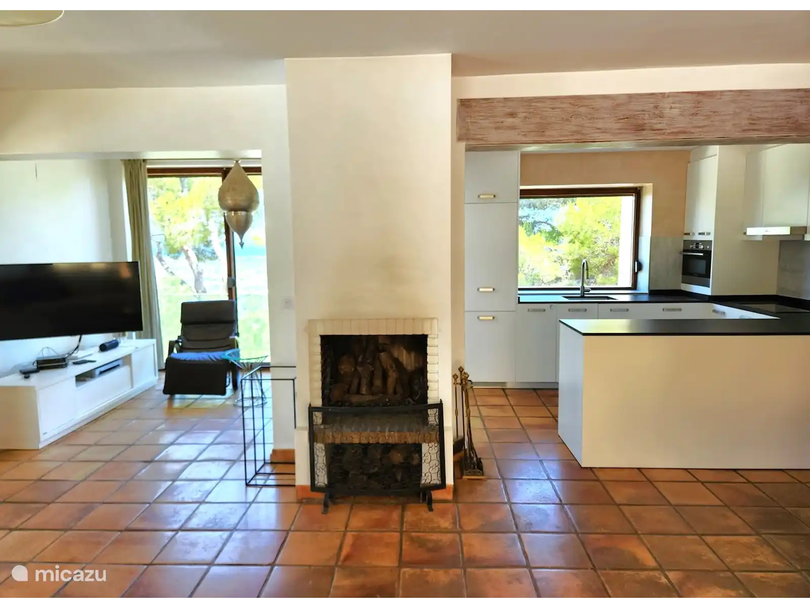 Séjour spacieux entièrement meublé avec climatisation, coin repas, cheminée, TV LED 46 pouces, chaînes néerlandaises et internationales, DVD, WIFI, lave-linge, sèche-linge, système d'alarme, bref, tout ce dont vous avez besoin pour passer des vacances inoubliables avec 1 à 6 personnes.