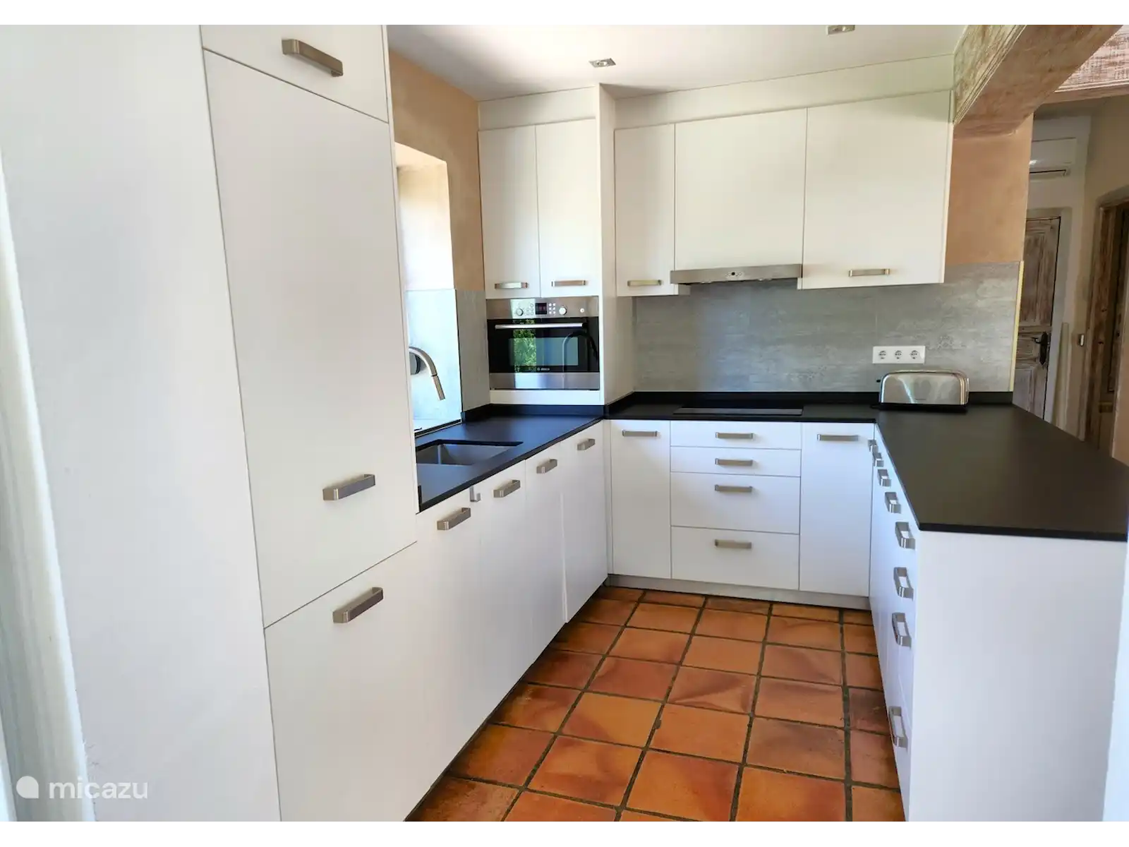 Cuisine ouverte moderne entièrement équipée. (réfrigérateur, congélateur, lave-vaisselle, micro-ondes, four, plancha, électroménager de cuisine, machine Nespresso, etc.)