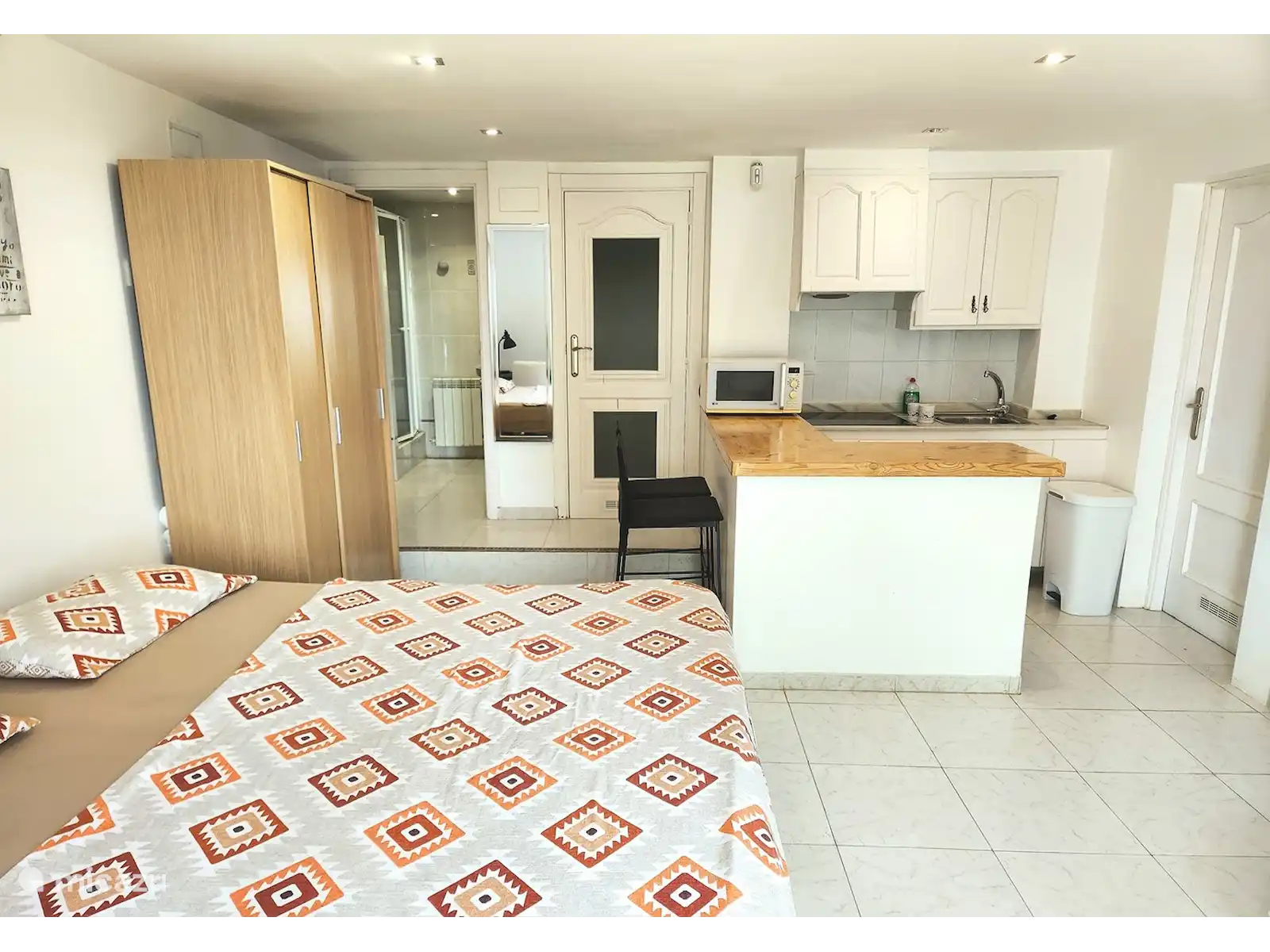 Entrée et accès par un escalier extérieur. Là, vous pouvez également choisir entre un lit double ou 2 lits simples. Il offre également une deuxième cuisine, une TV LED et un
