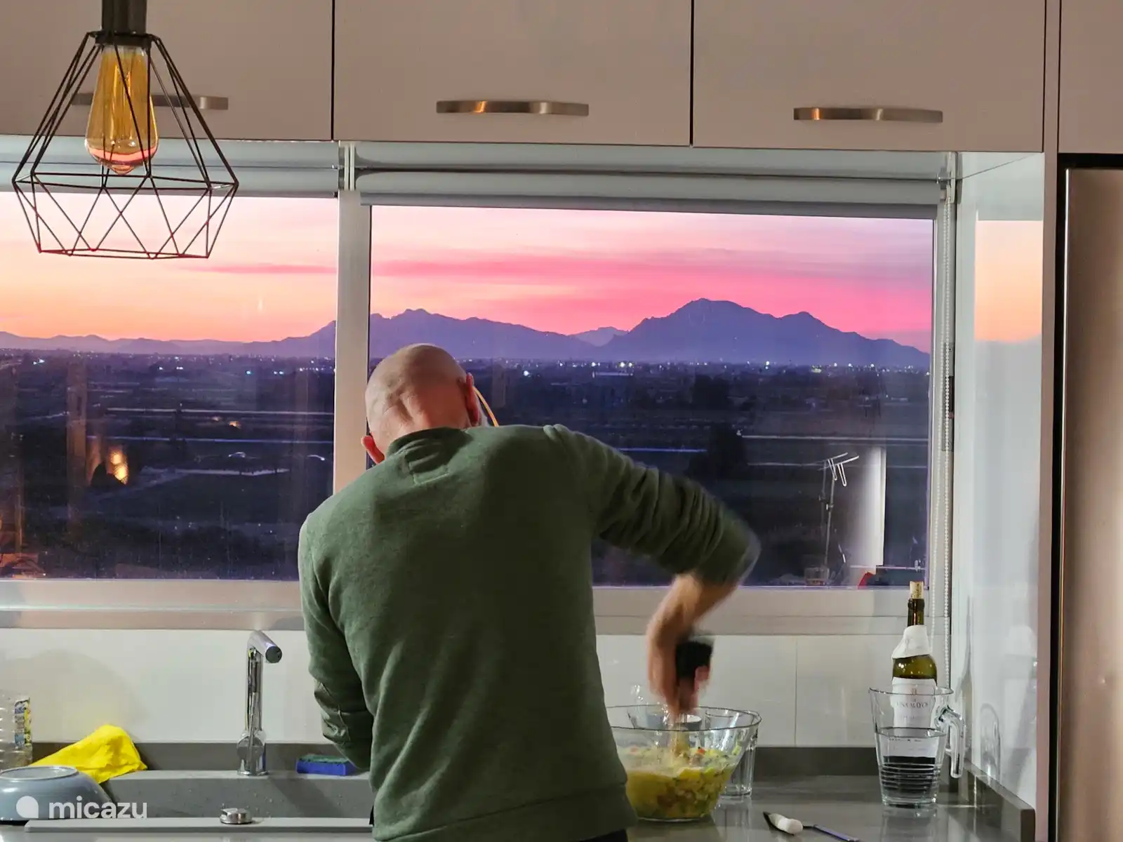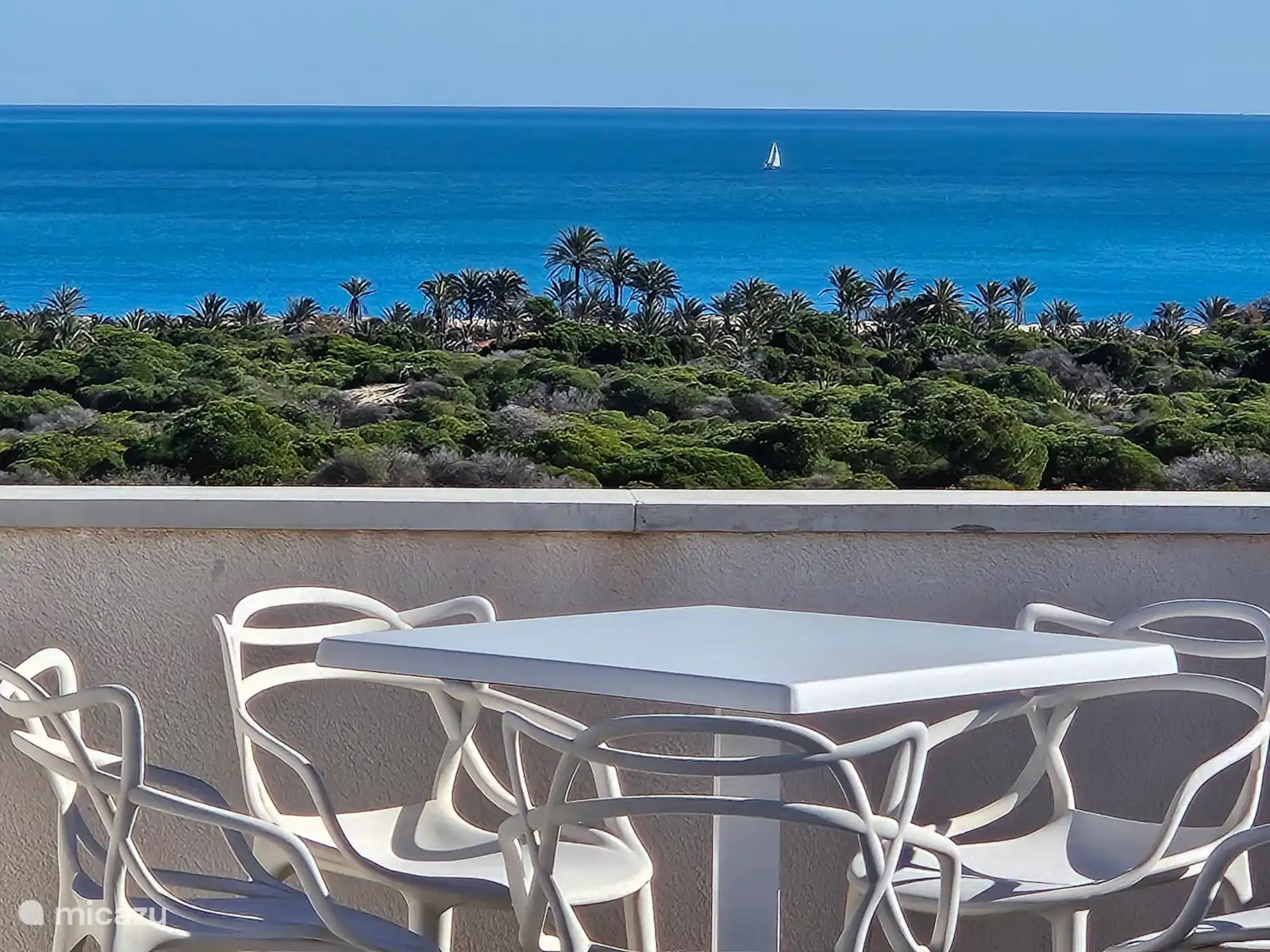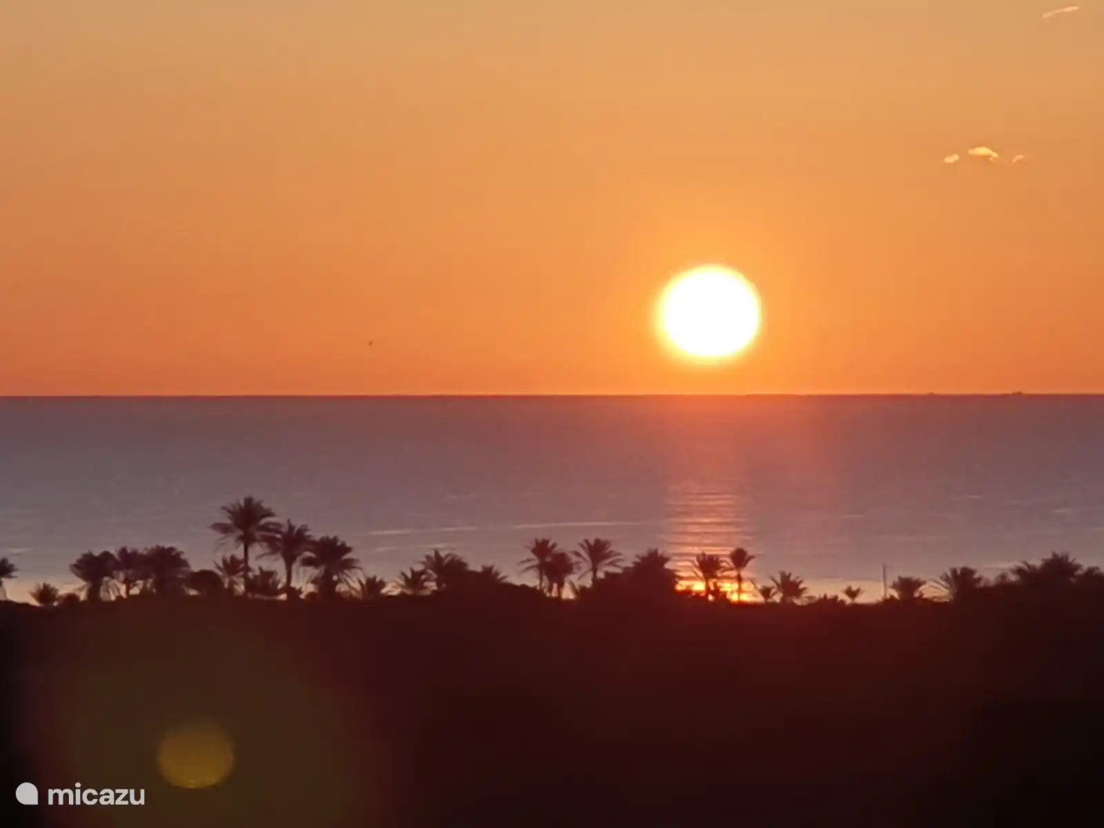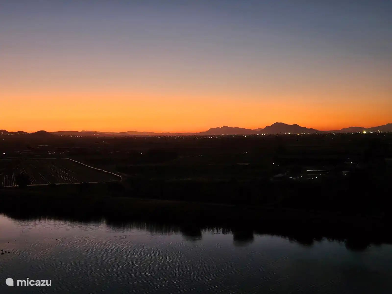 🌴 Depuis l’appartement et la vaste terrasse privée sur le toit, on regarde le soleil levant sur la mer Méditerranée et le parc de palmiers à l’avant, ainsi que l’arrière-pays avec la rivière Segura et le soleil couchant derrière les montagnes à l’arrière.