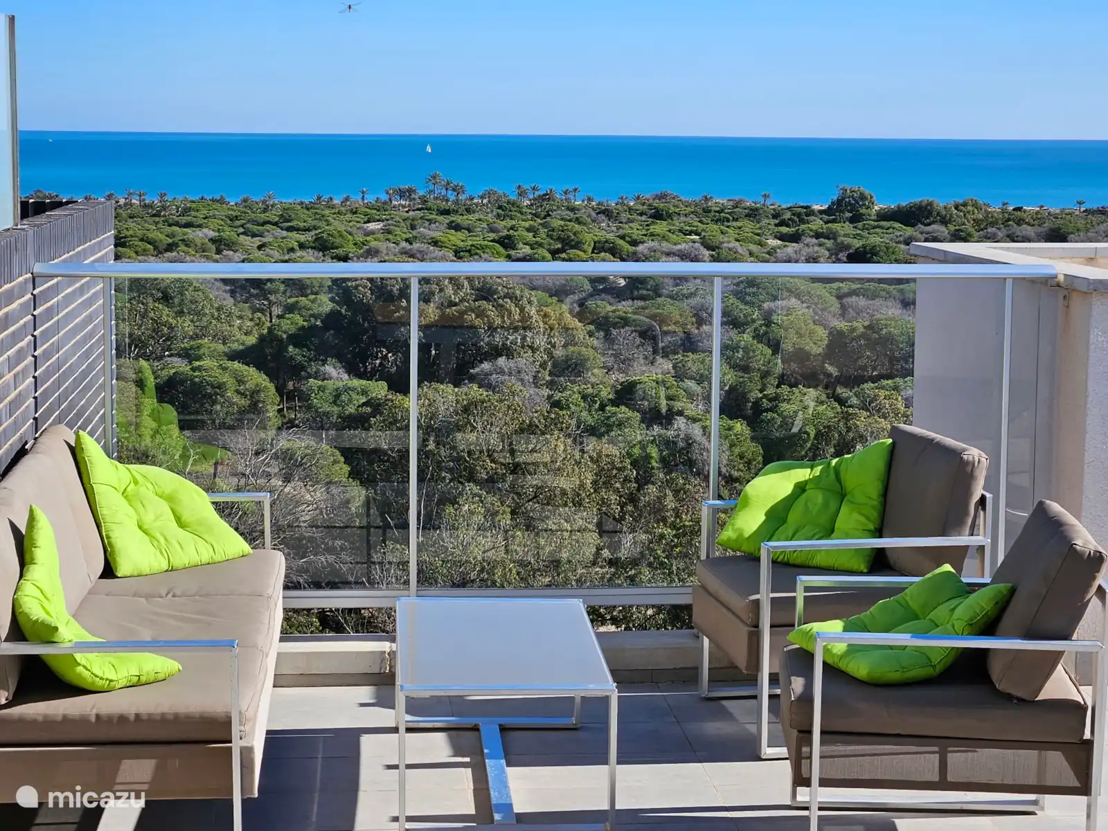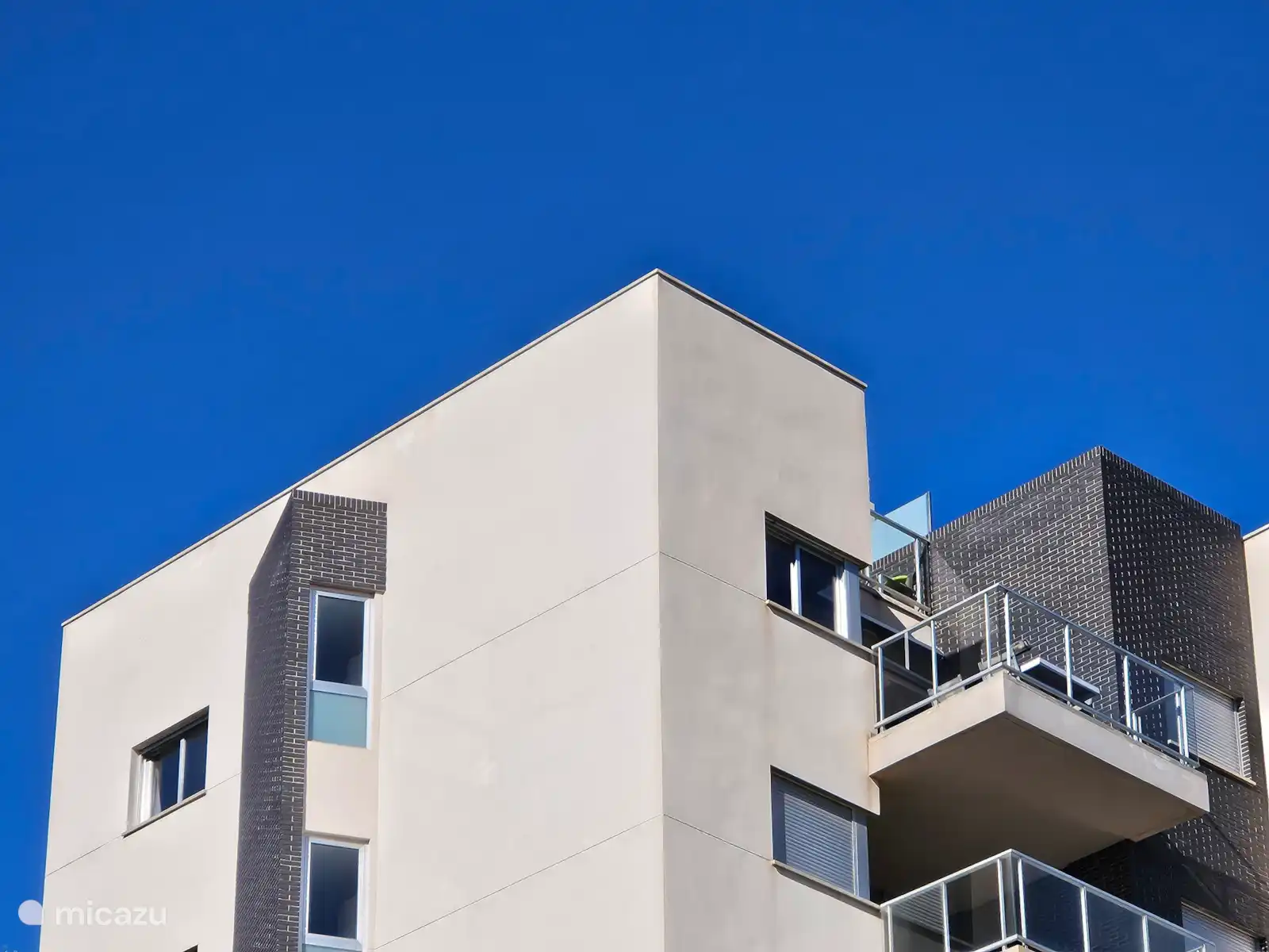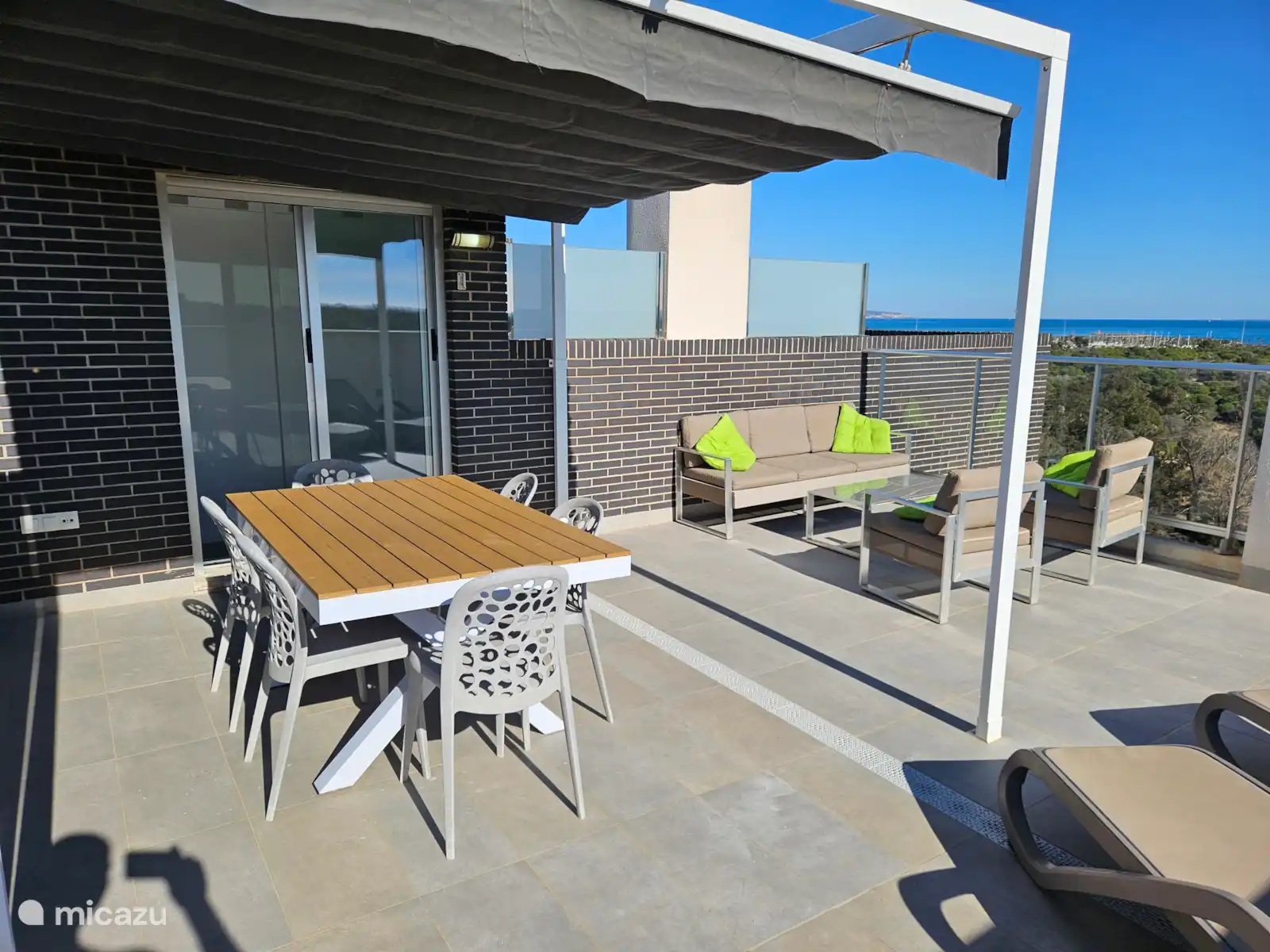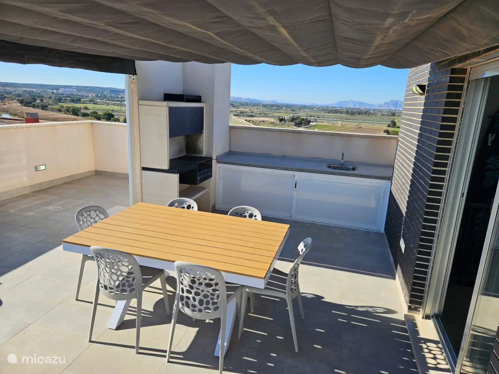 🌴 Depuis l’appartement et la vaste terrasse privée sur le toit, on regarde le soleil levant sur la mer Méditerranée et le parc de palmiers à l’avant, ainsi que l’arrière-pays avec la rivière Segura et le soleil couchant derrière les montagnes à l’arrière.