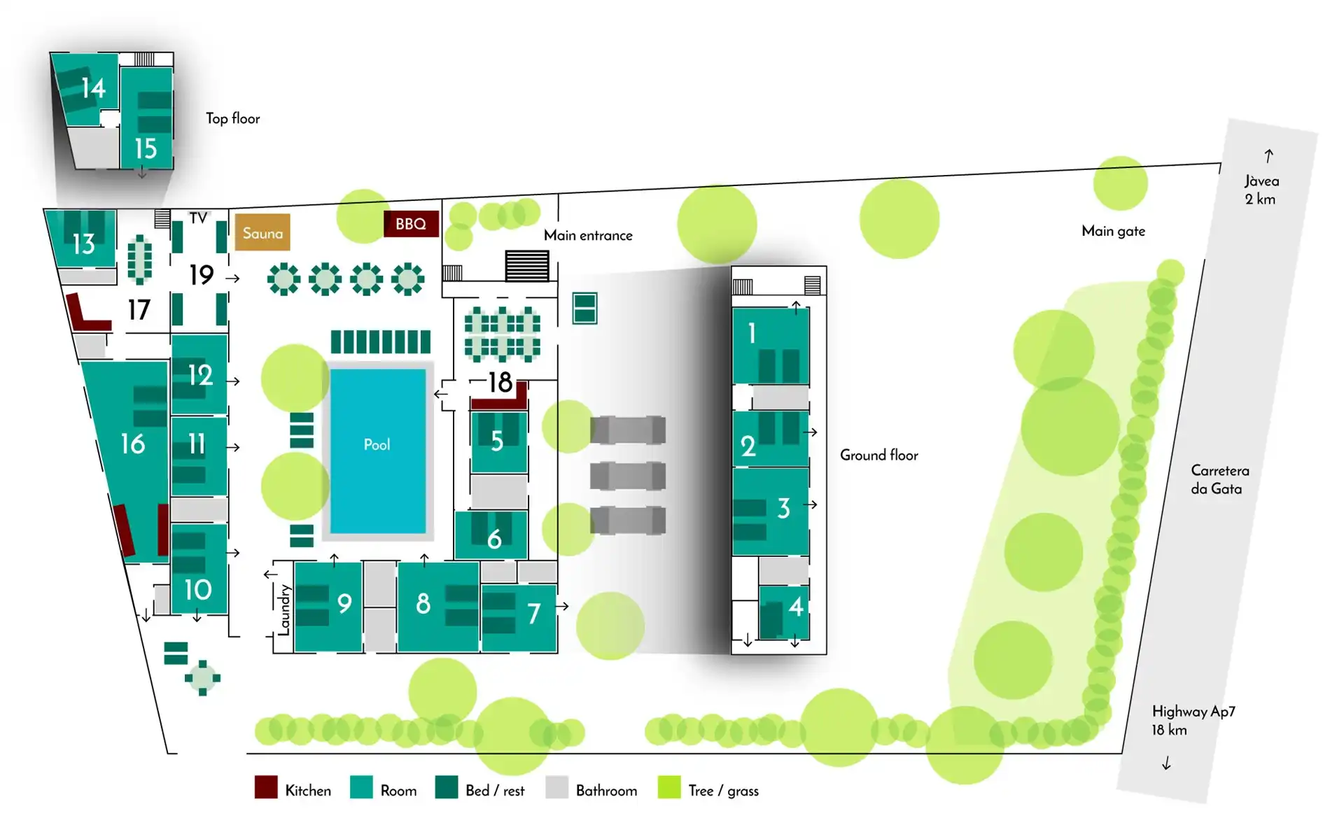 Les 15 chambres de La Finca sont toutes climatisées, la vaste piscine chauffée est accessible par un escalier et, en option, vous pouvez utiliser le sauna.