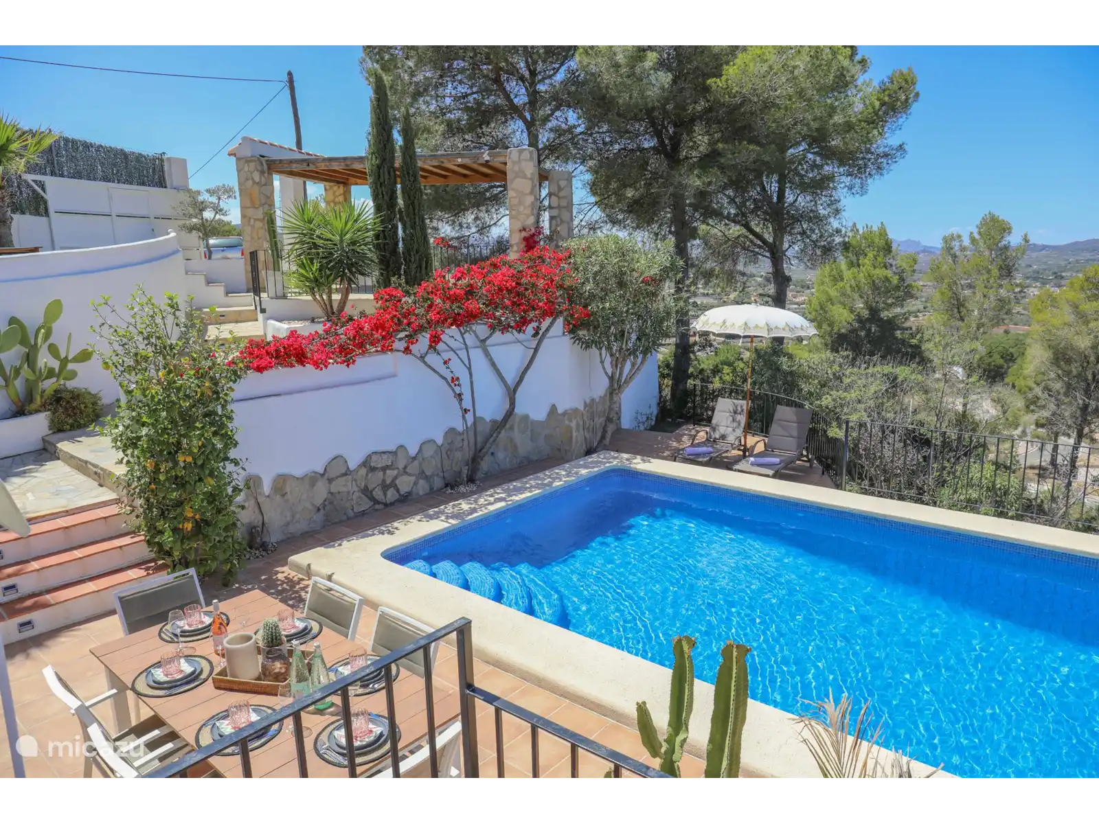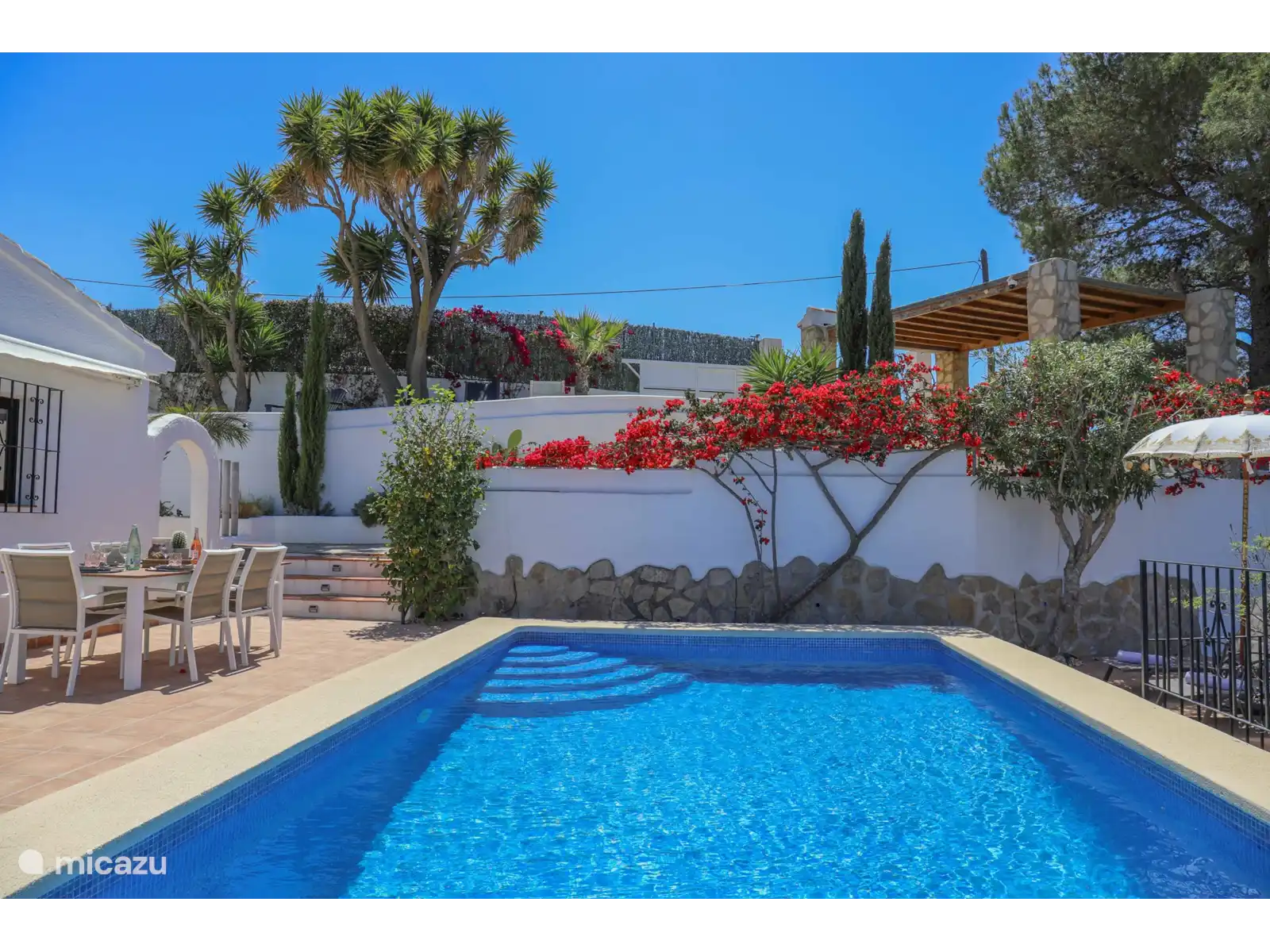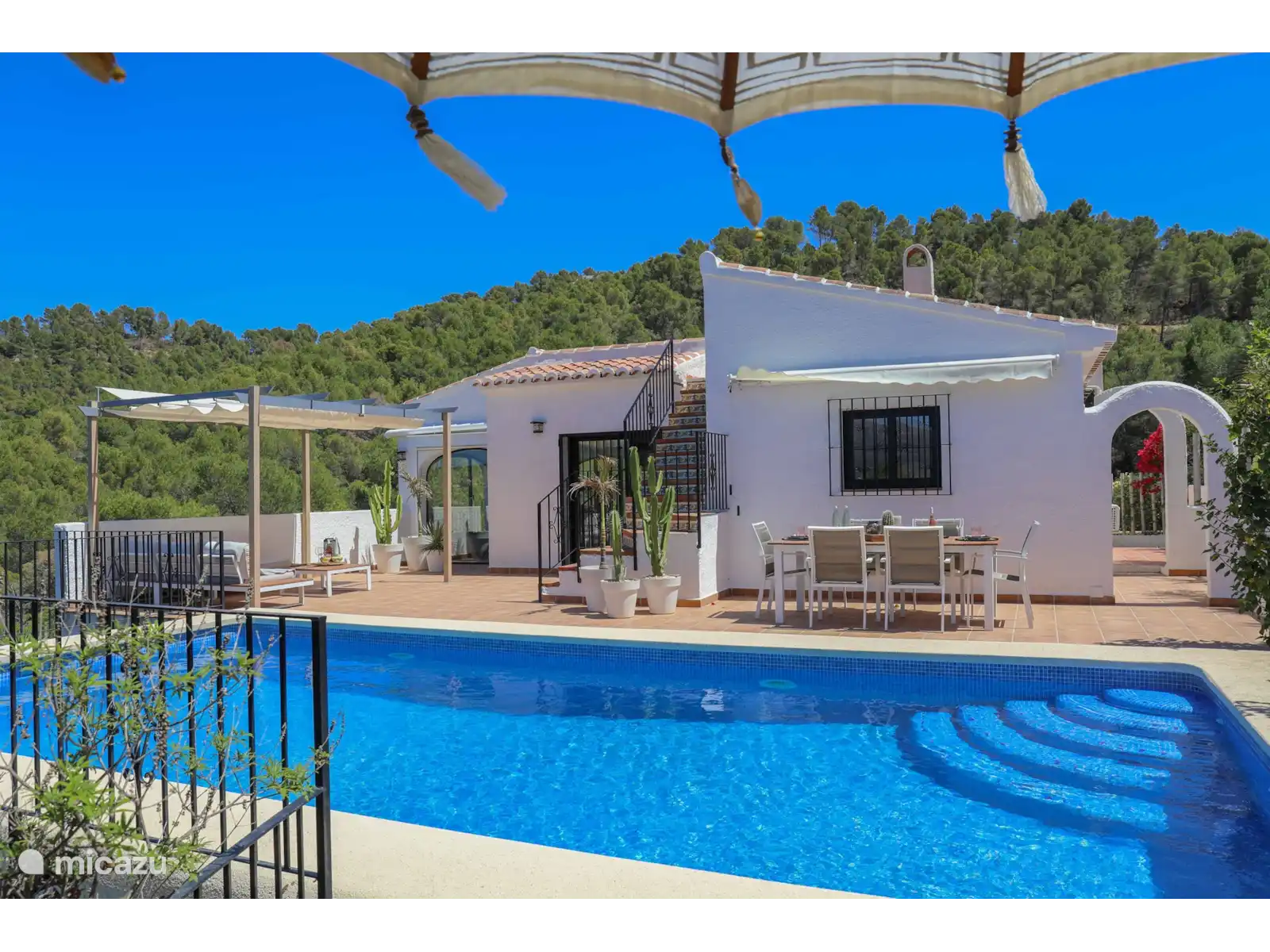 L’extérieur à Villa Montgo est parfait. Cette belle villa doit son nom à la vue phénoménale sur les montagnes du Montgo. La Villa Montgo dispose d’une charmante piscine privée (8 x 4 m - 2 m de profondeur) avec des transats tout autour où l’on peut profiter des chaudes journées d’été. De plus, vous disposez d’un joli salon à l’extérieur avec un baldaquin (visible sur les dernières photos) et une table à manger où vous pouvez dîner.