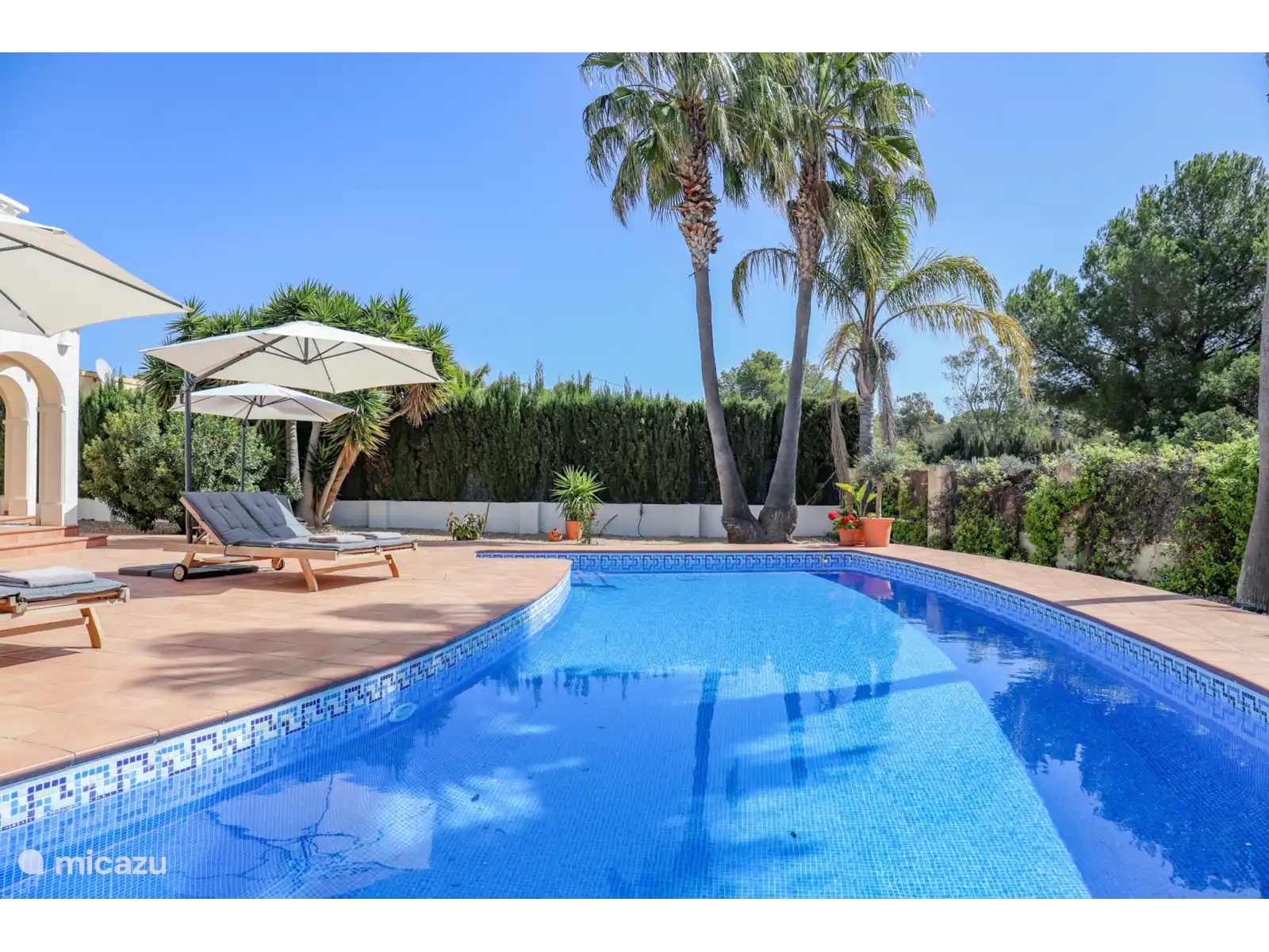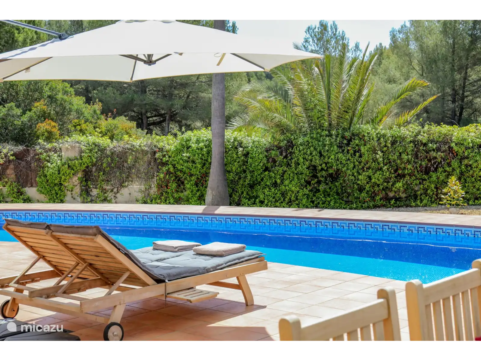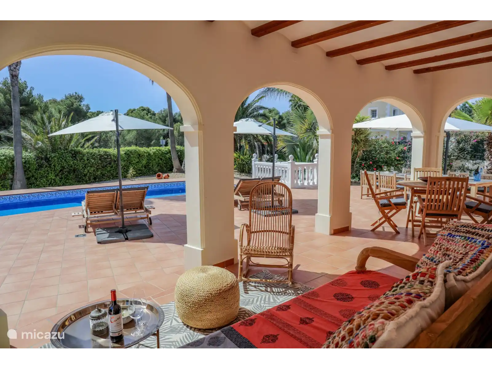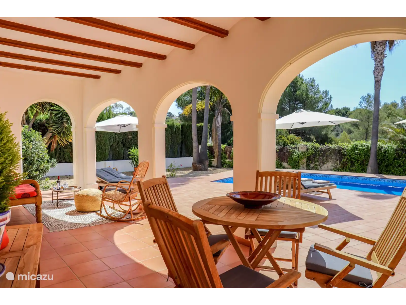 Depuis le salon, des doubles portes coulissantes donnent accès au vaste porche/naya, avec un coin salon/salon et une table à manger séparée pour environ 4 personnes. Un bel endroit avec vue sur le magnifique et spacieux jardin paysager avec une grande piscine privée (13x4 m et 2 m de profondeur). Sur la grande terrasse autour de la piscine, il y a 8 transats en teck avec des coussins confortables.