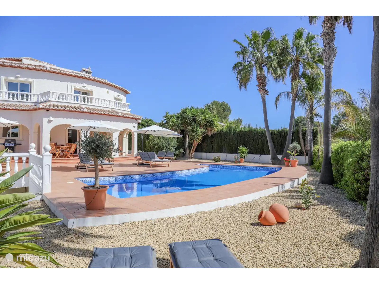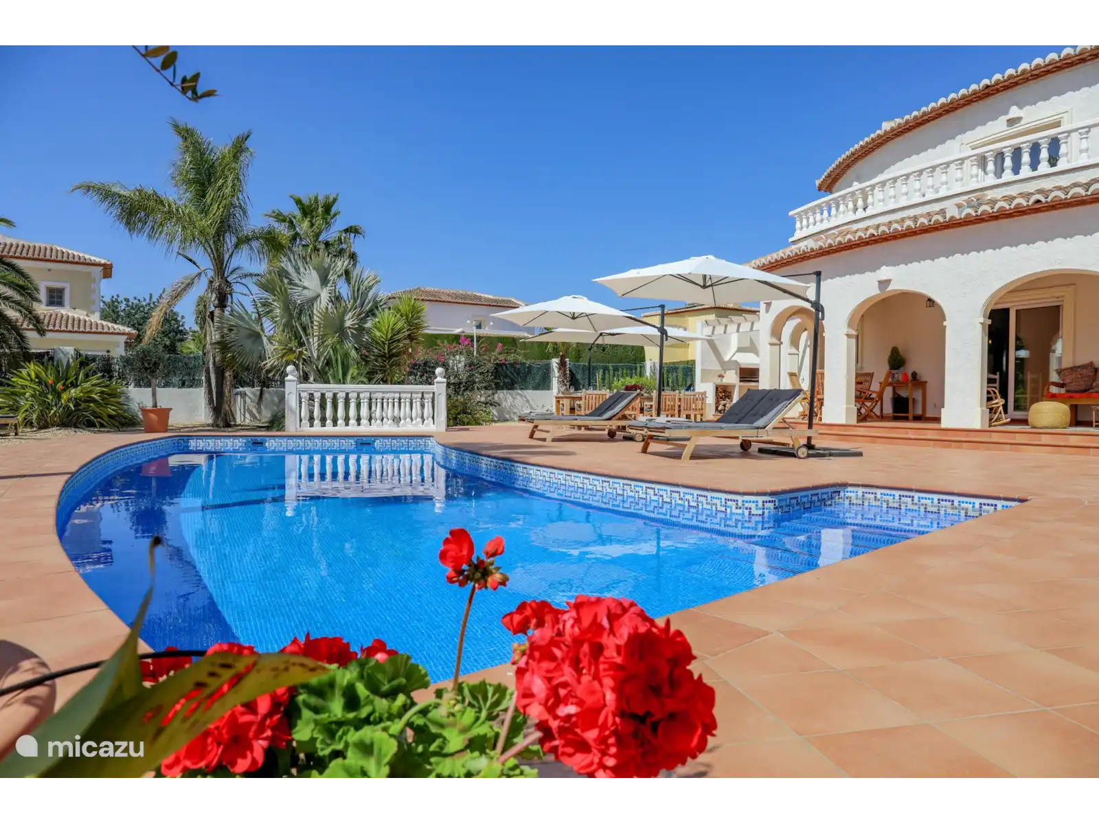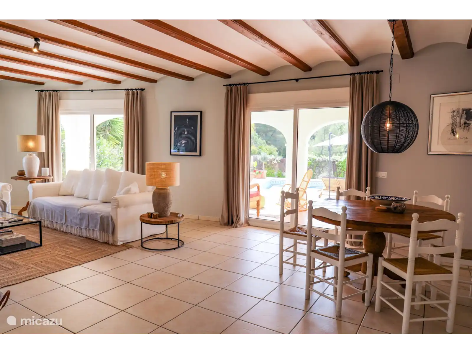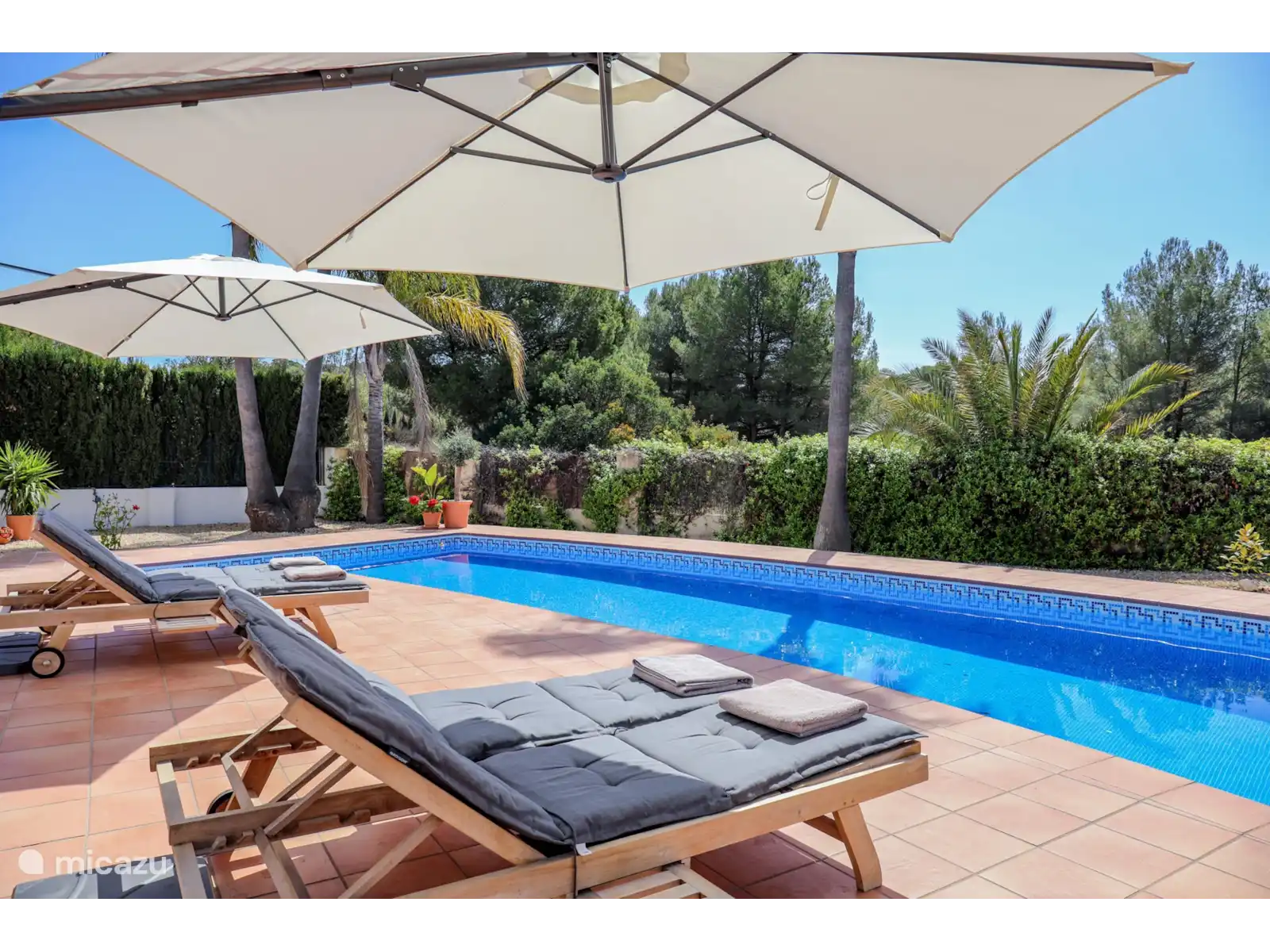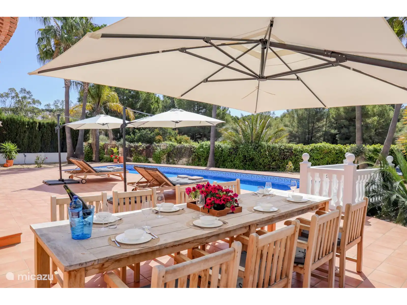 Depuis le salon, des doubles portes coulissantes donnent accès au vaste porche/naya, avec un coin salon/salon et une table à manger séparée pour environ 4 personnes. Un bel endroit avec vue sur le magnifique et spacieux jardin paysager avec une grande piscine privée (13x4 m et 2 m de profondeur). Sur la grande terrasse autour de la piscine, il y a 8 transats en teck avec des coussins confortables.