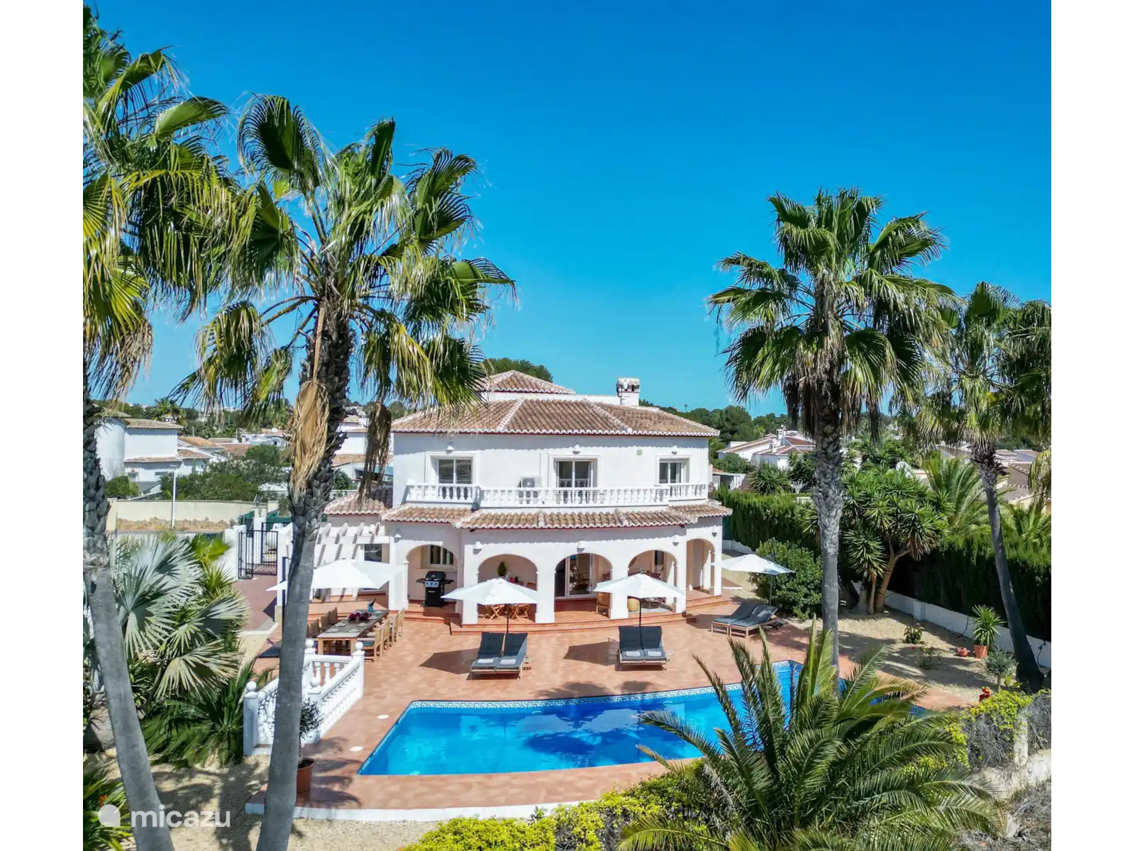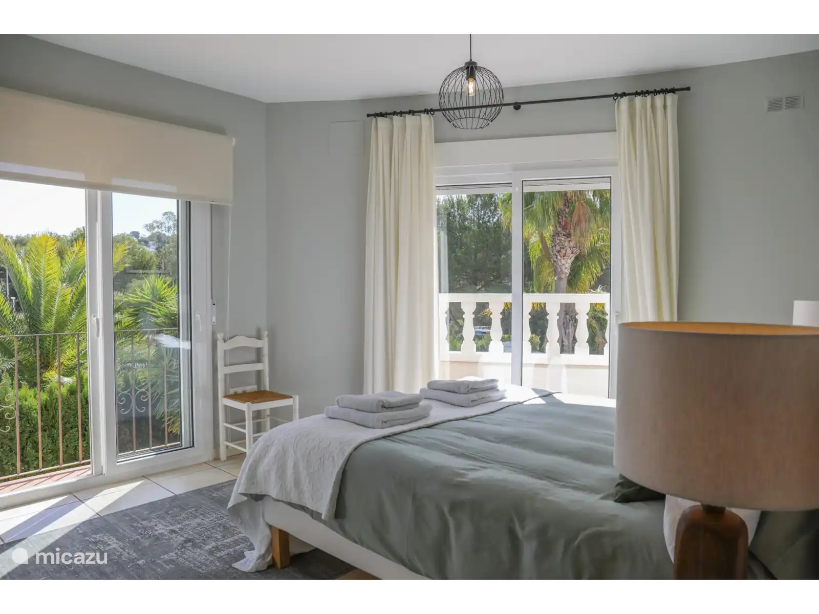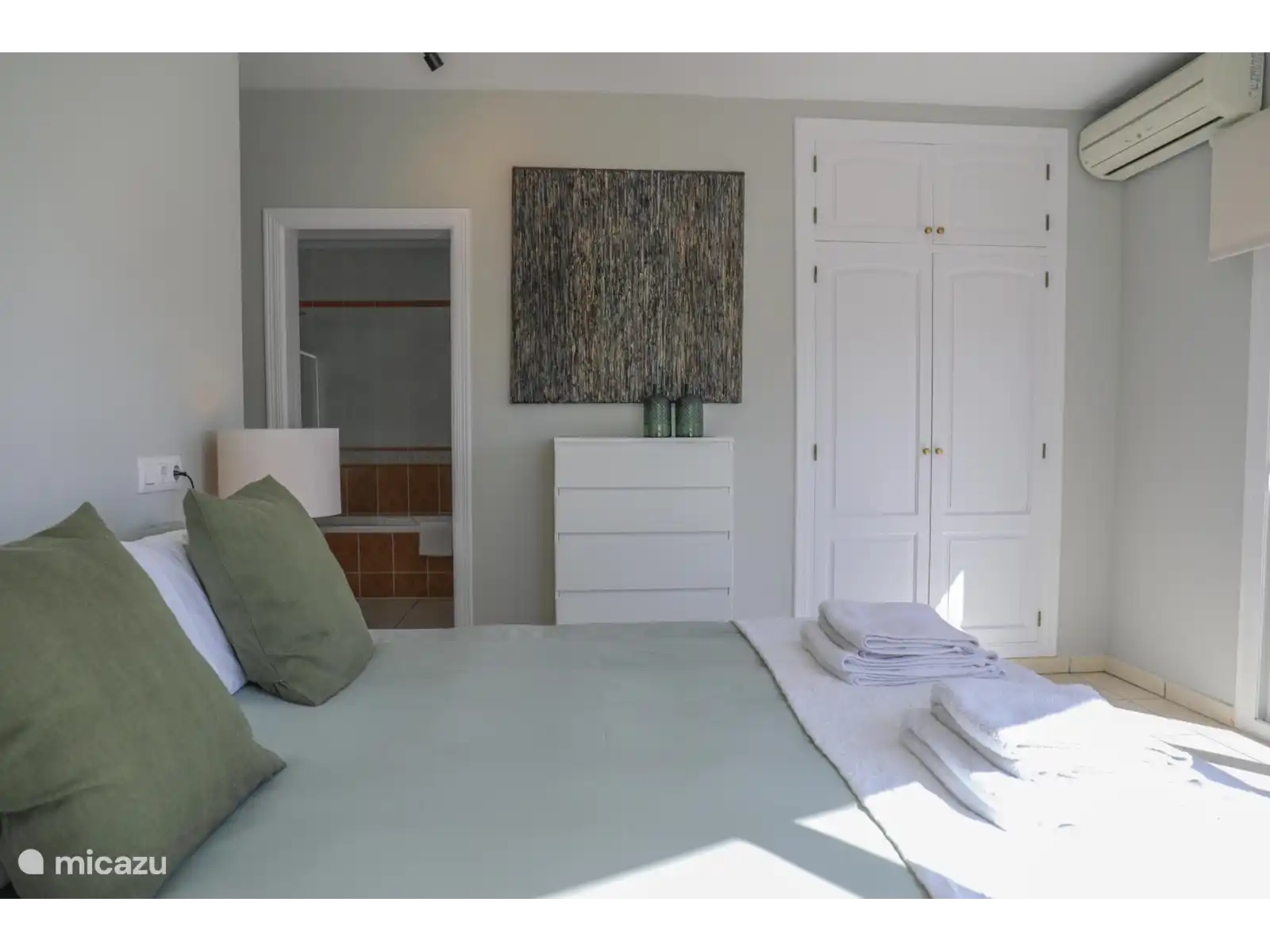 Par les escaliers du palier on atteint le rez-de-chaussée avec 3 chambres supplémentaires. Il y a une chambre spacieuse avec un lit double (160x200cm) et une salle de bain attenante avec baignoire et toilettes. Chambre 3 : un lit double (160x200cm) et chambre 4 : un lit double (140x200cm). Les chambres 3 et 4 partagent la troisième salle de bain avec toilettes et douche. Ces chambres ont toutes accès à un grand balcon/terrasse qui donne sur le jardin avec piscine. Tous les lits sont de bonne qualité. Les chambres sont toutes équipées de moustiquaires aux fenêtres et sont climatisées.