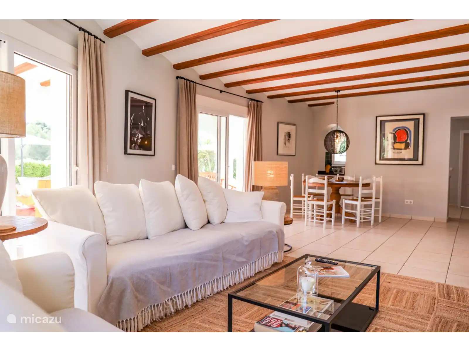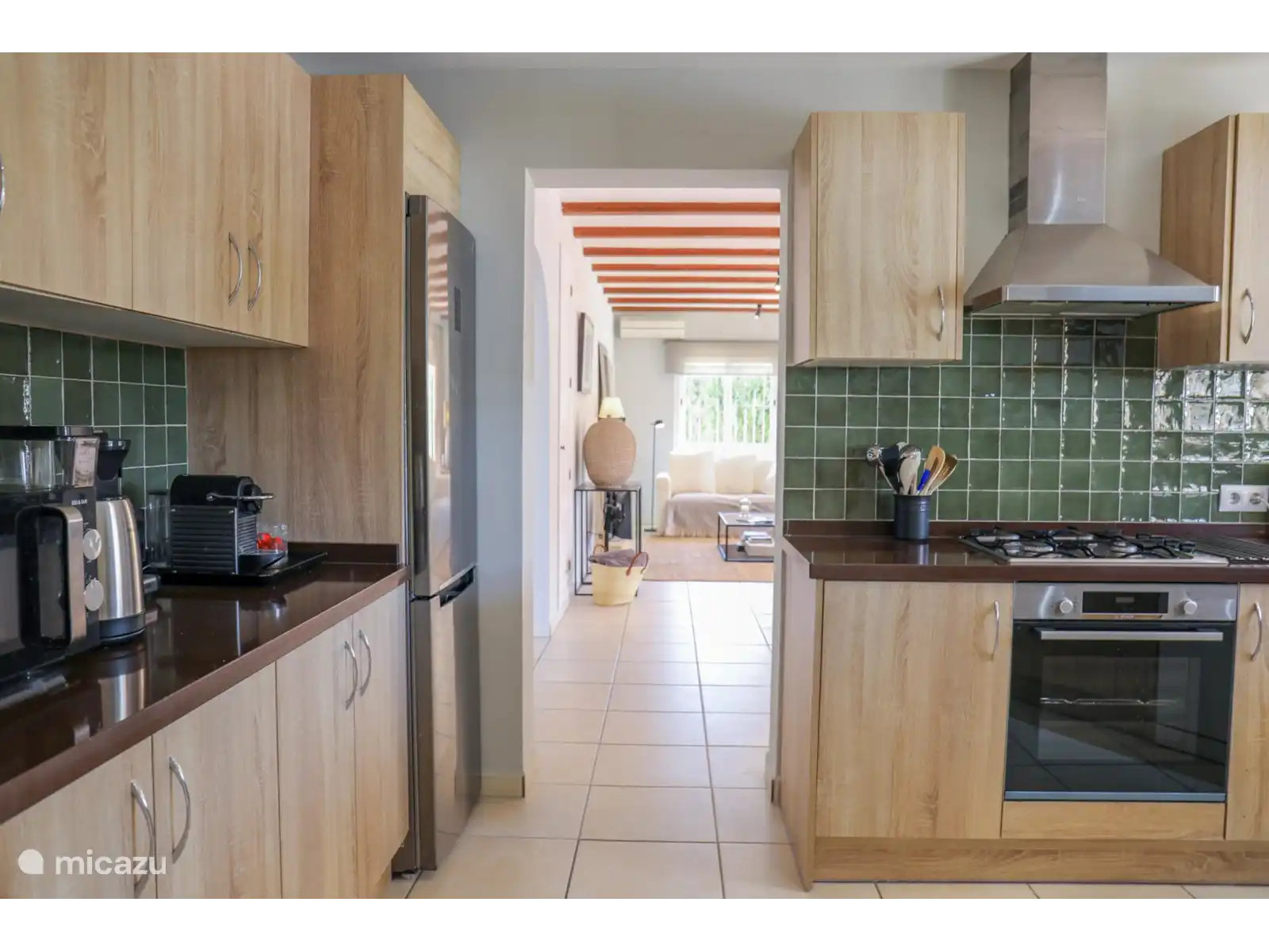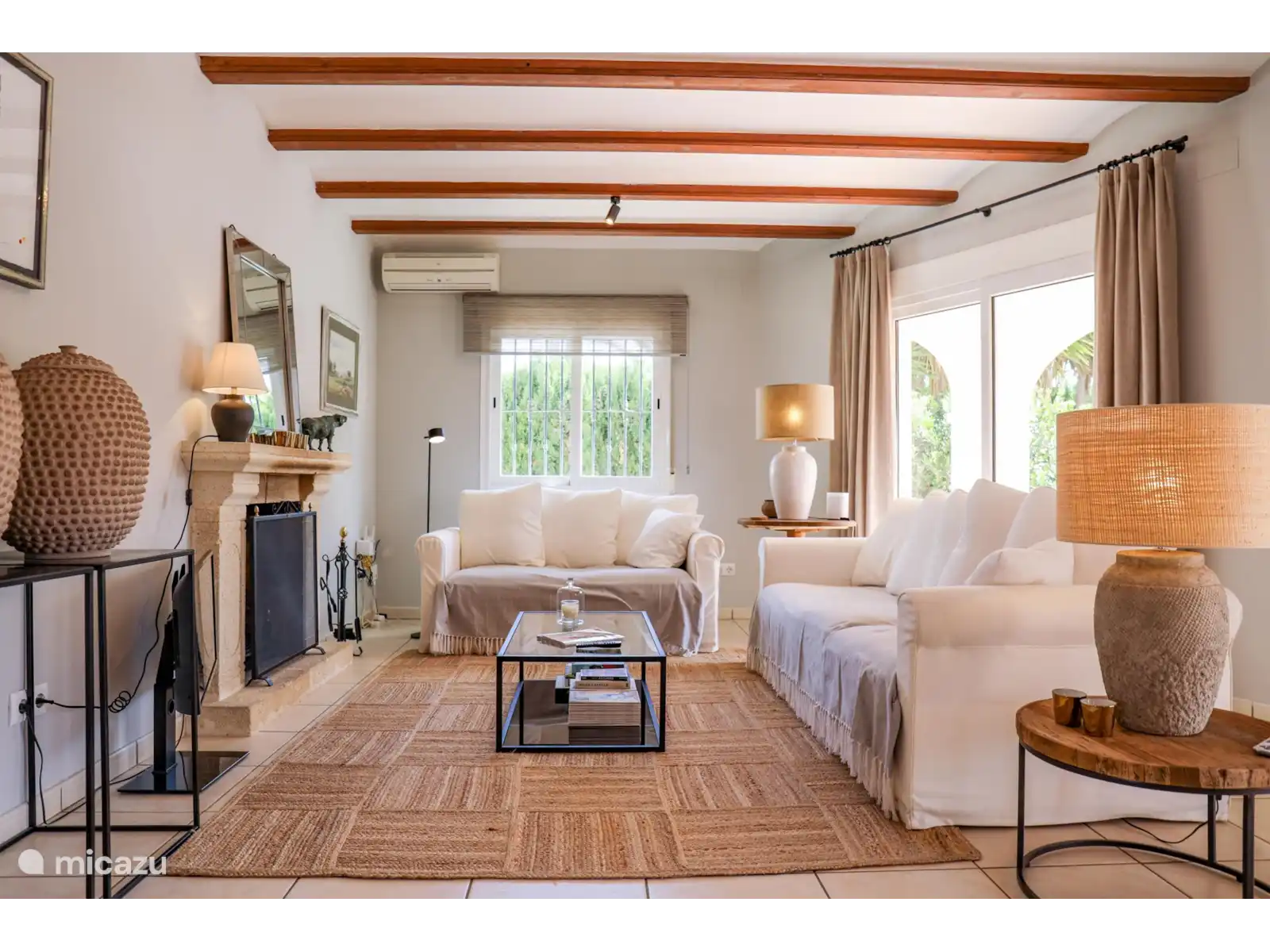 Par l’entrée d’une tour avec escalier de palier et mezzanine, on entre dans le salon-salle à manger chaleureux à la décoration raffinée dans des tons clairs, avec un coin salon confortable, une cheminée et une télévision intelligente. Sur le côté droit de cette pièce se trouve la grande table ronde à manger qui est (partiellement) ouverte en lien avec la cuisine. La cuisine est équipée de tous les appareils possibles tels que le four, le lave-vaisselle, le micro-ondes, la plaque à gaz à 4 brûleurs, le réfrigérateur et le congélateur, le filtre à café et la machine Nespresso. À côté se trouve la buanderie avec une machine à laver/sèche-linge, qui donne accès à la terrasse avec l’espace barbecue. Le salon est climatisé.