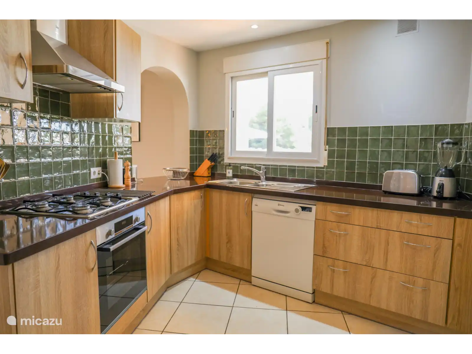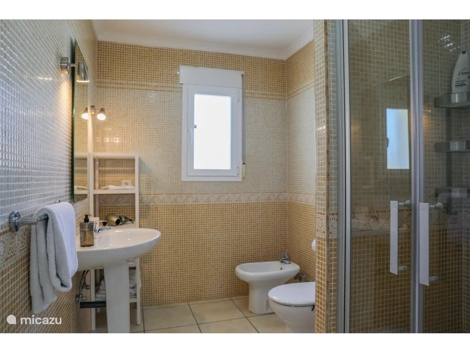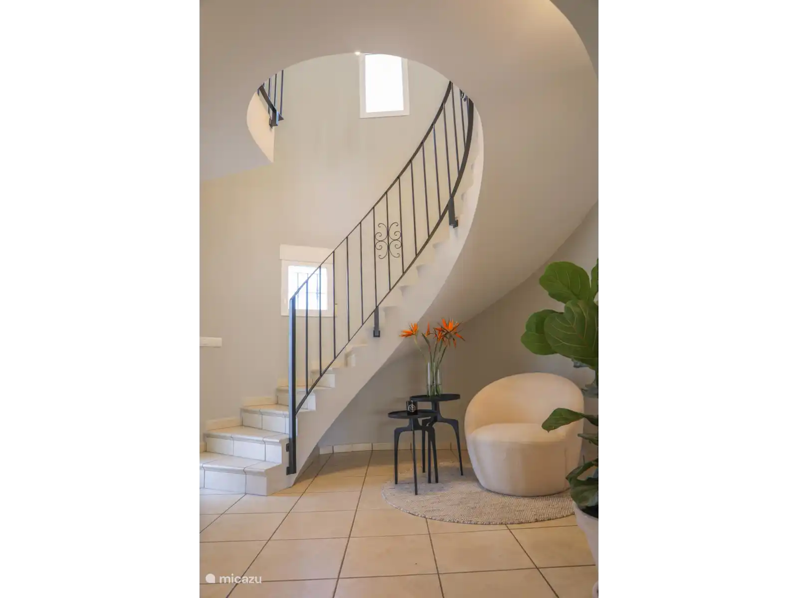 Par l’entrée d’une tour avec escalier de palier et mezzanine, on entre dans le salon-salle à manger chaleureux à la décoration raffinée dans des tons clairs, avec un coin salon confortable, une cheminée et une télévision intelligente. Sur le côté droit de cette pièce se trouve la grande table ronde à manger qui est (partiellement) ouverte en lien avec la cuisine. La cuisine est équipée de tous les appareils possibles tels que le four, le lave-vaisselle, le micro-ondes, la plaque à gaz à 4 brûleurs, le réfrigérateur et le congélateur, le filtre à café et la machine Nespresso. À côté se trouve la buanderie avec une machine à laver/sèche-linge, qui donne accès à la terrasse avec l’espace barbecue. Le salon est climatisé.