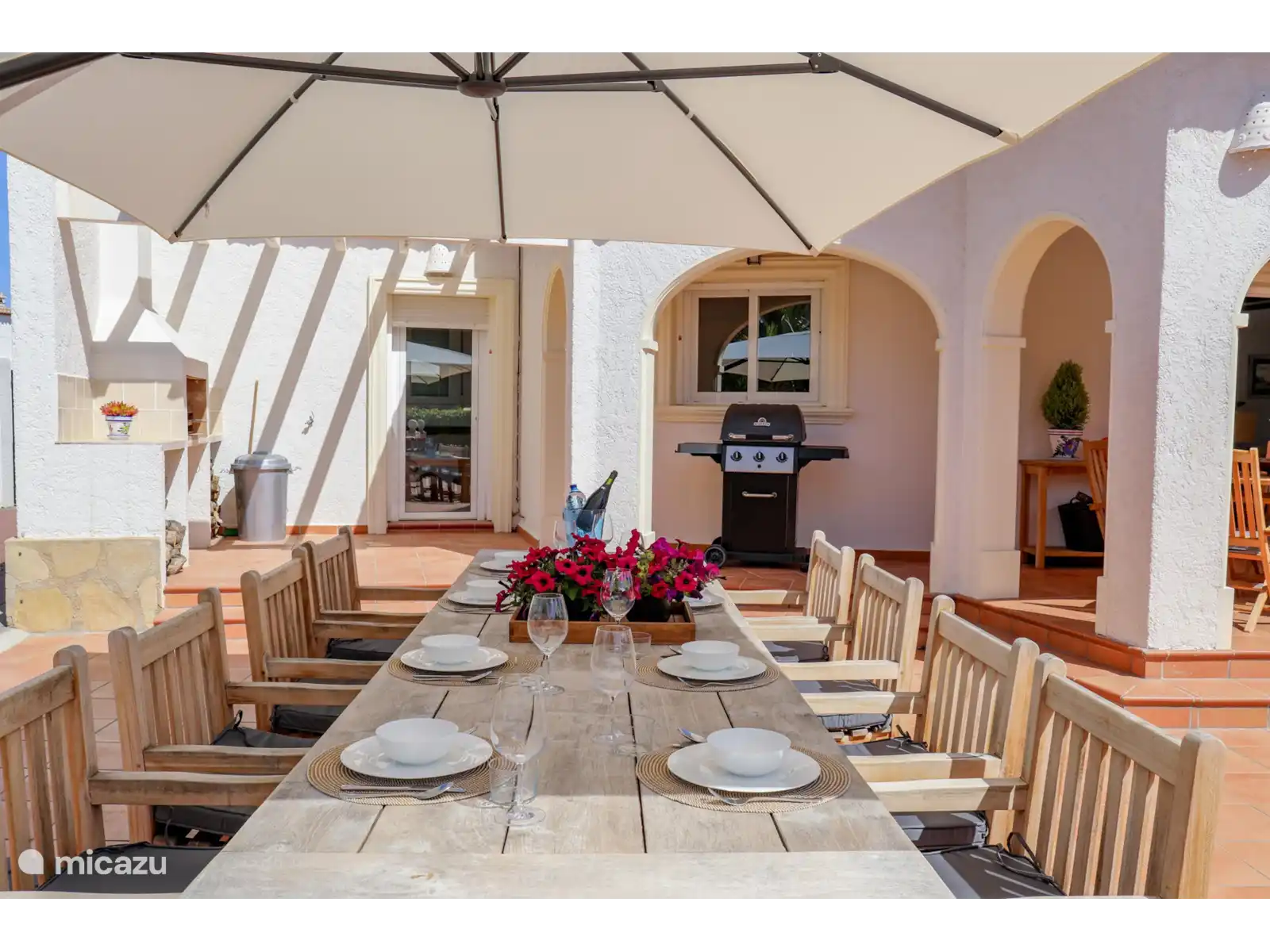 La grande table à manger en teck de 3 m de long avec 8 chaises et parasol est un endroit merveilleux pour dîner ensemble pendant longtemps. Si vos vacances et votre barbecue vont toujours ensemble, alors vous êtes au bon endroit, il y a un barbecue à essence de Broil King.