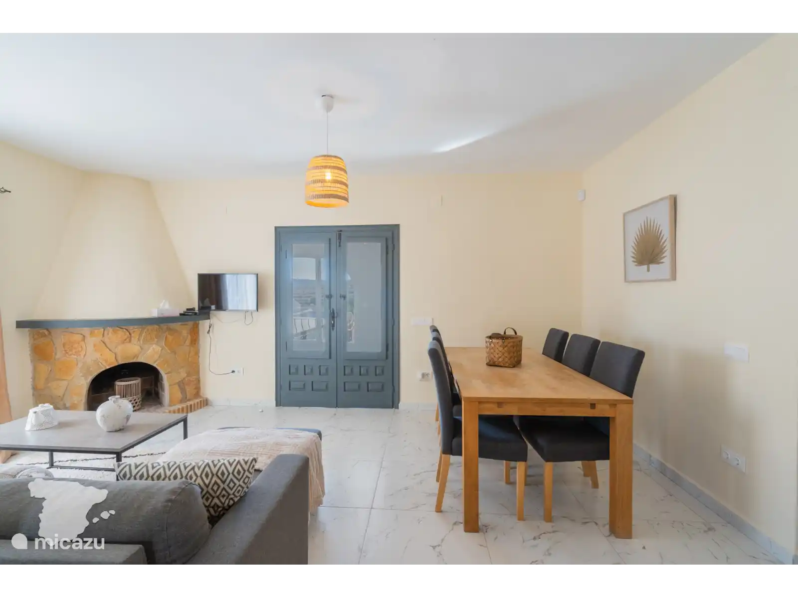 La maison principale est située à l’étage supérieur et dispose d’un salon et d’une salle à manger spacieux et décloisonnés, idéal pour les réunions avec vos proches. La cuisine entièrement équipée, dotée d’équipements tels qu’un réfrigérateur, un congélateur, un four, une plaque de cuisson à induction, un lave-vaisselle, une bouilloire et une cafetière, assure une préparation sans effort des repas pendant votre séjour. À côté du salon se trouve une grande terrasse couverte avec une vue magnifique sur la vallée, idéale pour profiter de beaux couchers de soleil.