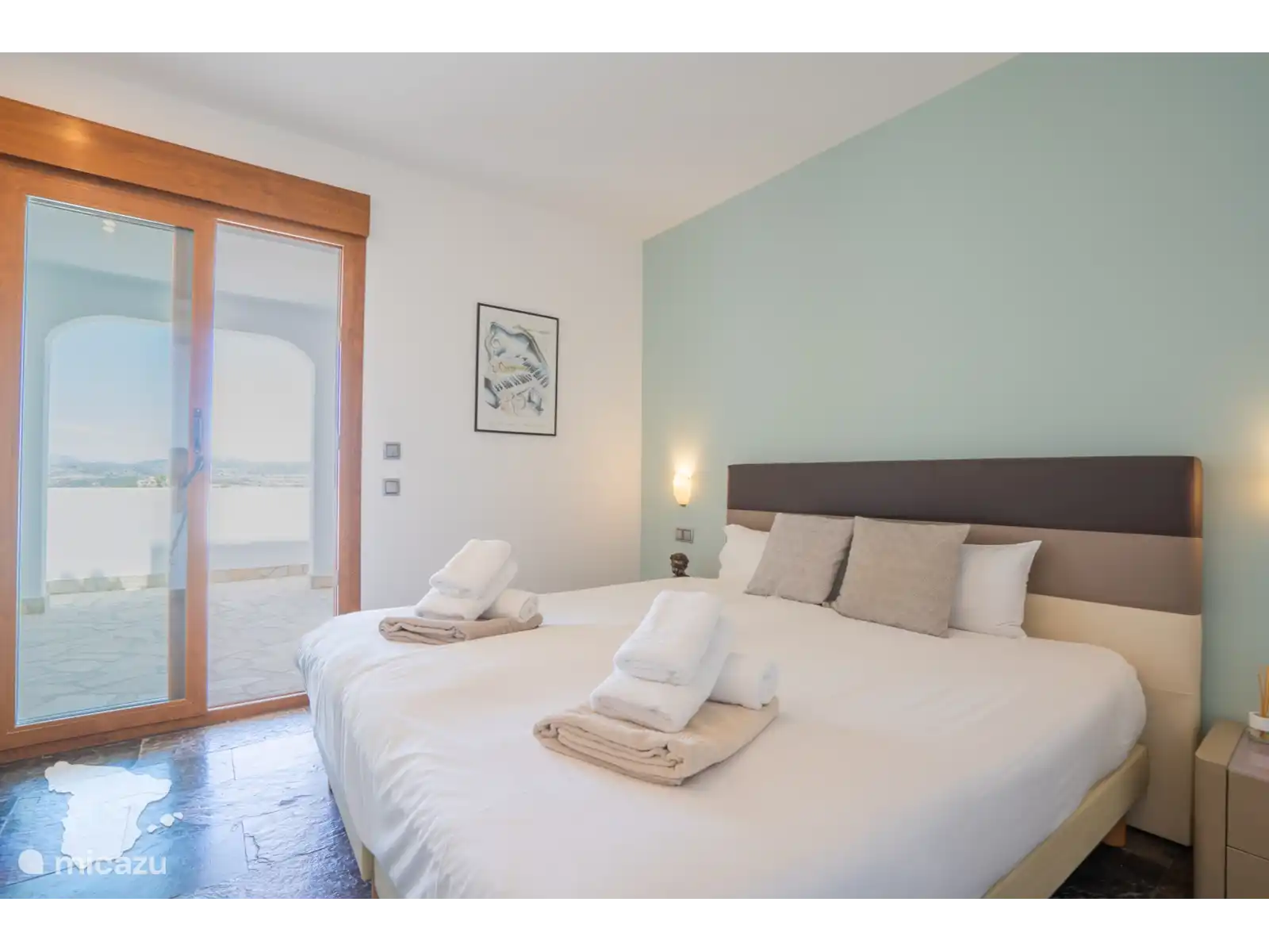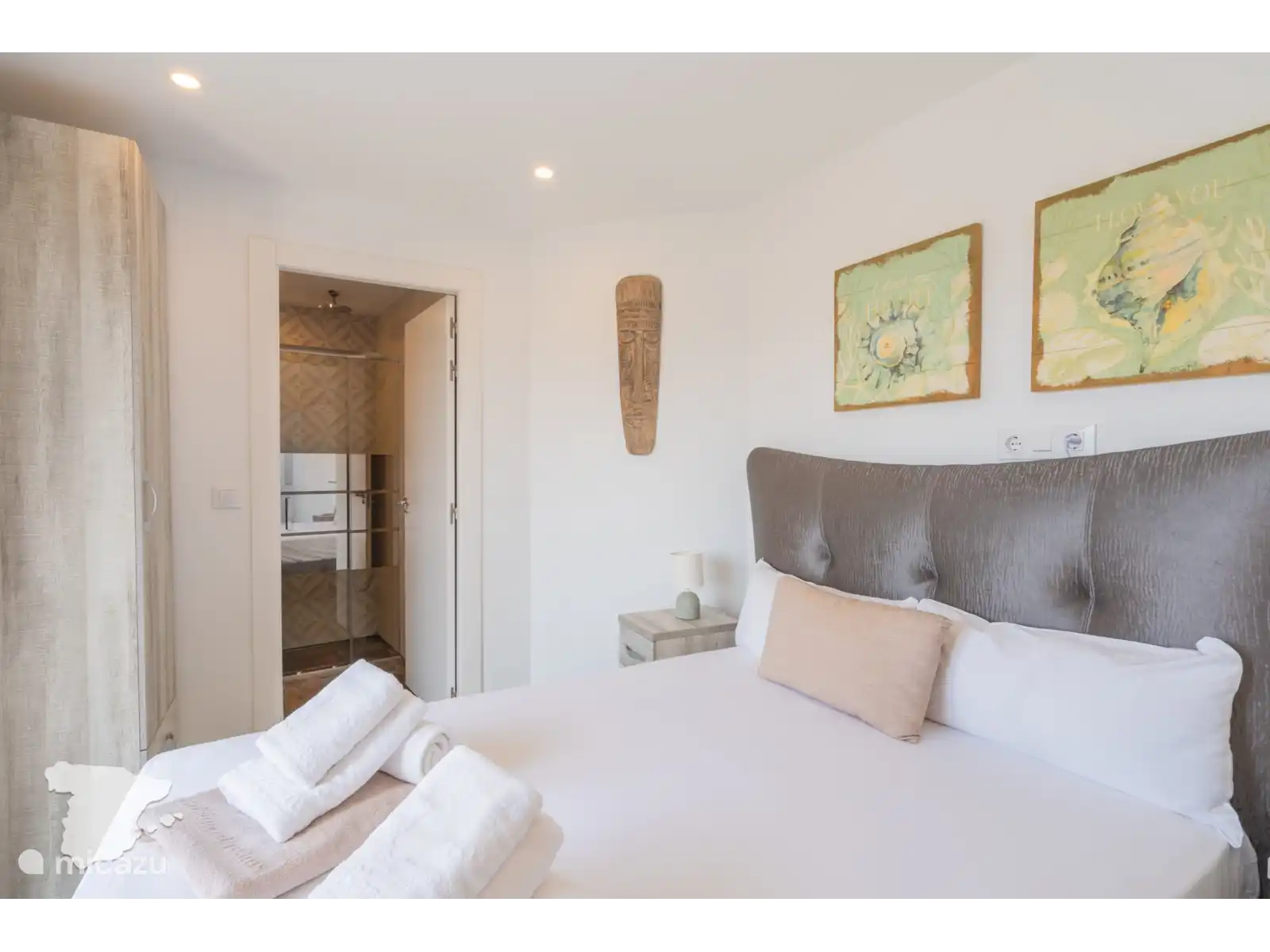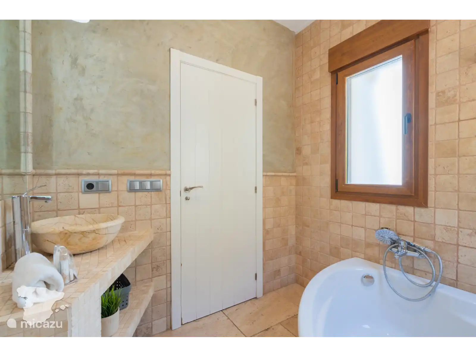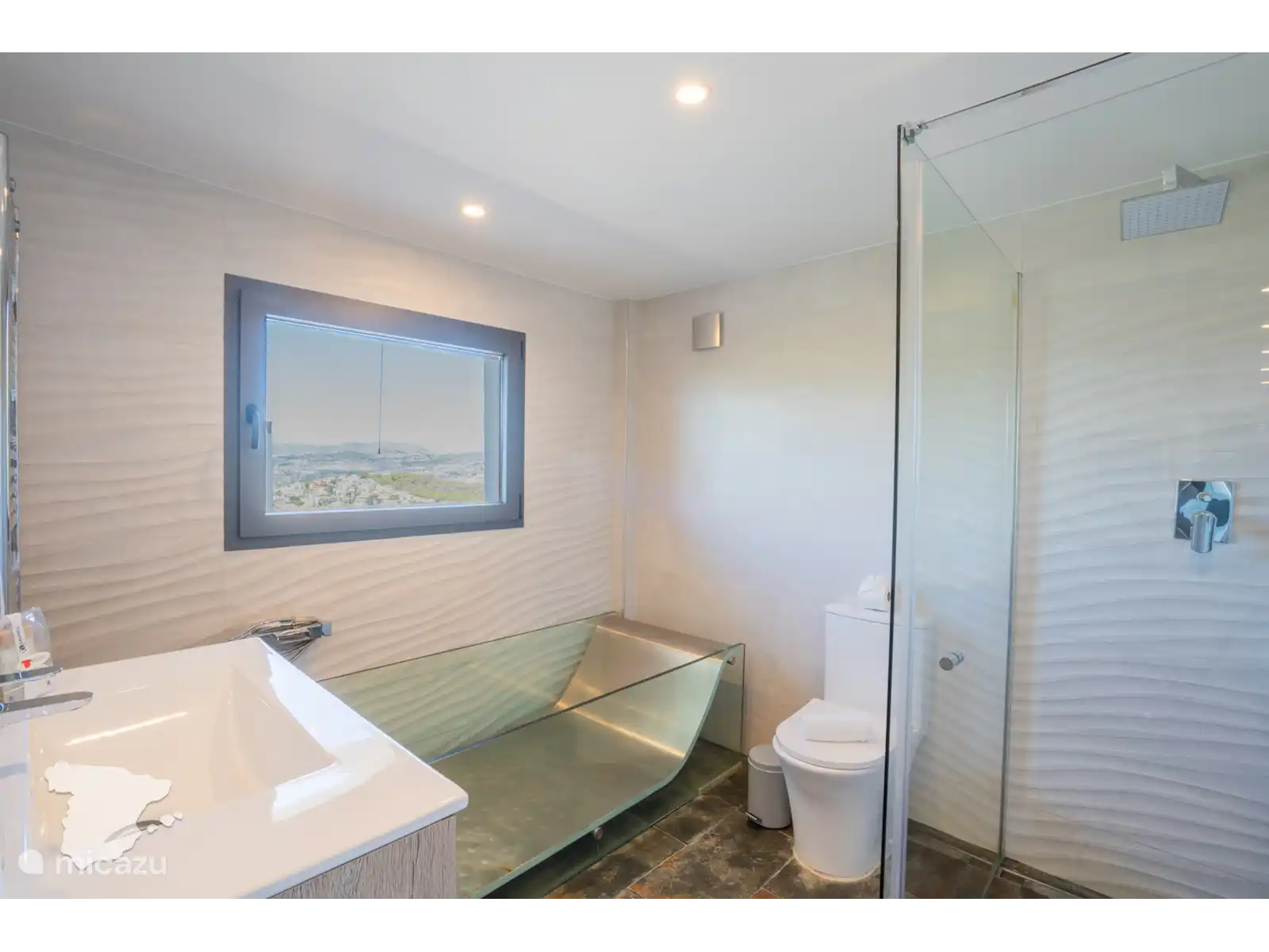 Niveau intermédiaire : un salon et une salle à manger décloisonnés avec télévision et un confortable canapé 6 places. De là, vous avez un accès direct à la piscine extérieure et à la terrasse. Il y a aussi une cuisine entièrement équipée et des toilettes pour les invités. La chambre à ce niveau dispose d’un lit double et d’un balcon privé avec une vue à couper le souffle. La salle de bains séparée est pourvue d’une baignoire.