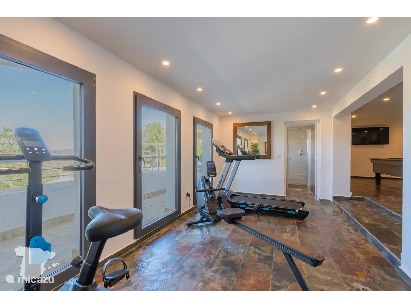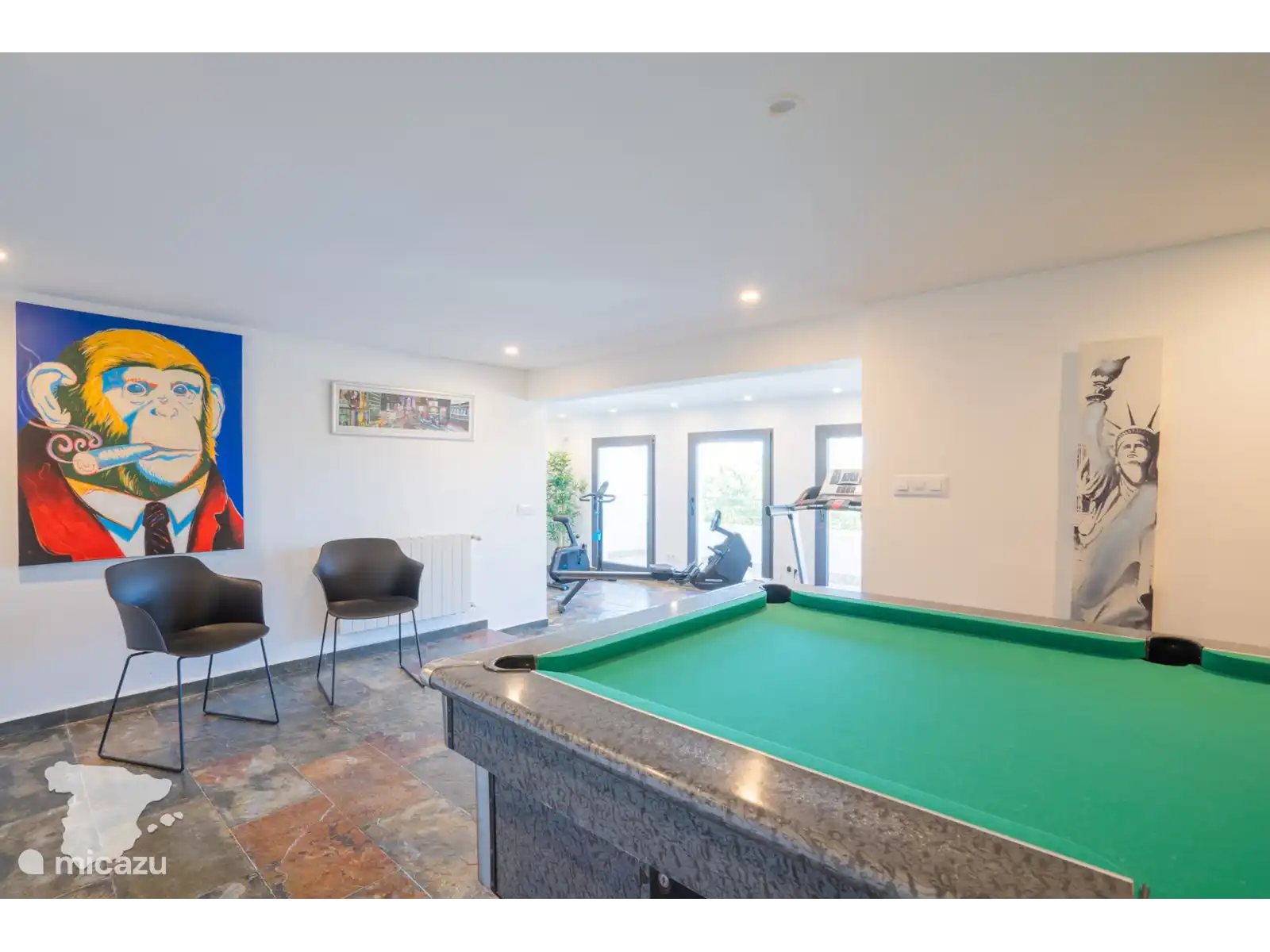 En dessous du niveau : l’endroit pour se détendre et profiter. Il y a un salon décloisonné avec une télévision et un canapé confortable pour se détendre. Il y a une salle de sport, une table de billard et une piscine intérieure (peut être chauffée sur demande, voir les conditions ci-dessous). Ce niveau dispose également de deux chambres, chacune avec un lit double, et d'1 salle de bain partagée.