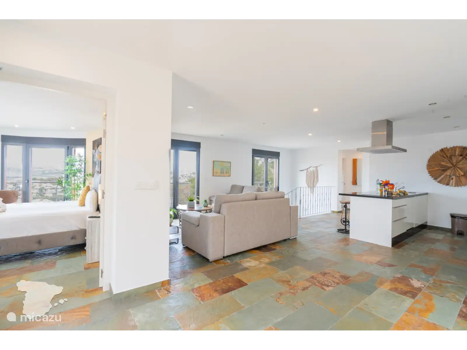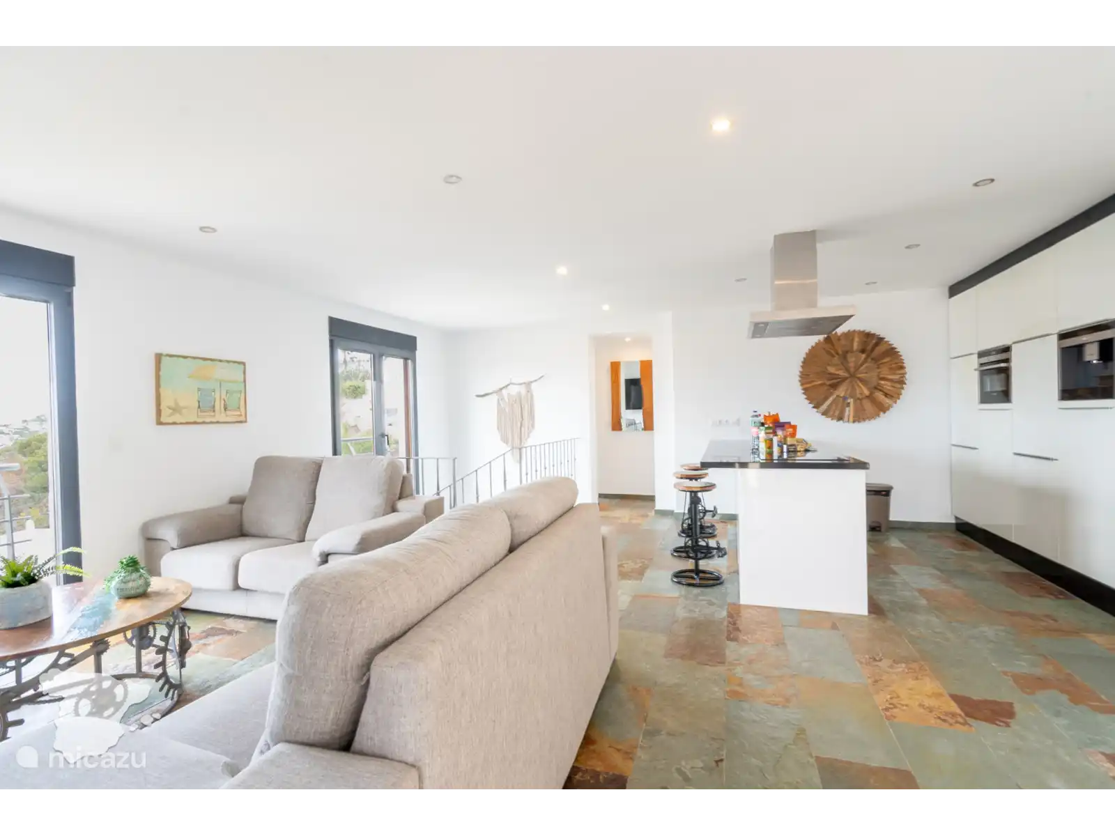 Niveau supérieur : un salon ouvert avec deux canapés et une télévision, ainsi qu’une cuisine entièrement équipée avec bar. Une chambre avec un lit double et une vue magnifique, et une salle de bain séparée.