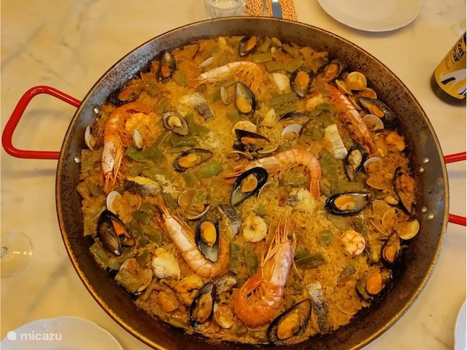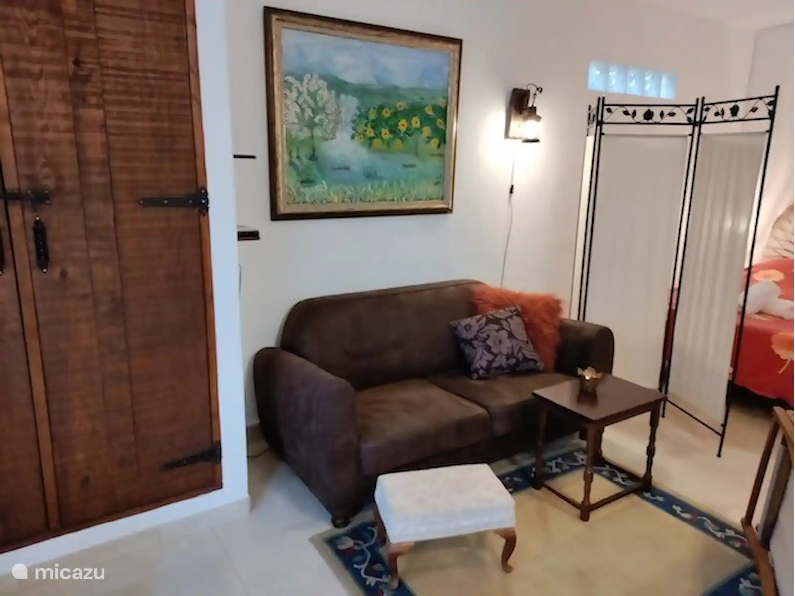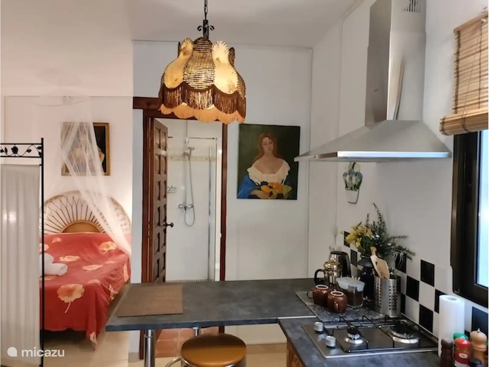 Dans le studio, vous pouvez utiliser le paravent existant entre le canapé et le lit. Les peintures à l'huile apportent un cachet supplémentaire et ont été sélectionnées avec amour pour évoquer un sentiment espagnol. Le bar attenant à la cuisine est spacieux et constitue un endroit agréable pour prendre un repas ou un verre. Le studio est spacieux, attrayant et vous invite à une agréable sensation de vacances.