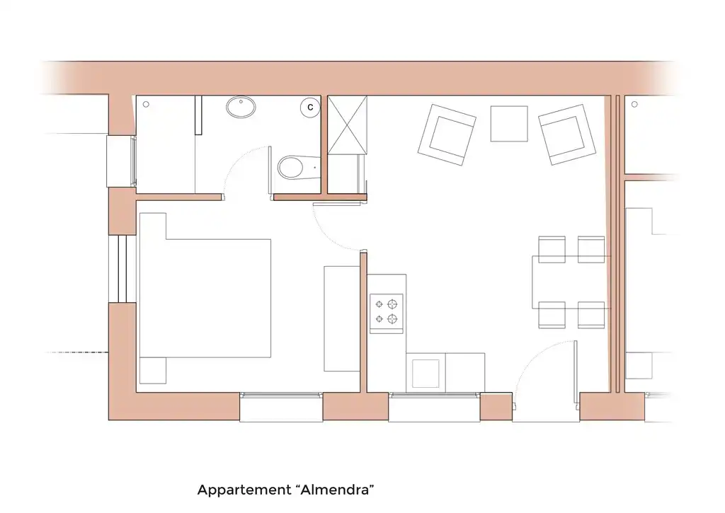 Appartement Almendra est autonome, dispose d'un salon avec cuisine. Une chambre avec des lits merveilleux et une salle de bain attenante. Almendra dispose d'une grande terrasse avec vue sur les montagnes. Ici, vous pouvez profiter du silence, des sons de la nature sur les transats et vous détendre complètement.