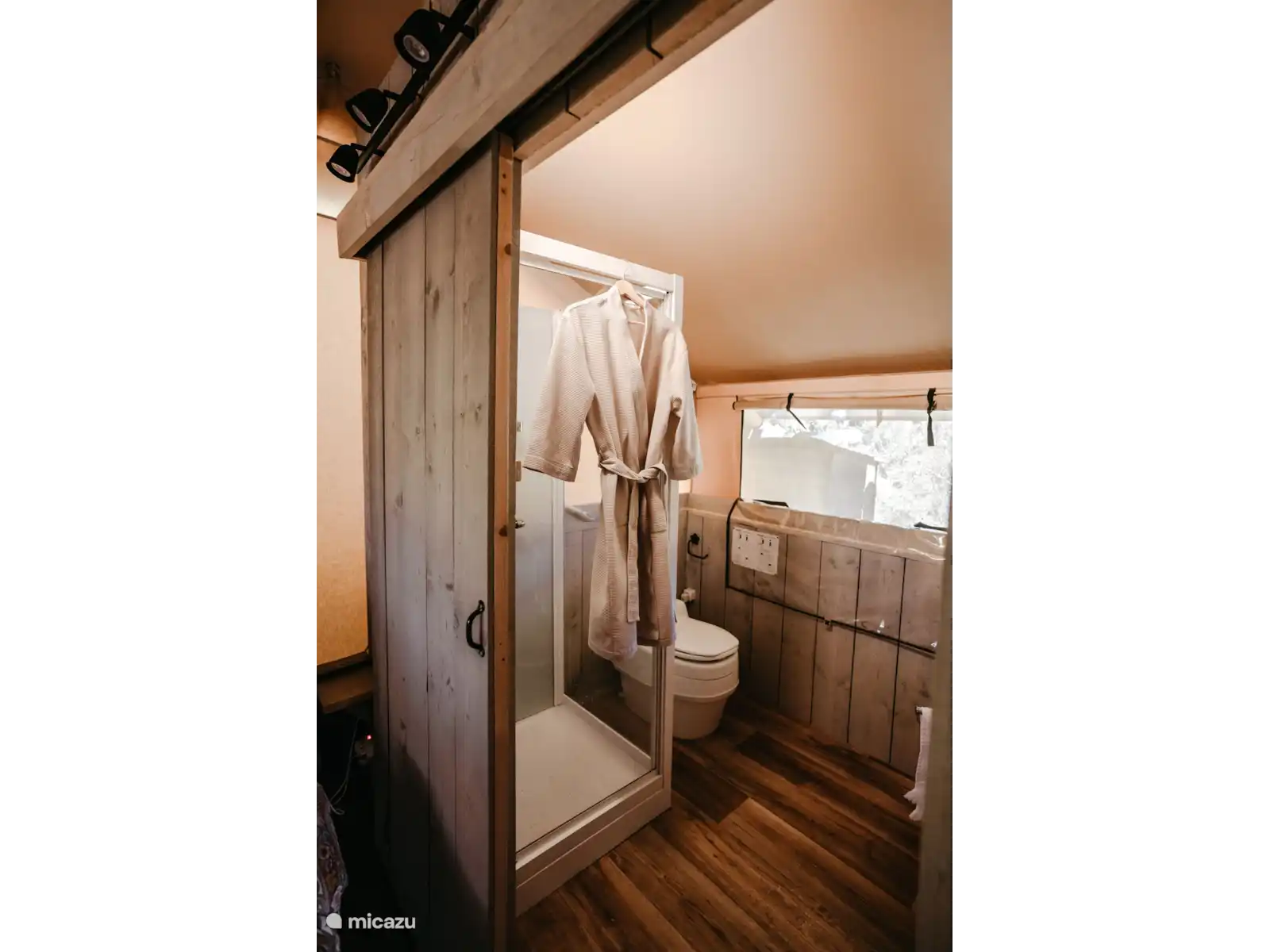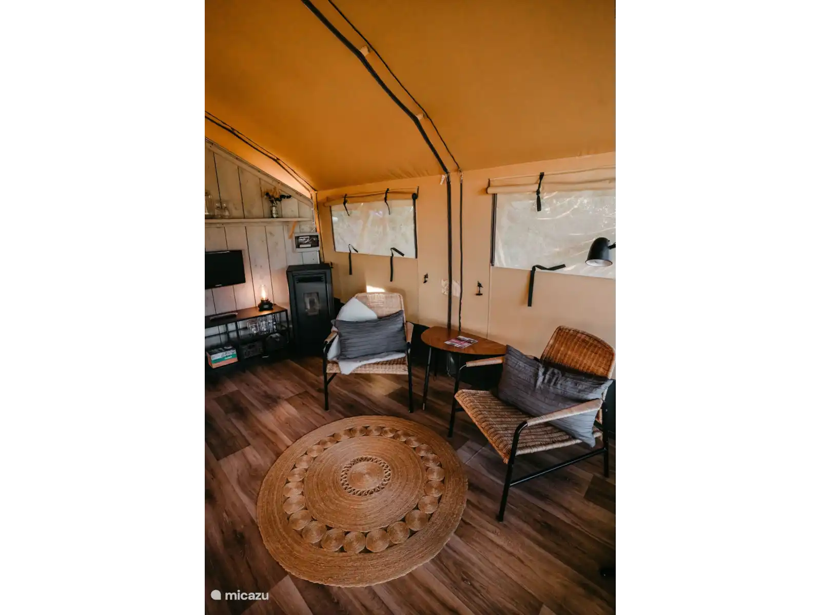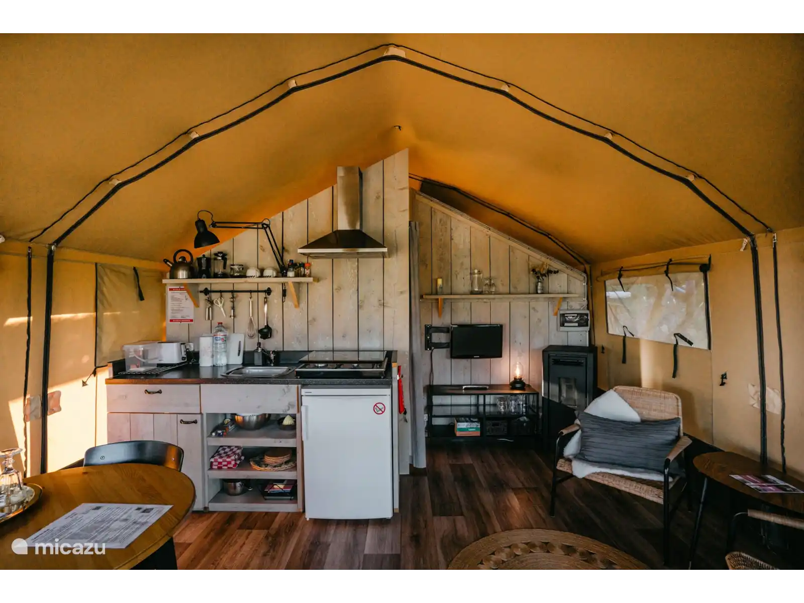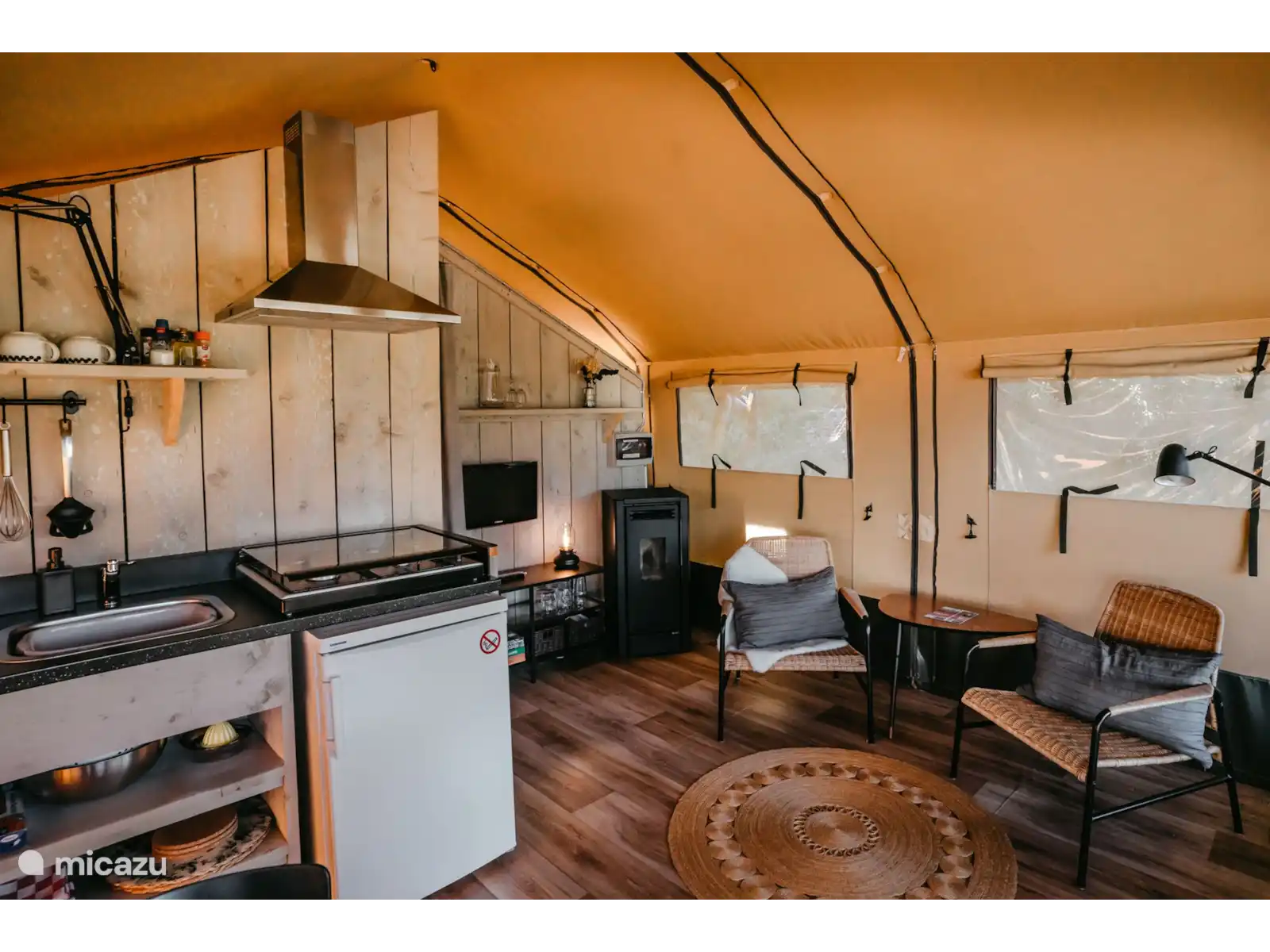 La tente glamping est entièrement meublée, dans le séjour vous trouverez une table à manger et un coin salon avec TV à côté de la cuisine. La chambre dispose d'un lit double et d'une salle de bain avec douche, toilettes et lavabo. La tente Safari est facile à chauffer avec le poêle à granulés moderne et est louée toute l'année.