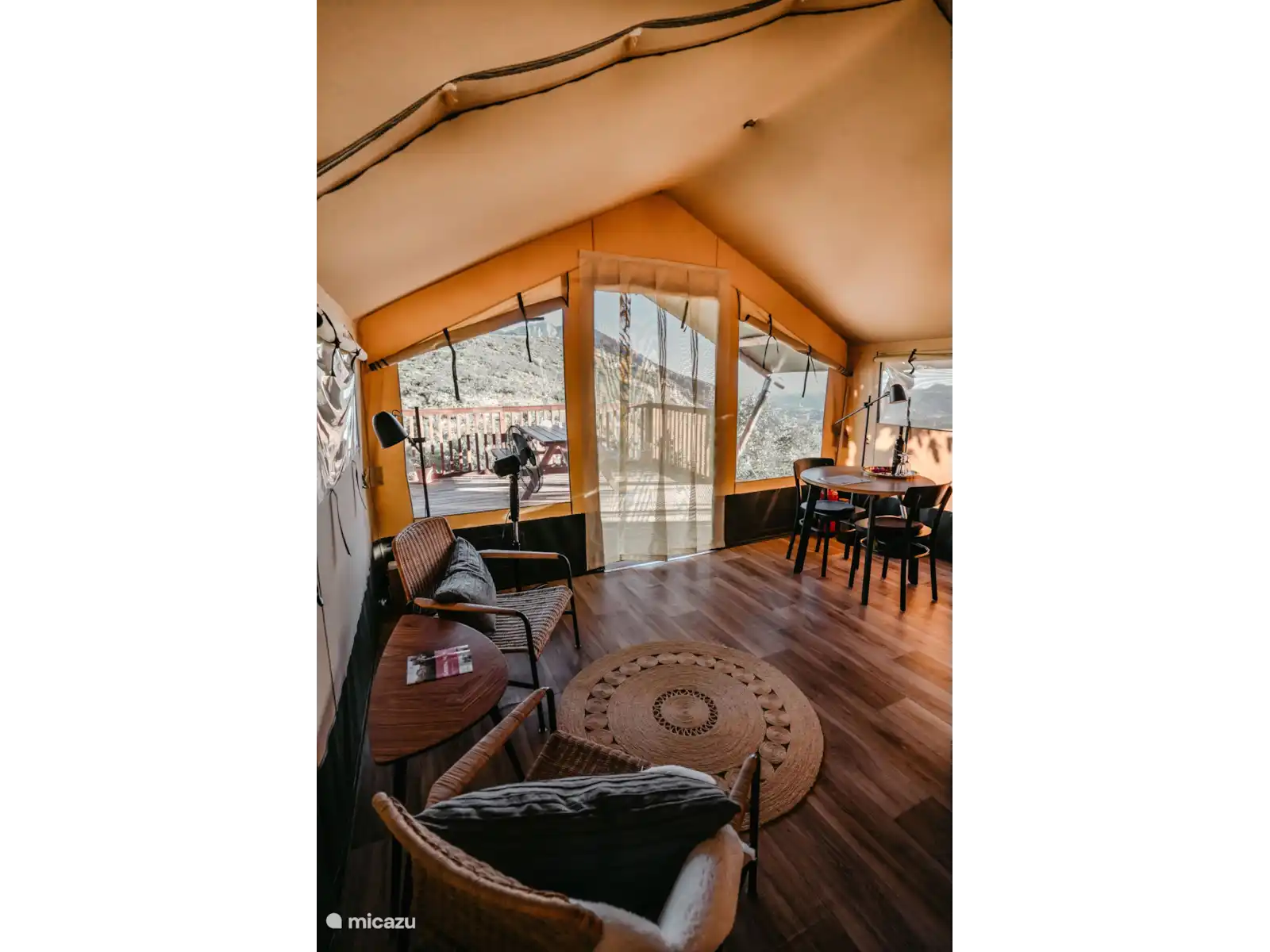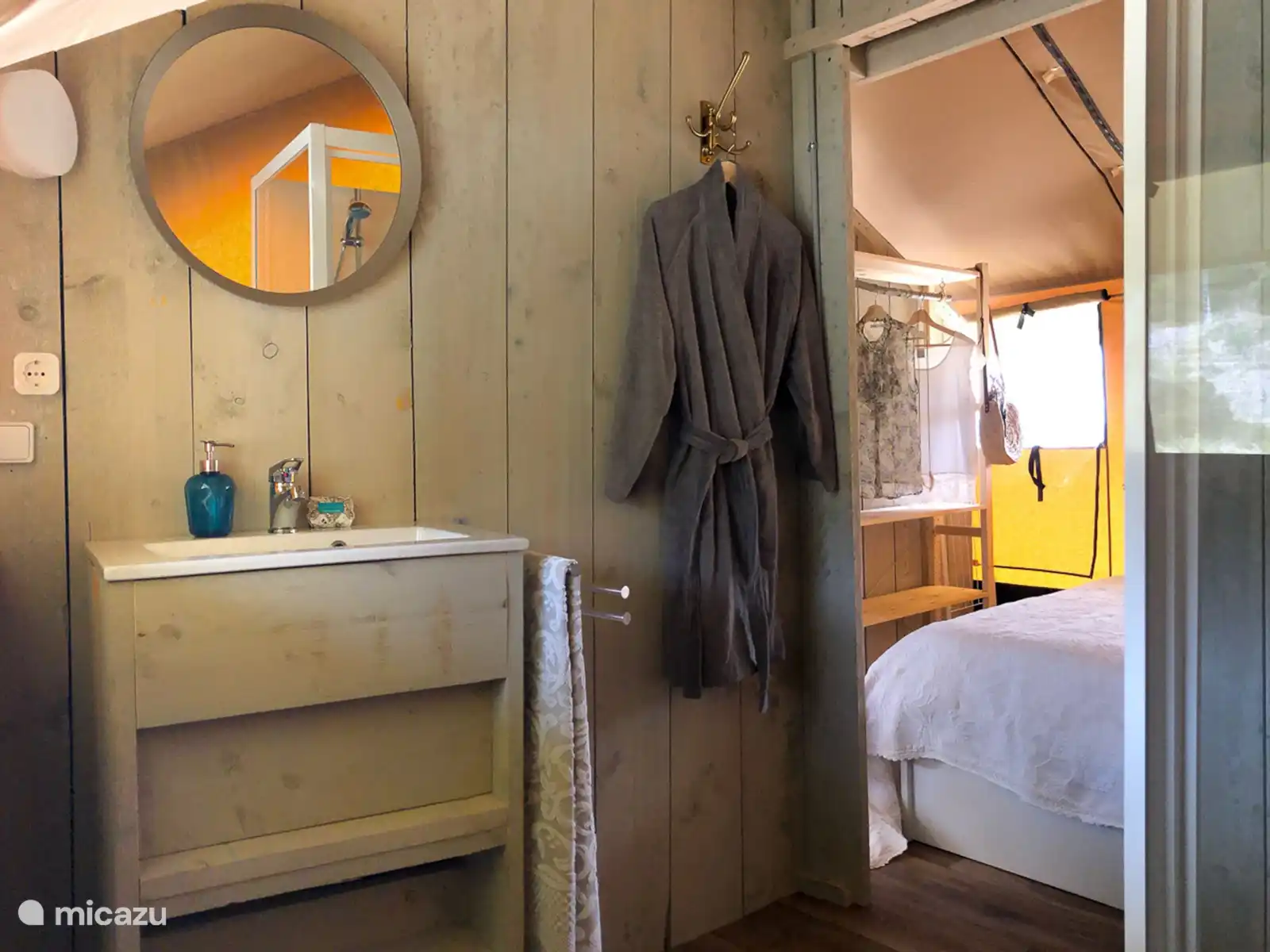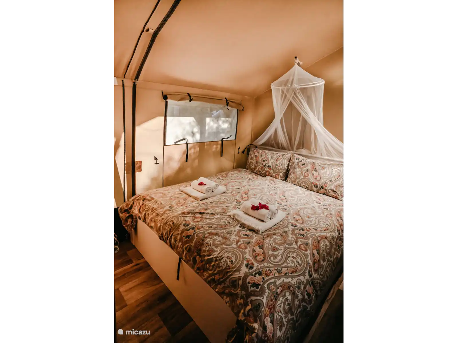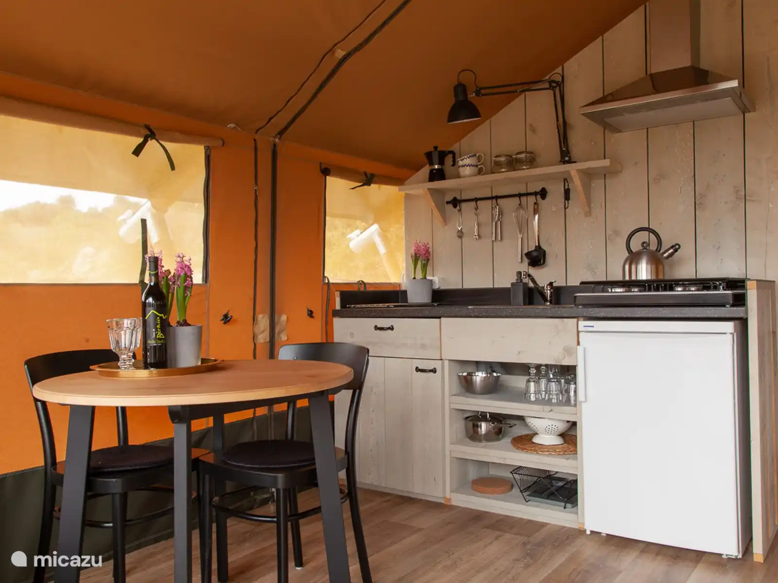 La tente glamping est entièrement meublée, dans le séjour vous trouverez une table à manger et un coin salon avec TV à côté de la cuisine. La chambre dispose d'un lit double et d'une salle de bain avec douche, toilettes et lavabo. La tente Safari est facile à chauffer avec le poêle à granulés moderne et est louée toute l'année.