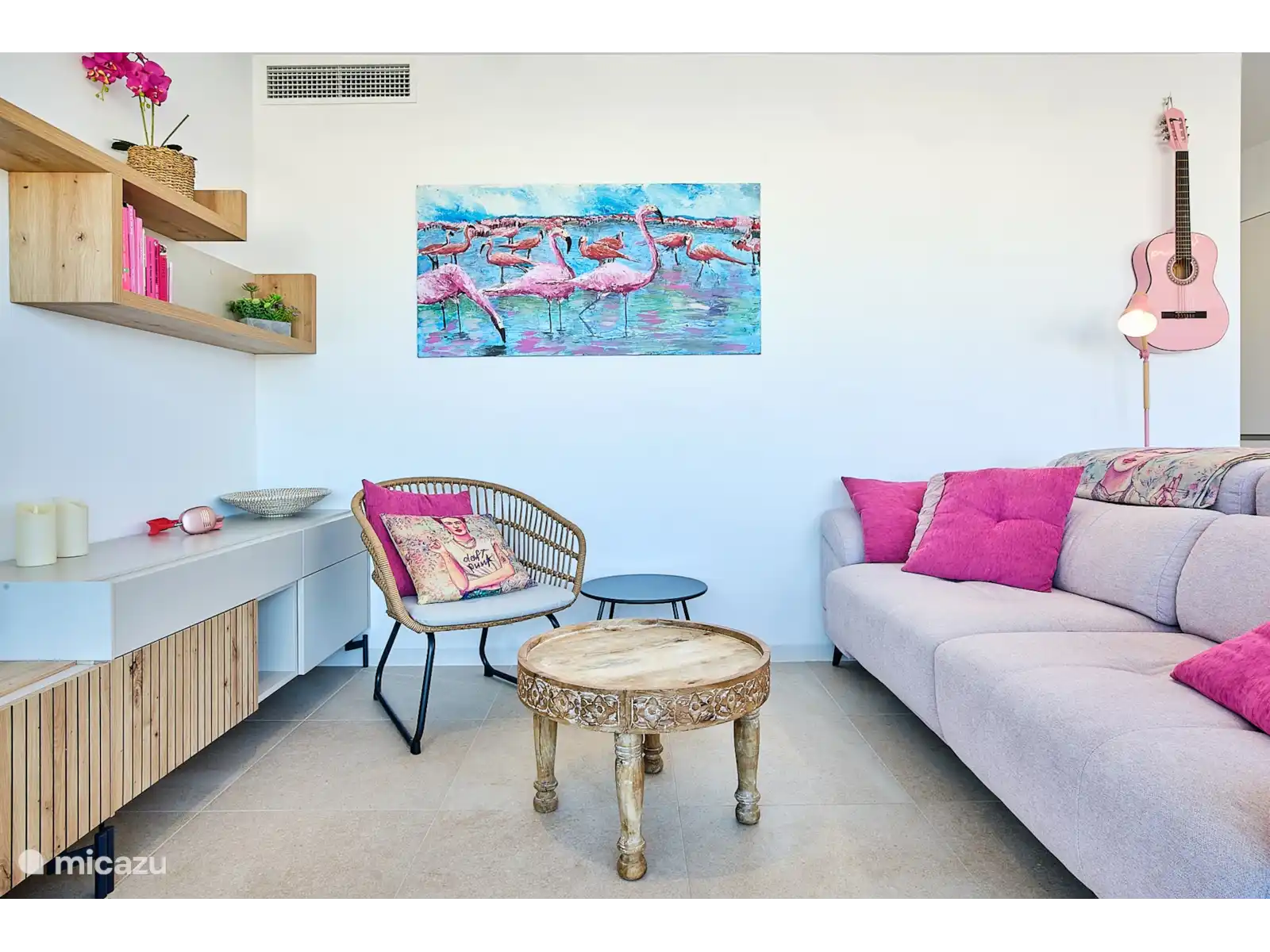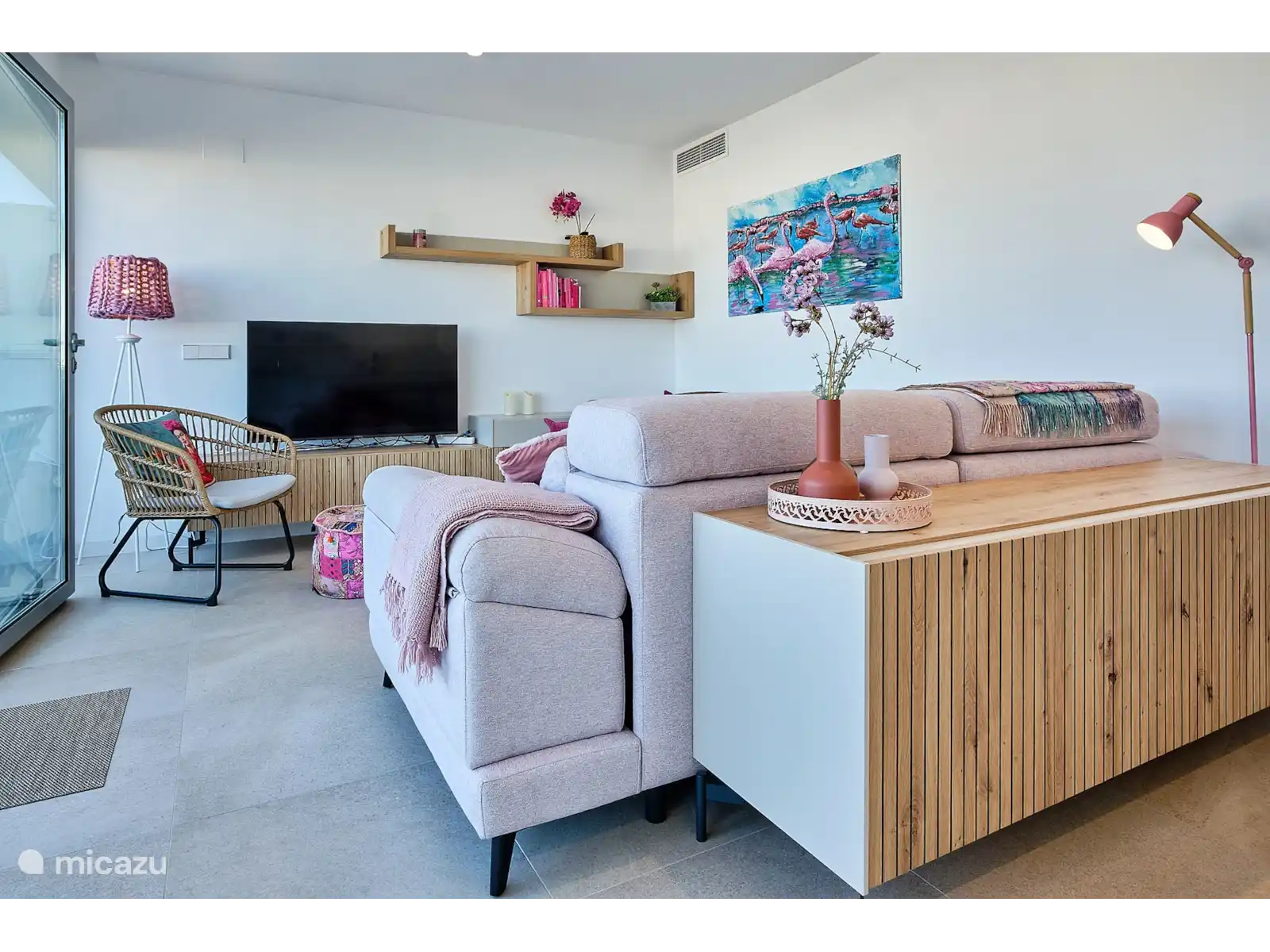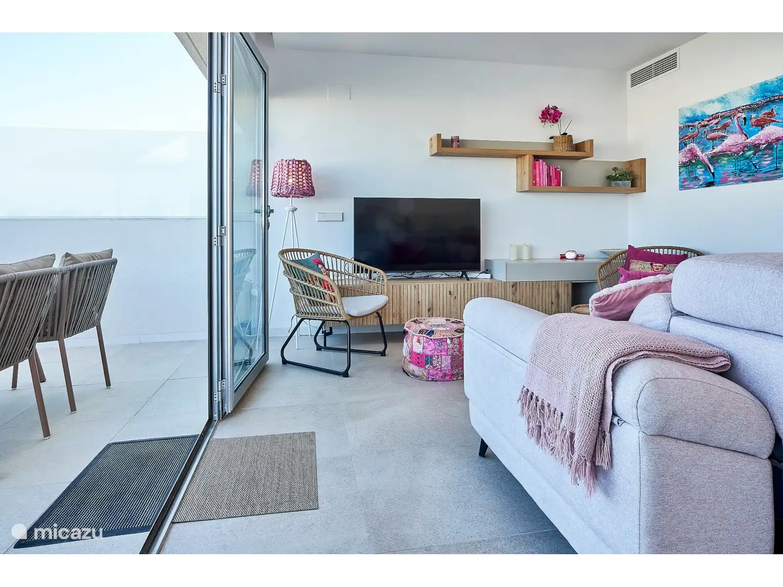 Belle et large vue sur le lac rose, le port et la mer à Torrevieja. Dans cette région espagnole de la Costa Blanca sud, il y a 335 jours de soleil par an. Même en hiver, il est merveilleusement doux et vous pouvez vous allonger au soleil sur le toit-terrasse de ce Pink Penthouse.