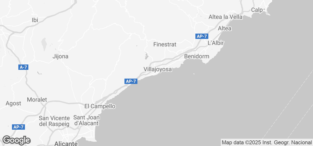 Vol à Allicante, 45 km. Si vous voulez de la foule, Benidorm est à 15 km et vous pouvez prendre le tram