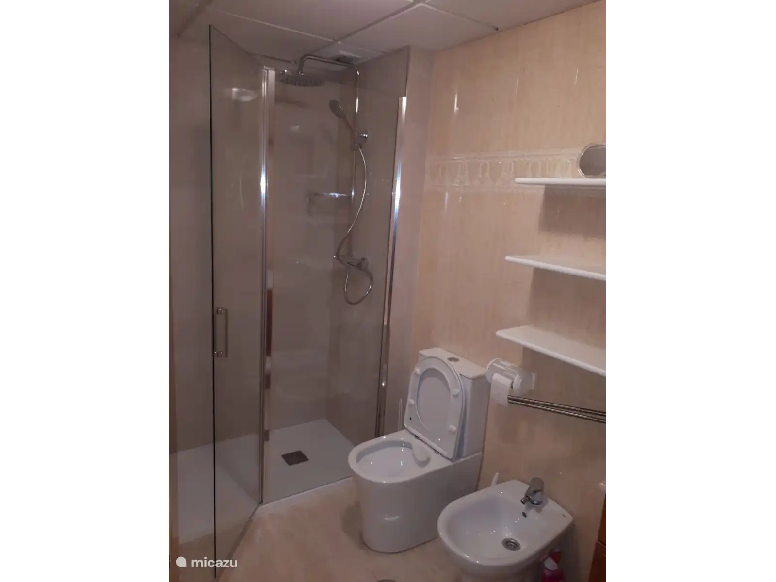 Salle de bain avec cabine de douche spacieuse, bidet, lavabo, toilettes.