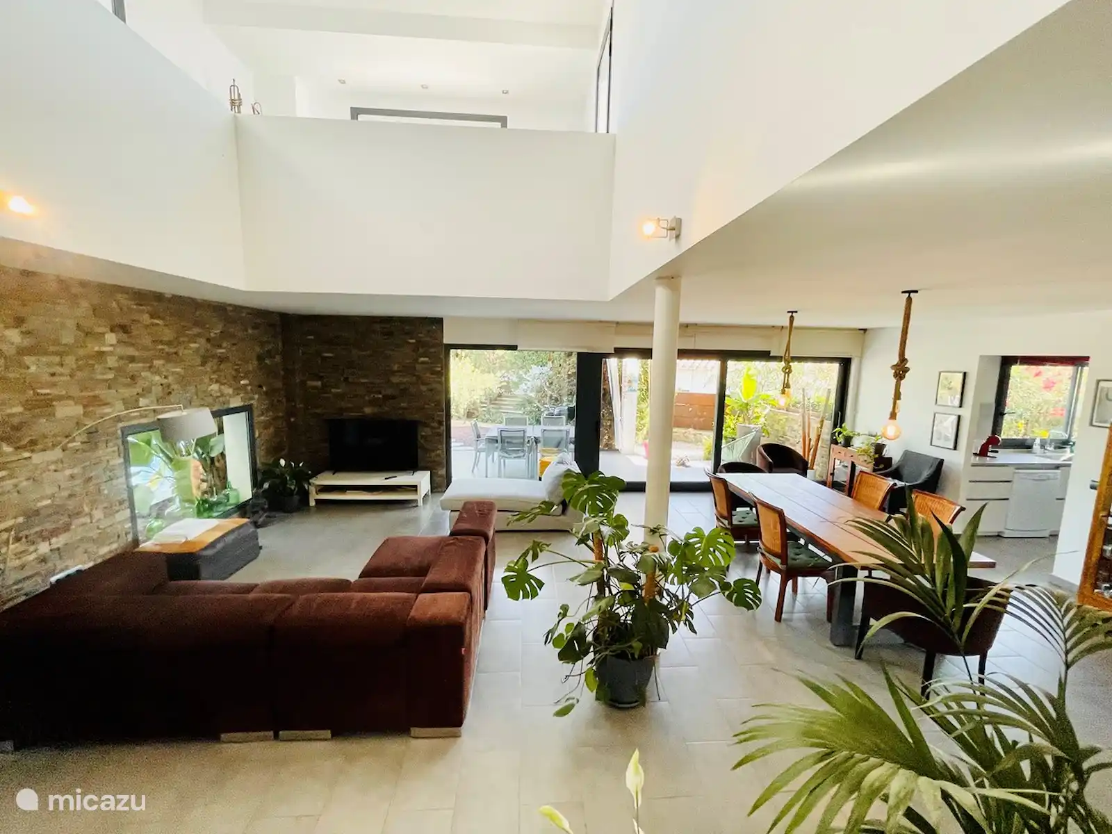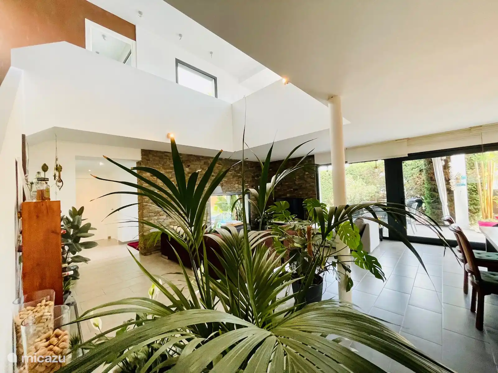 Commençons par l’entrée : un petit couloir mène à un salon ouvert de 70m2, avec de grandes portes-fenêtres qui donnent sur le jardin.