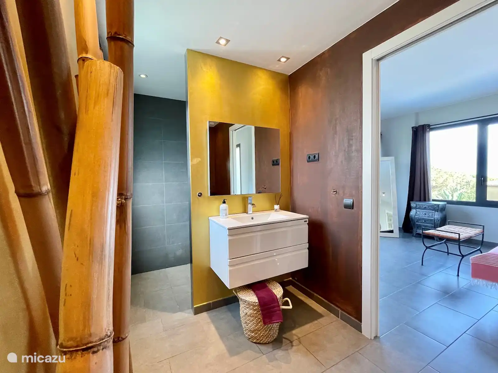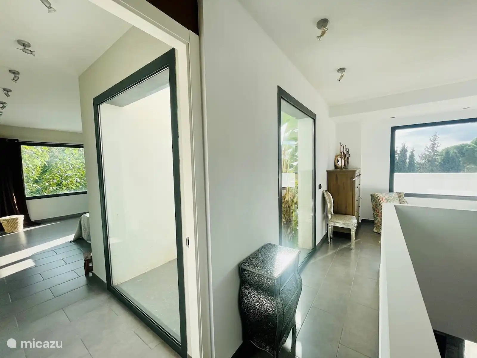 Derrière le salon, vous accédez à une salle de bains moderne, avec des murs en verre et un éclairage au sol LED, avec une douche moderne, et deux chambres doubles, chacune avec des portes-fenêtres menant au jardin.