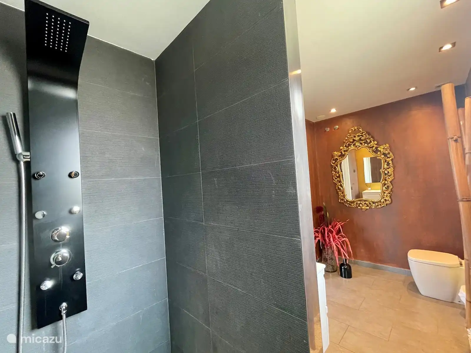 Cette chambre spacieuse dispose d’un lit double de 1,80 m et d’un éclairage au sol LED, d’un dressing privé et d’une salle de bains privative avec une grande douche