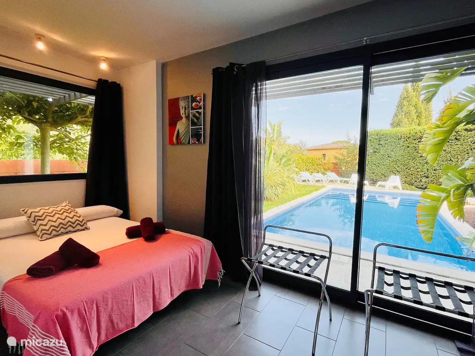 La piscine de 9,20 x 3,80, équipée de chaises longues et équipée d’une petite plage, complète ce tableau paradisiaque.