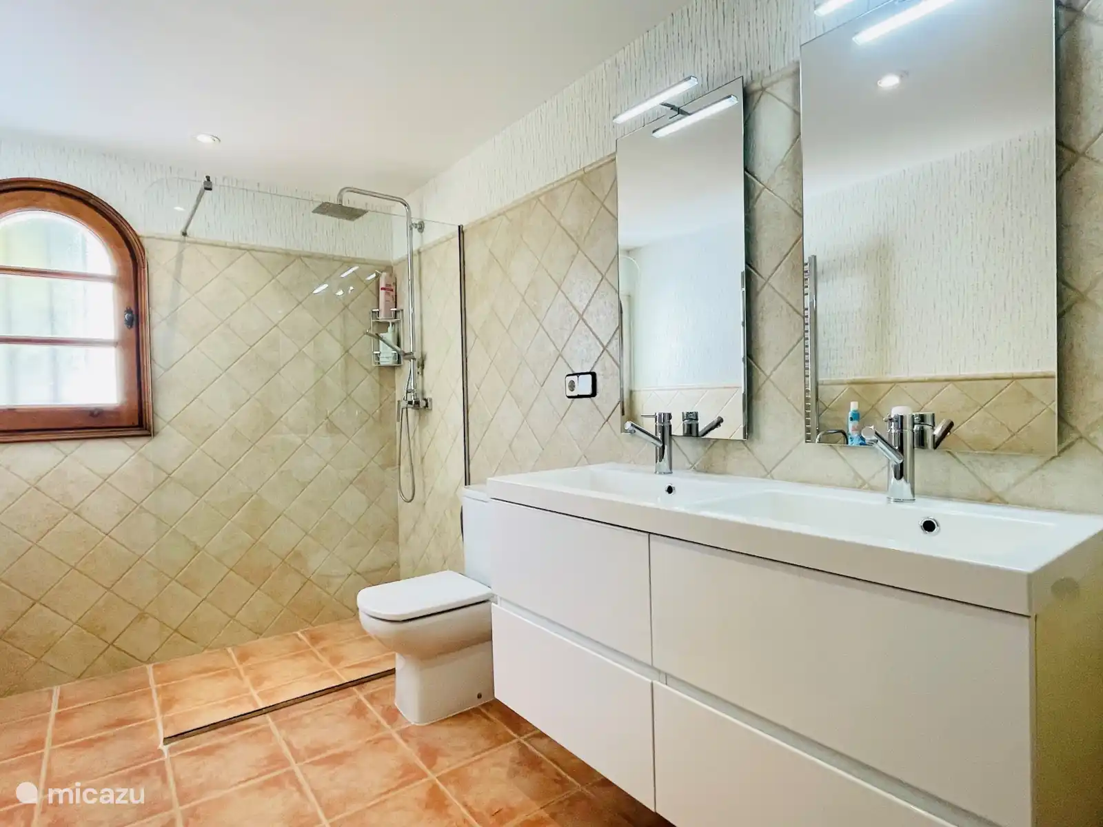 Descendez pour découvrir la chambre principale, un vaste espace où vous pourrez vous détendre. Cette chambre climatisée dispose d’un lit king-size de dimensions impressionnantes de 2,20 x 2,00 mètres. La salle de bains privative est équipée d’une douche et d’un double lavabo, ajoutant une touche de luxe à votre séjour.