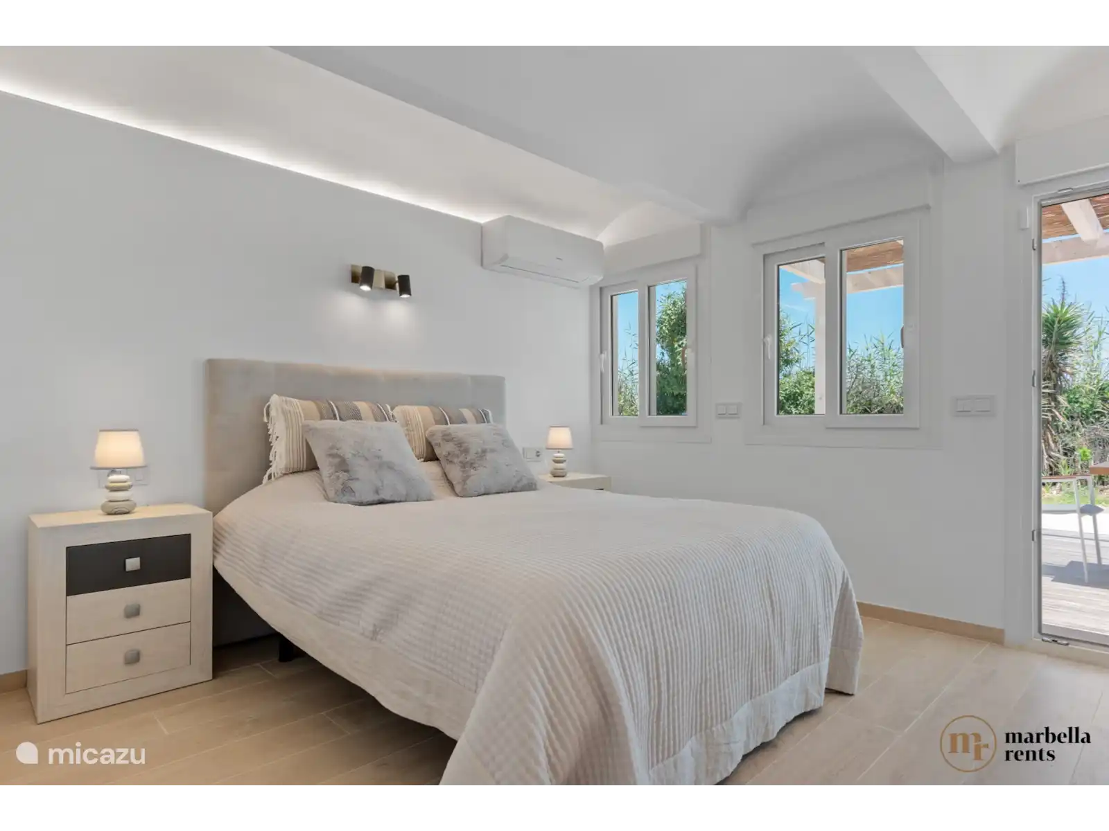 Cuisine spacieuse et luxueuse équipée de toutes les commodités. Buanderie avec lave-linge et sèche-linge. Jardin avec grande terrasse comprenant pergola couverte. Accès privé à la plage. Wifi, système d'alarme, places de parking gratuites.