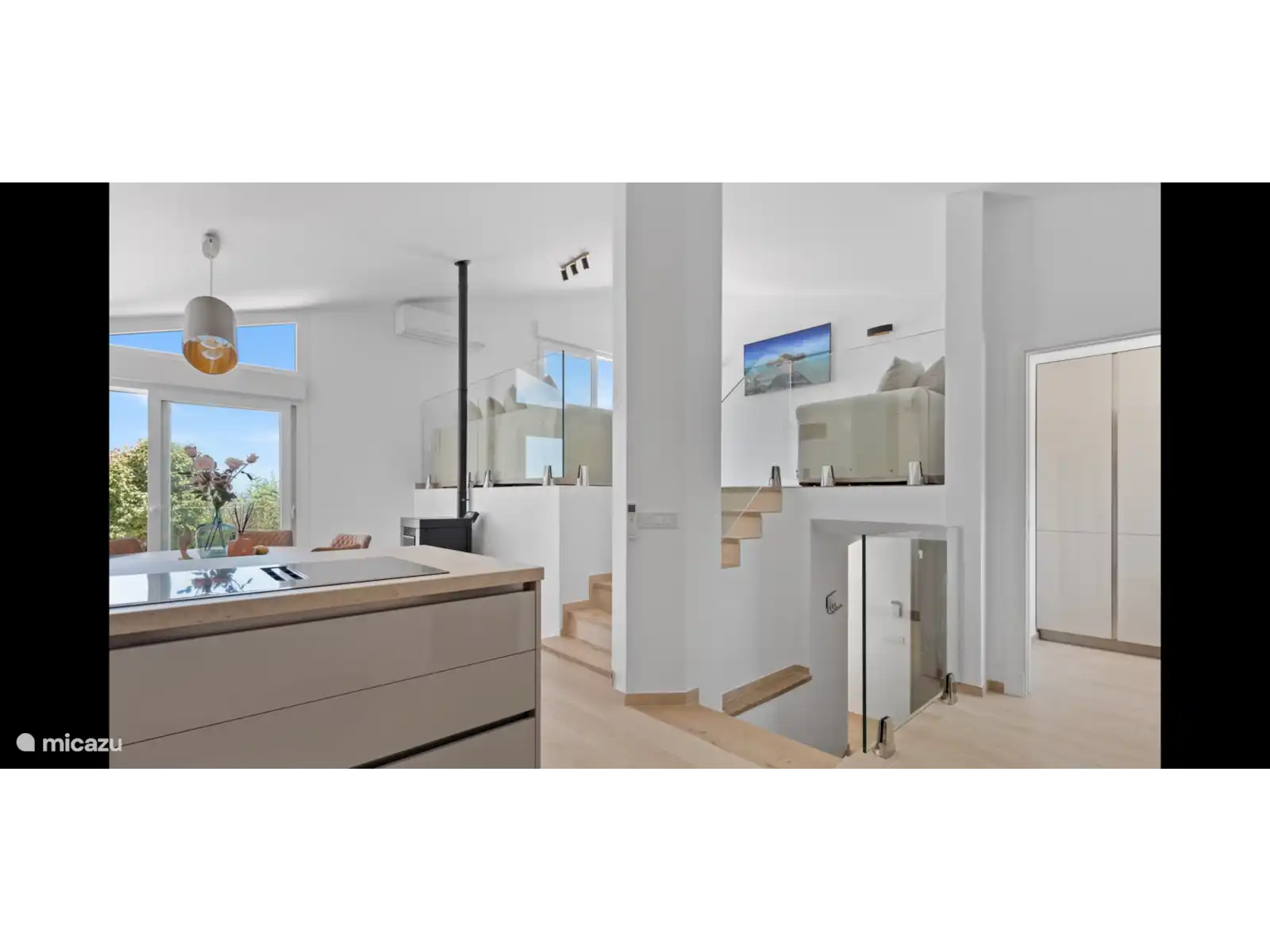 4 piscines communes dont une directement à l'avant. Climatisation partout, 3 chambres toutes avec TV, 2 salles de bain et une douche extérieure. Séjour/salle à manger sur deux niveaux avec air conditionné, poêle à granulés et TV.