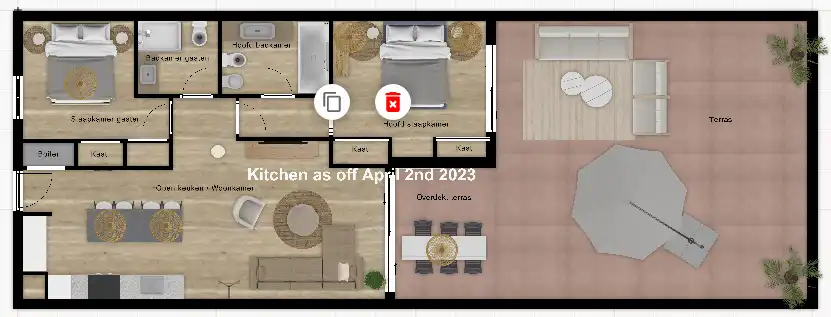 L'entrée donne accès au couloir avec la cuisine à droite et le salon tout droit. L'appartement dispose de deux chambres et de deux salles de bains et d'une grande terrasse de pas moins de 70 m2. La chambre principale a une salle de bain attenante avec baignoire/douche/wc/bidet/lavabo. La chambre d'hôtes dispose d'une salle de bain avec douche/WC/lavabo. Les chambres ont toutes des armoires encastrées avec suffisamment d'espace pour ranger/pendre les vêtements.