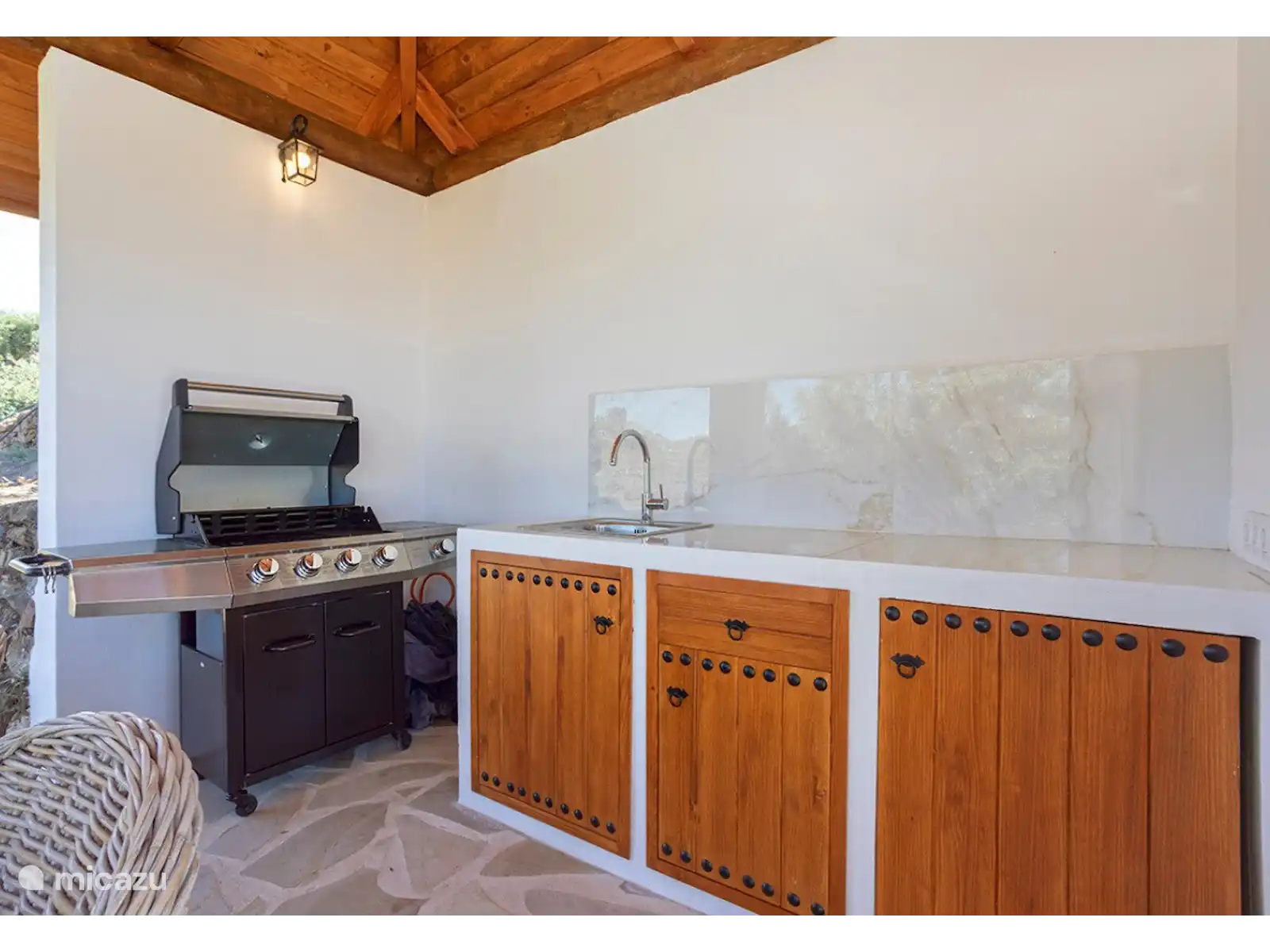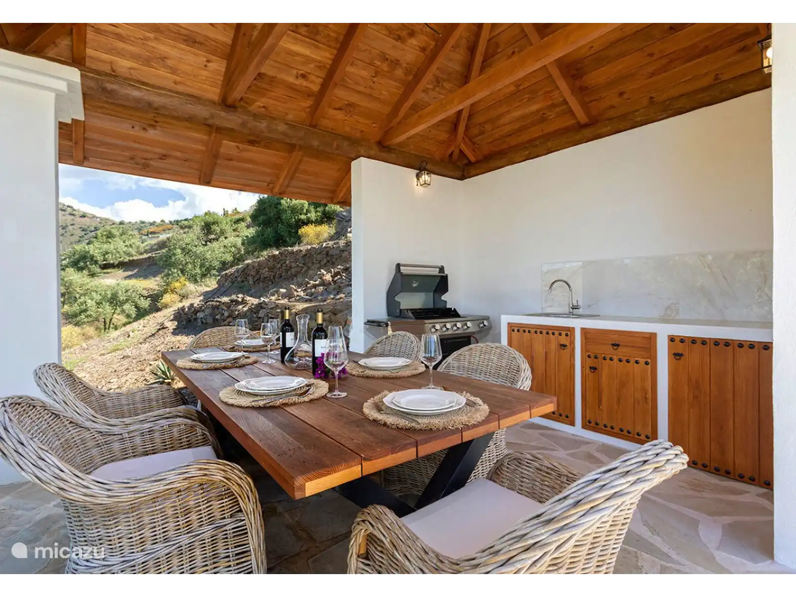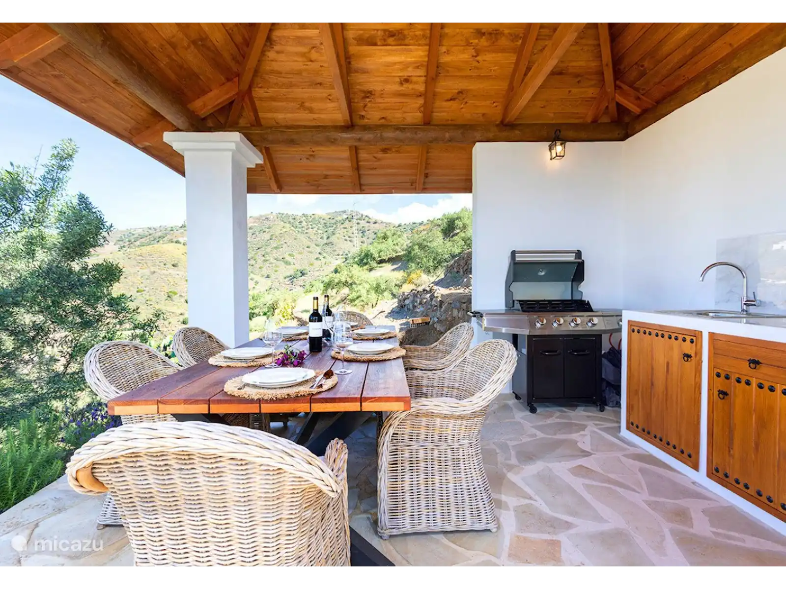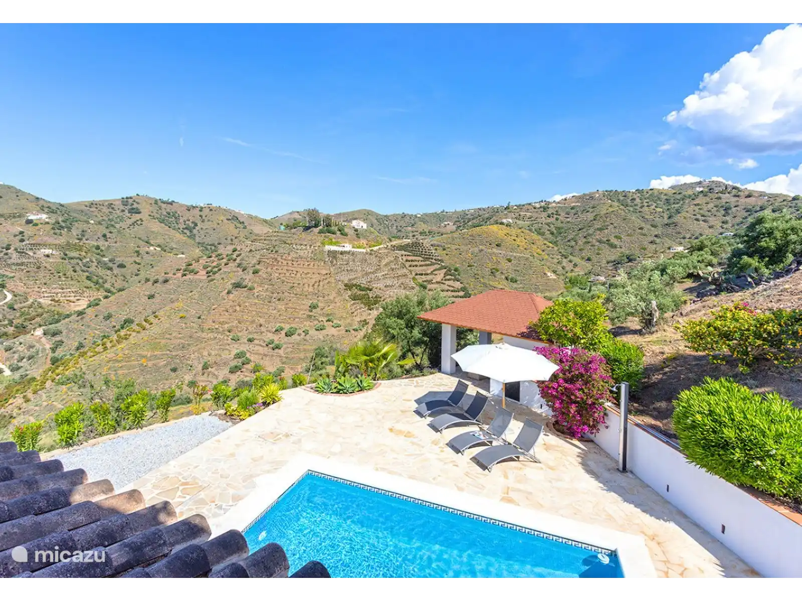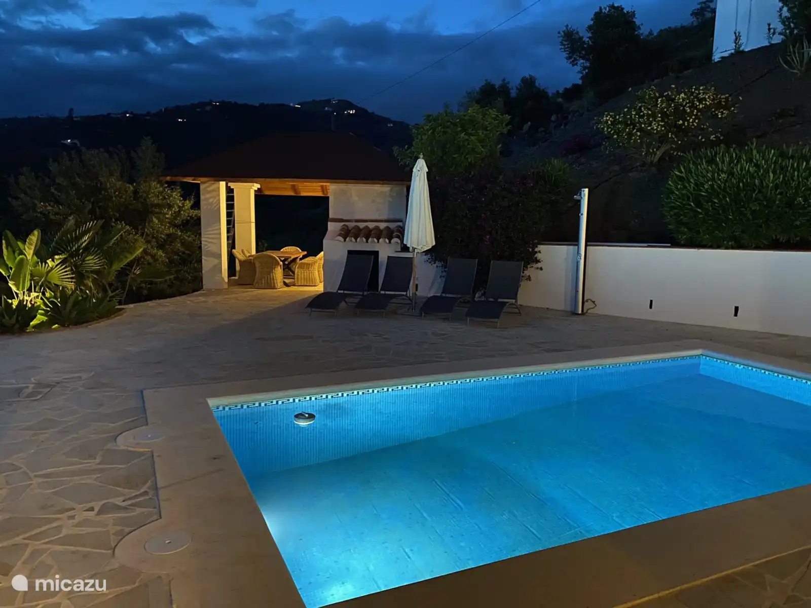 L’extérieur de la Villa Regazo Andaluz est parfait. Autour de la piscine privée se trouve une grande terrasse carrelée avec des transats (4 pièces) tout autour ainsi qu’un parasol et une douche extérieure. La piscine est couverte d’une couverture dans la période novembre - février. Sous la terrasse couverte se trouve un coin salon avec une table pour s’asseoir tranquillement. Dans le jardin, il y a beaucoup de plantes et d’arbres tropicaux. Il y a une belle pergola pour profiter de la vue à l’ombre avec un coin repas généreux et un barbecue à gaz pour cuisiner en plein air. Depuis le balcon, vous pourrez profiter d’une vue unique sur la mer. Le site est en partie fermé avec un portail au niveau du parking, il y a une place de parking pour 3 voitures.