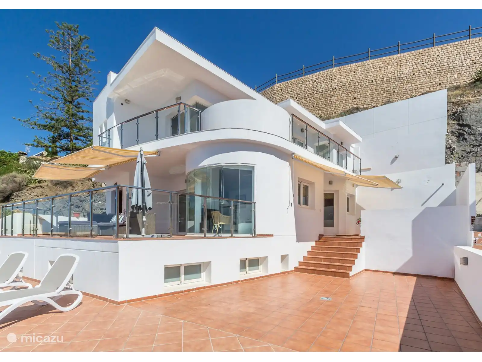La villa a trois étages. Le premier étage est accessible par un escalier ou une rampe depuis la rue. La vue est impressionnante de chaque étage.