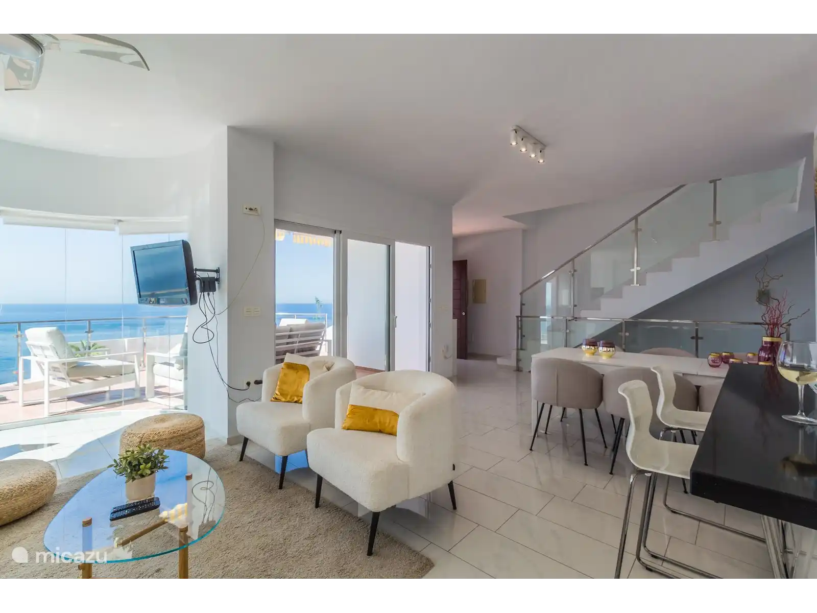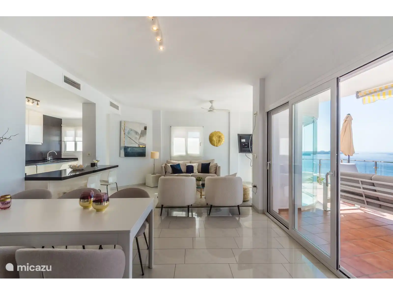 A l'étage, vous trouverez le salon avec un ensemble confortable de canapés et de fauteuils, une table pour 6 personnes et une cuisine moderne. De cet endroit, vous pourrez profiter de la belle vue qu'offre la villa. La cuisine ouverte moderne a tout ce dont vous avez besoin pour préparer de délicieux repas et dispose également d'un bar avec deux tabourets. De la cuisine, vous avez accès à une terrasse où se trouve le barbecue à gaz. Cette terrasse est également reliée à la piscine et à la terrasse principale. La cuisine communique avec le séjour lumineux avec vue mer et accès à la grande terrasse avec piscine à débordement de 8m x 4m. Il y a des toilettes invités dans le salon, juste en face de l'ascenseur.