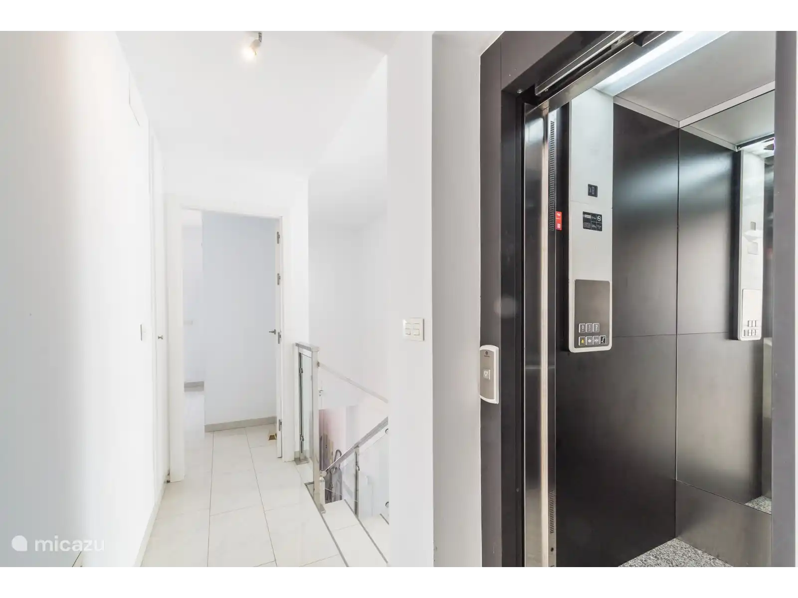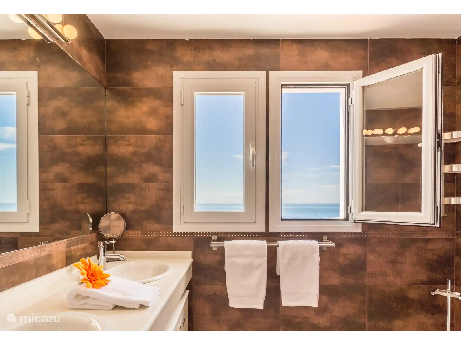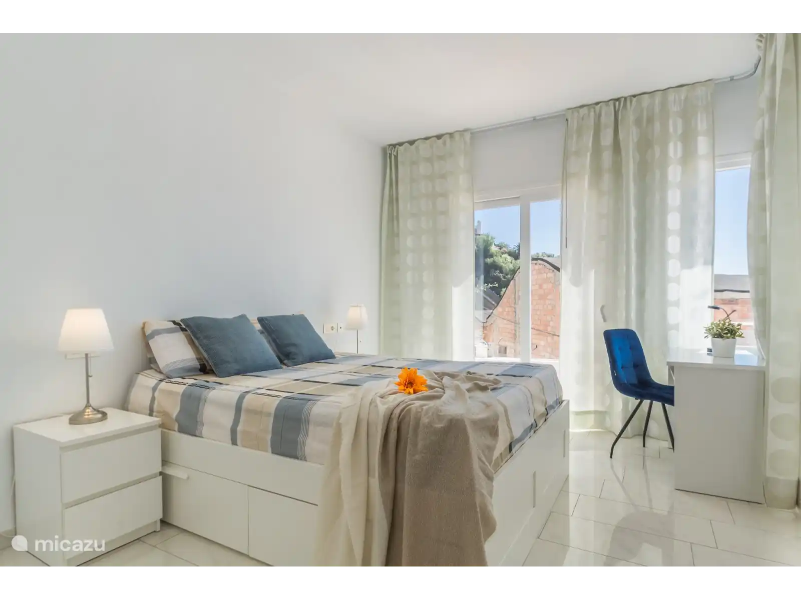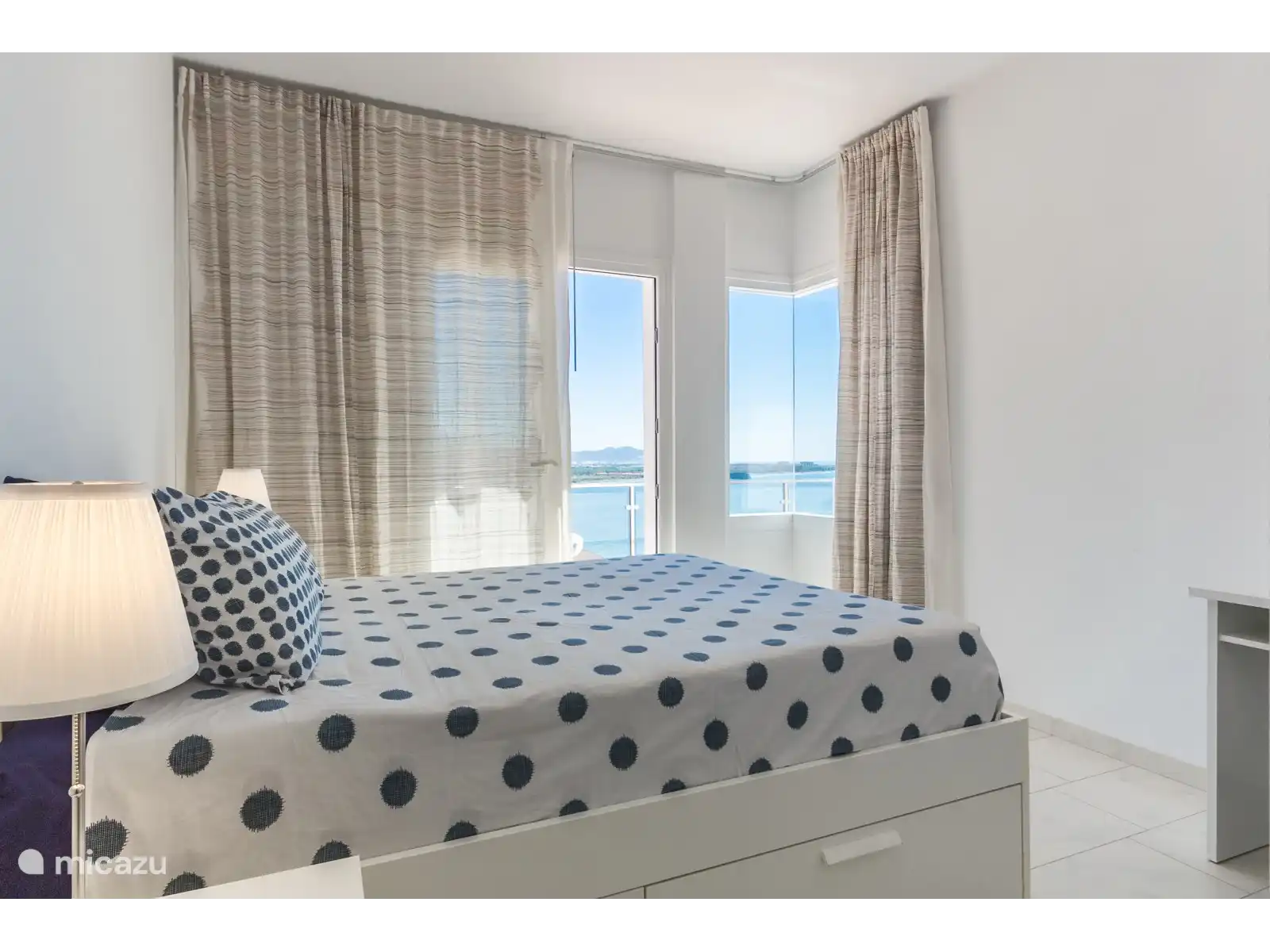 Les chambres sont situées au dernier étage, accessible par le large escalier et l'ascenseur. A cet étage, il y a 3 chambres et deux salles de bains. La chambre principale dispose d'un lit de 160 x 200. Cette chambre dispose d'une salle de bain attenante avec double vasque et douche. De cette chambre avec vue frontale sur la mer, vous avez accès à une terrasse qui longe le mur latéral et est reliée aux autres chambres. Les deux autres chambres disposent également d'un lit de 160 x 200. Ces chambres ont accès à la terrasse latérale qui relie les trois chambres par l'extérieur, toutes deux disposent également d'une fenêtre avec vue mer. Ces deux chambres partagent une salle de bain complète avec double vasque, baignoire et douche.