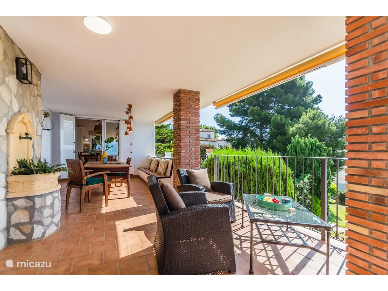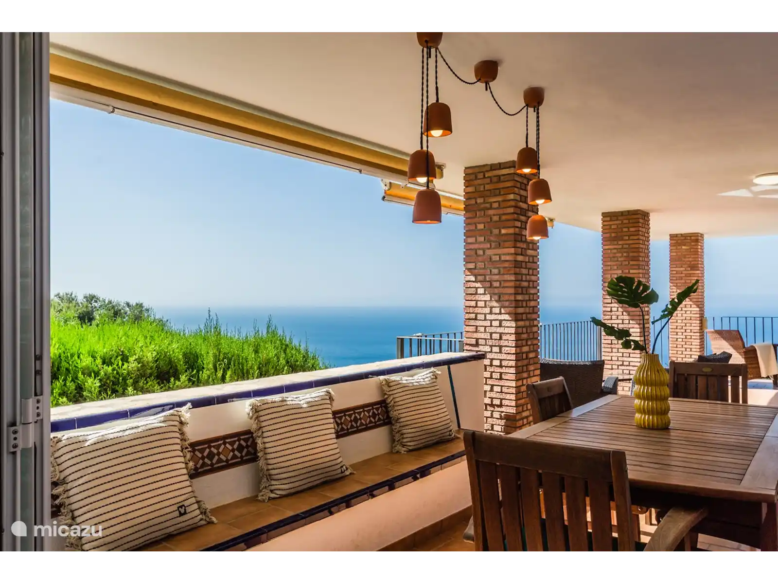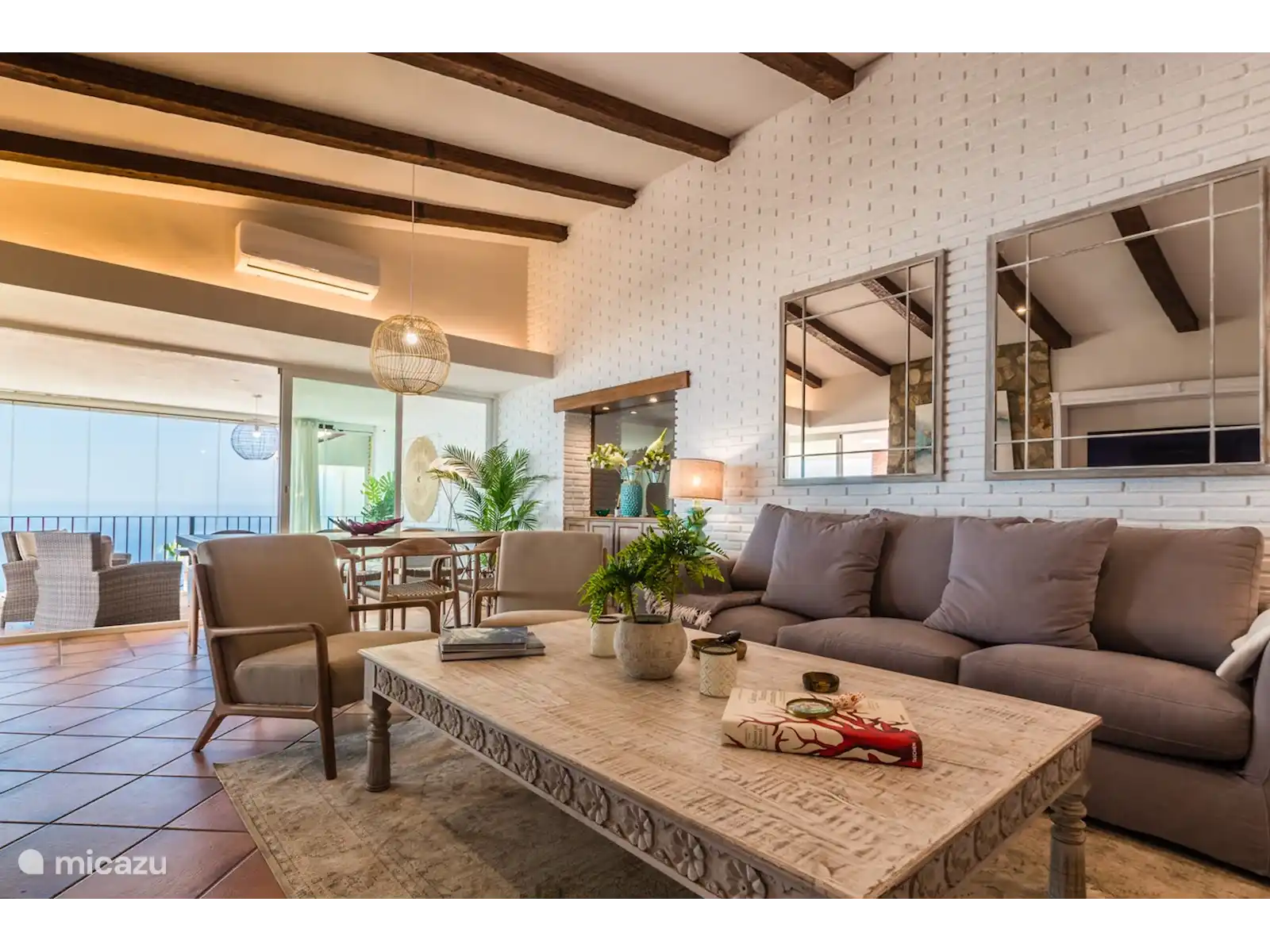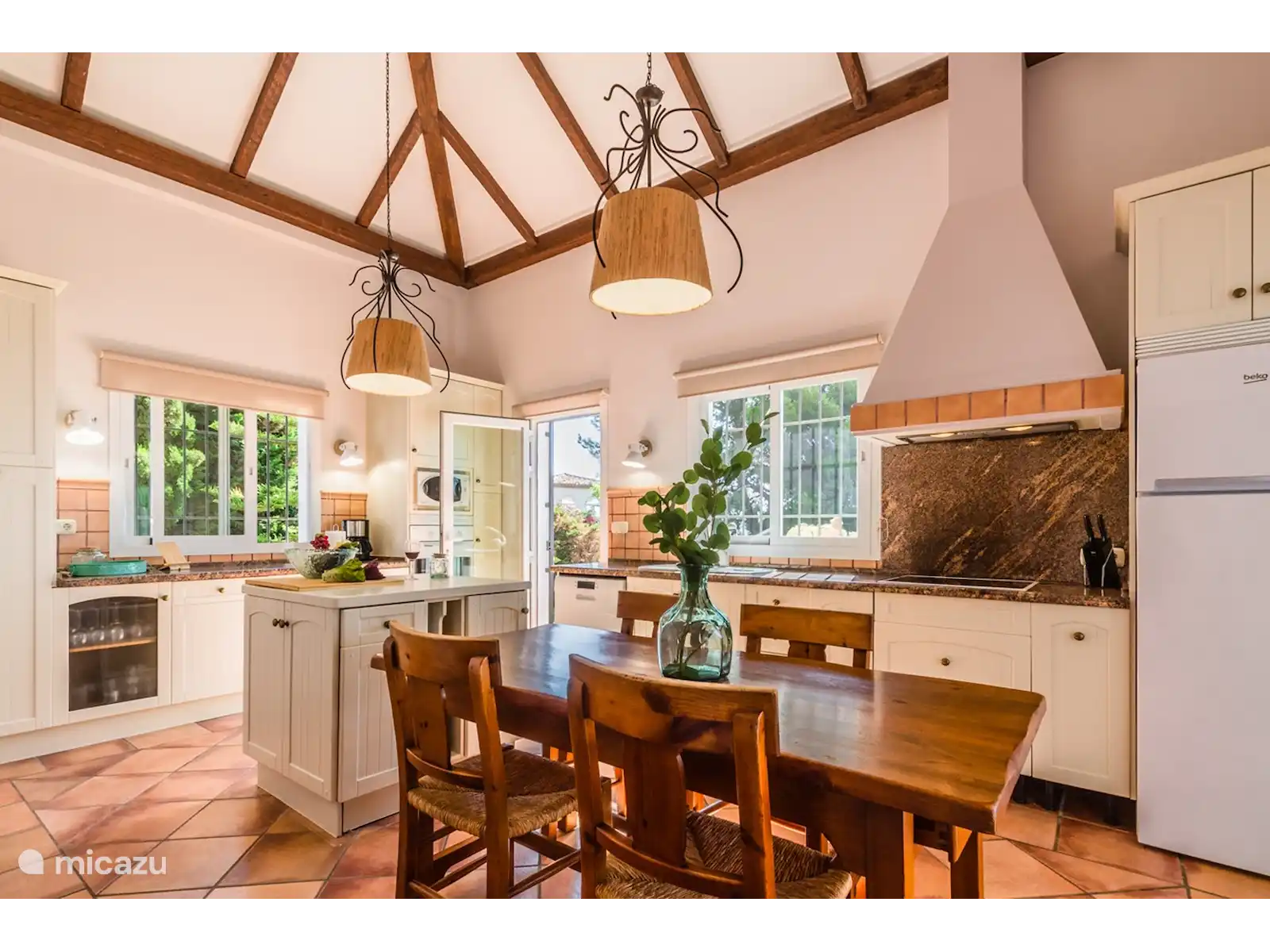 Dès que vous entrez dans la villa, vous obtenez une sensation d'espace. Les hauts plafonds avec poutres apparentes, le grand salon et la lumière provenant des grandes fenêtres créent une atmosphère chaleureuse et accueillante. Le salon dispose d'une cheminée intégrée pour profiter d'une couverture sur le canapé pendant les quelques mois froids de l'année. Le salon dispose d'une grande terrasse en forme de L avec une belle vue sur la mer et les montagnes. Une partie de la terrasse est vitrée et dispose d'un mobilier de jardin confortable. L'autre partie est reliée à la cuisine. À la grande table, vous pourrez déguster un délicieux repas ou vous adonner à d'autres activités en famille ou entre amis. Au même niveau se trouvent des toilettes invités avec lavabo. La cuisine est également située au rez-de-chaussée et est entièrement équipée. Les meubles de cuisine et les beaux plafonds avec poutres lui donnent une touche rustique. Ici, vous pourrez cuisiner avec des produits locaux que vous pourrez acheter frais au marché local.