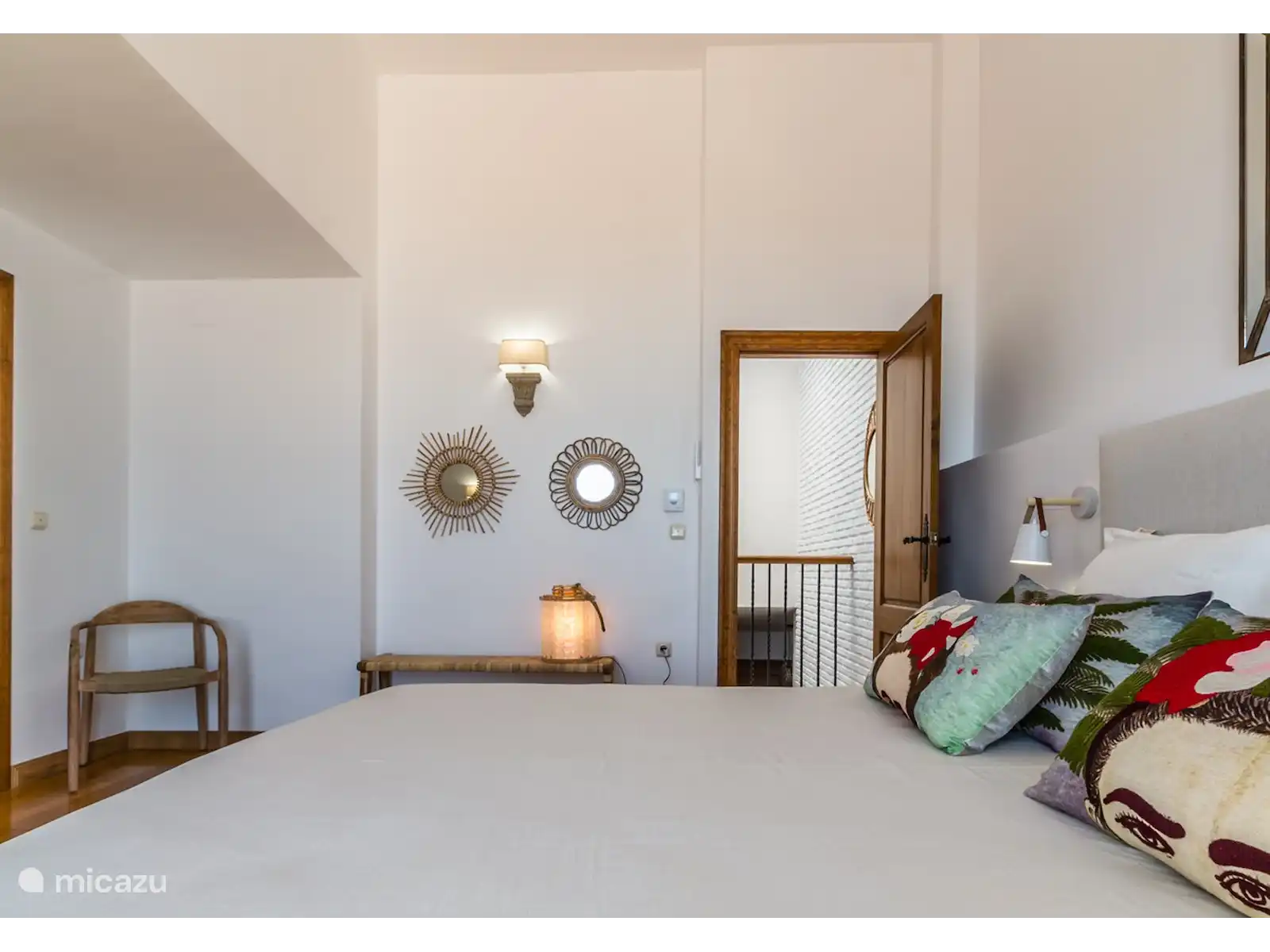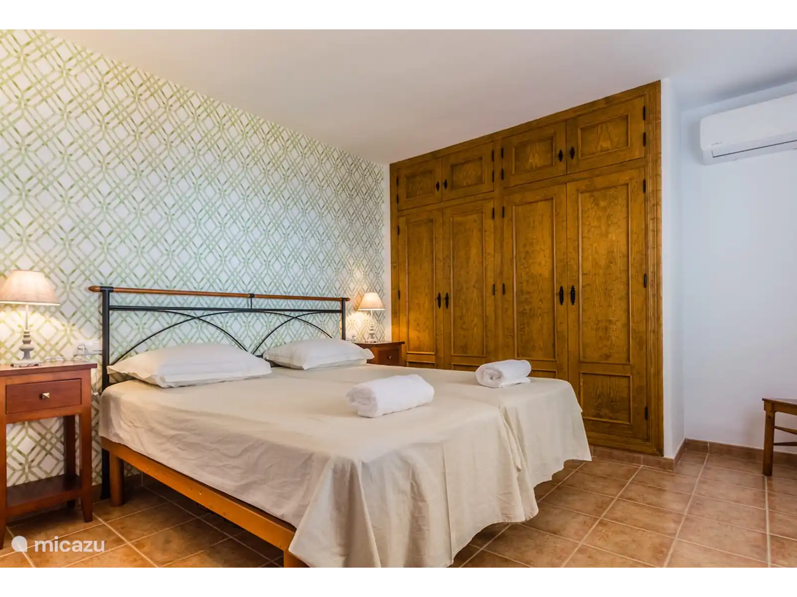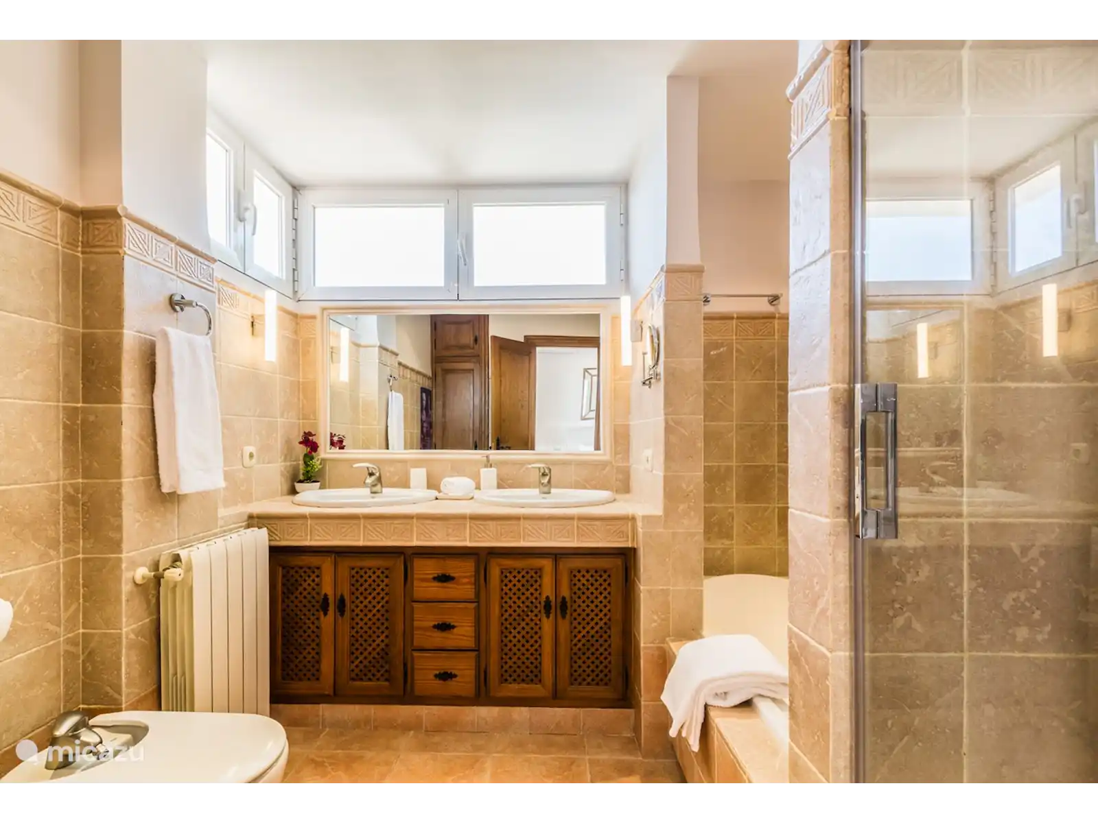 Au premier étage, vous trouverez une chambre avec salle de bain en suite et un dressing. Le lit se compose de 2 matelas de 90 cm chacun, le sommier étant réglable individuellement. À quelques pas du rez-de-chaussée, vous trouverez trois autres chambres et une salle de bain complète. Une des chambres a un lit double king size. Dans la partie inférieure de la maison, il y a un appartement avec 1 chambre, une salle de bain avec douche et une petite cuisine avec bar attenante à une petite salle de loisirs canapé-lit et télévision. De là, vous entrez sur une petite terrasse avec accès et vue sur le jardin et la piscine. Chaque chambre dispose de la climatisation pour le refroidissement et le chauffage afin d'assurer votre confort tout au long de l'année. Il y a aussi des radiateurs dans les chambres.