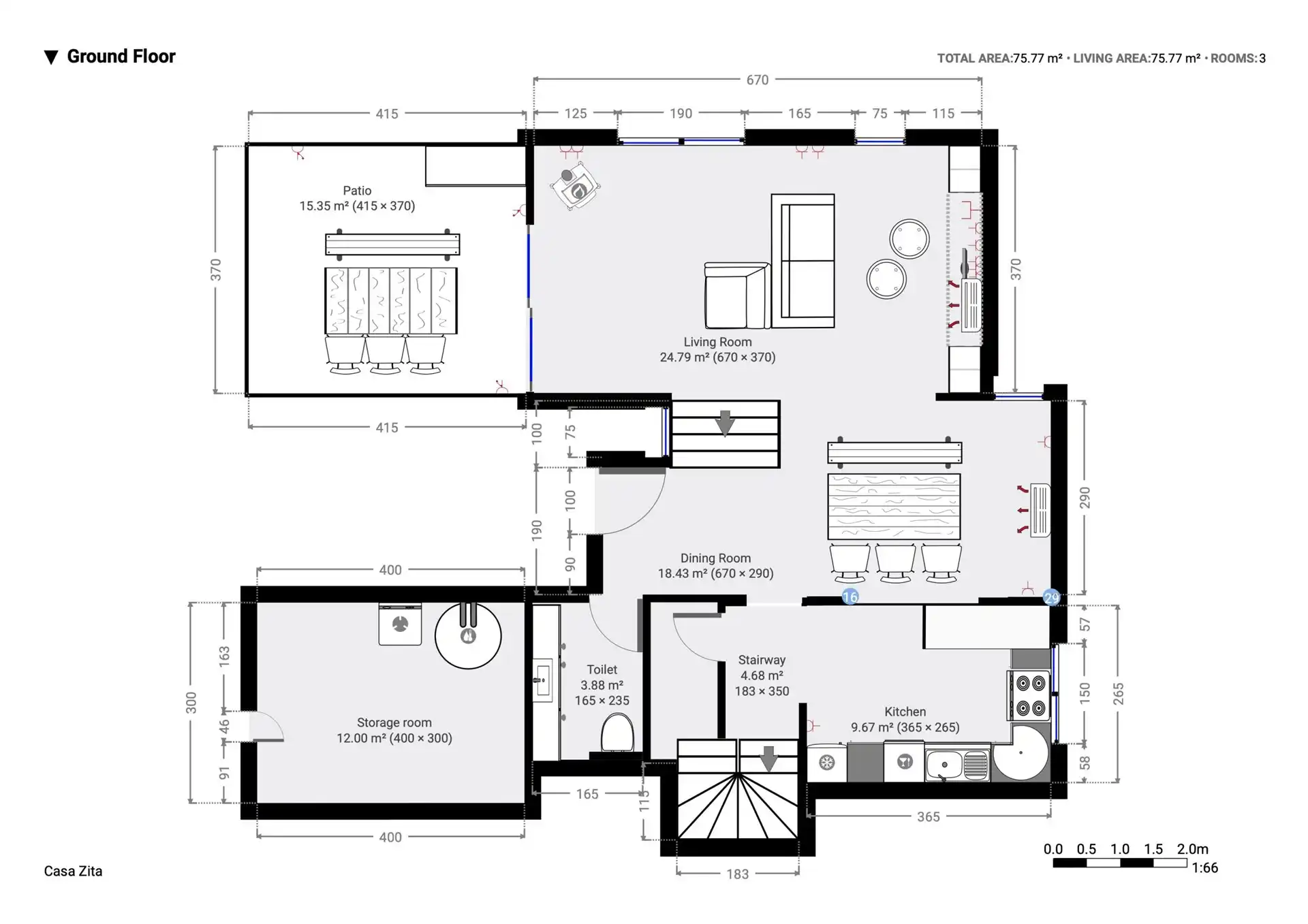 Un escalier mène à l’entrée du rez-de-chaussée de la maison. En entrant, vous avez une belle salle à manger avec une table robuste et une cuisine ouverte de style Ibiza avec bar. À droite se trouvent des toilettes avec à côté les escaliers qui vous emmènent à la partie supérieure avec des chambres et des salles de bains. À gauche se trouve le salon qui est équipé d’un beau meuble TV en brique avec système surround et d’un canapé relaxant. La cheminée à bois offre une atmosphère et un confort supplémentaires pendant la période hivernale. La fenêtre coulissante donne un accès direct à la terrasse, équipée d’un ensemble de salon et d’une table à manger pour 6 personnes. Il y a un barbecue à gaz fourni.