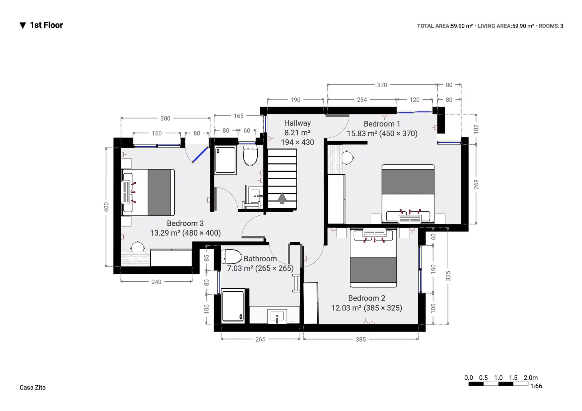 Par un escalier extérieur, vous avez un accès direct à la deuxième grande terrasse avec un grand salon, des transats et une belle vue lointaine sur la mer. Les 3 chambres et 2 salles de bains séparées avec douche sont situées au dernier étage. Dans l’une de ces chambres, les lits peuvent être écartés et il y a aussi une douche extérieure sur la terrasse avec de l’eau chaude et froide pour une douche revigorante avec une belle vue. Tous les lits ont des matelas à sommier tapissier avec un surmatelas sur le dessus. Toutes les chambres et le salon sont climatisés
