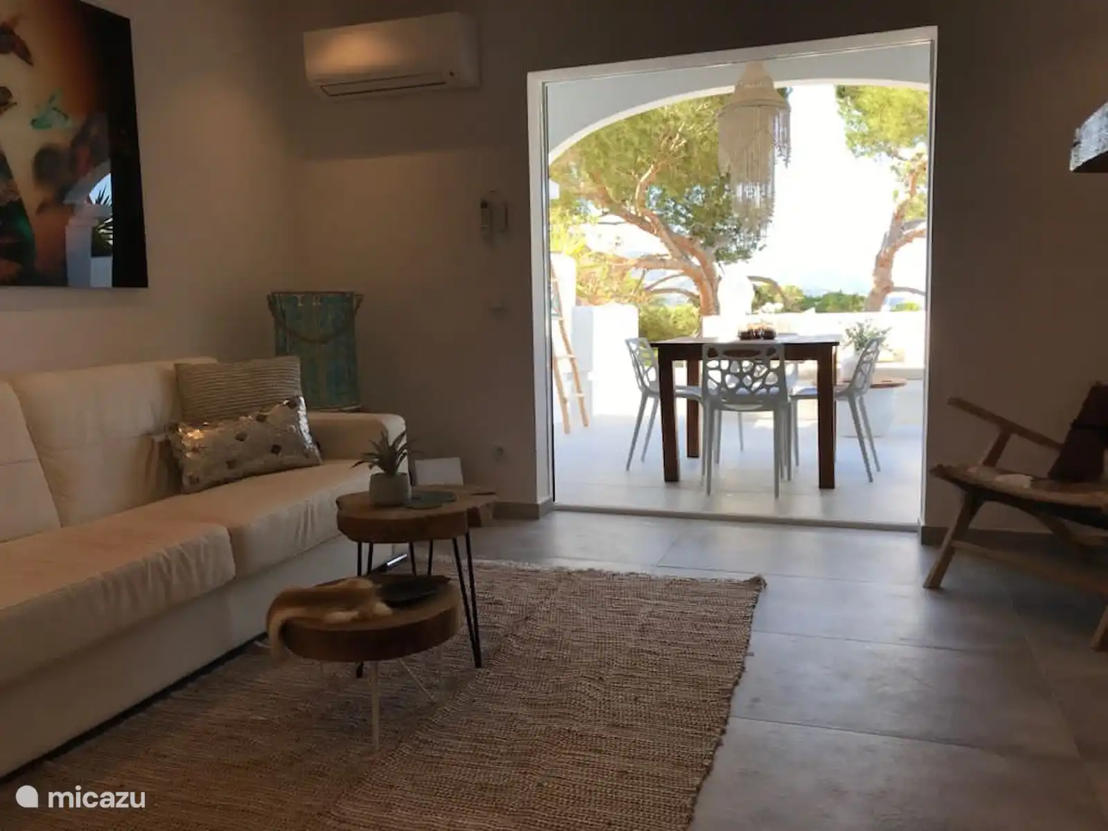 La terrasse est ensoleillée toute la journée et offre une vue sur le rocher magique Es Vedra, la mer et la zone boisée.