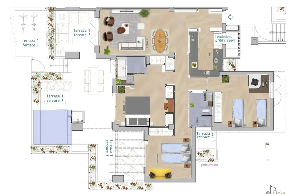 une belle terrasse privée isolée d'environ 70 m2 avec un coin yoga et sa propre « piscine »/piscine. Vous pouvez également utiliser les piscines communes.
