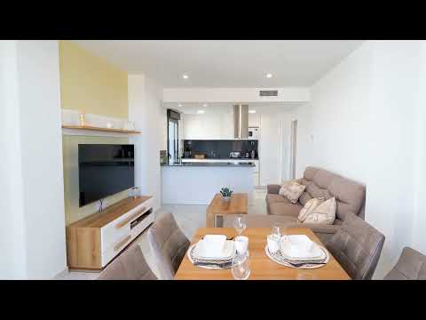 La maison est au premier étage et dispose de 2 chambres, 2 salles de bains, une cuisine avec îlot, un beau salon spacieux avec climatisation et vue depuis le balcon sur la piscine.