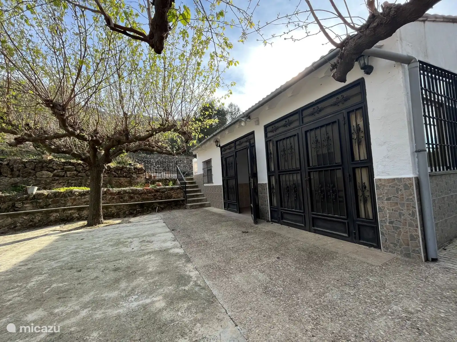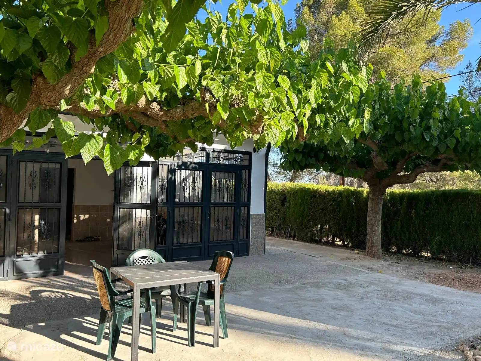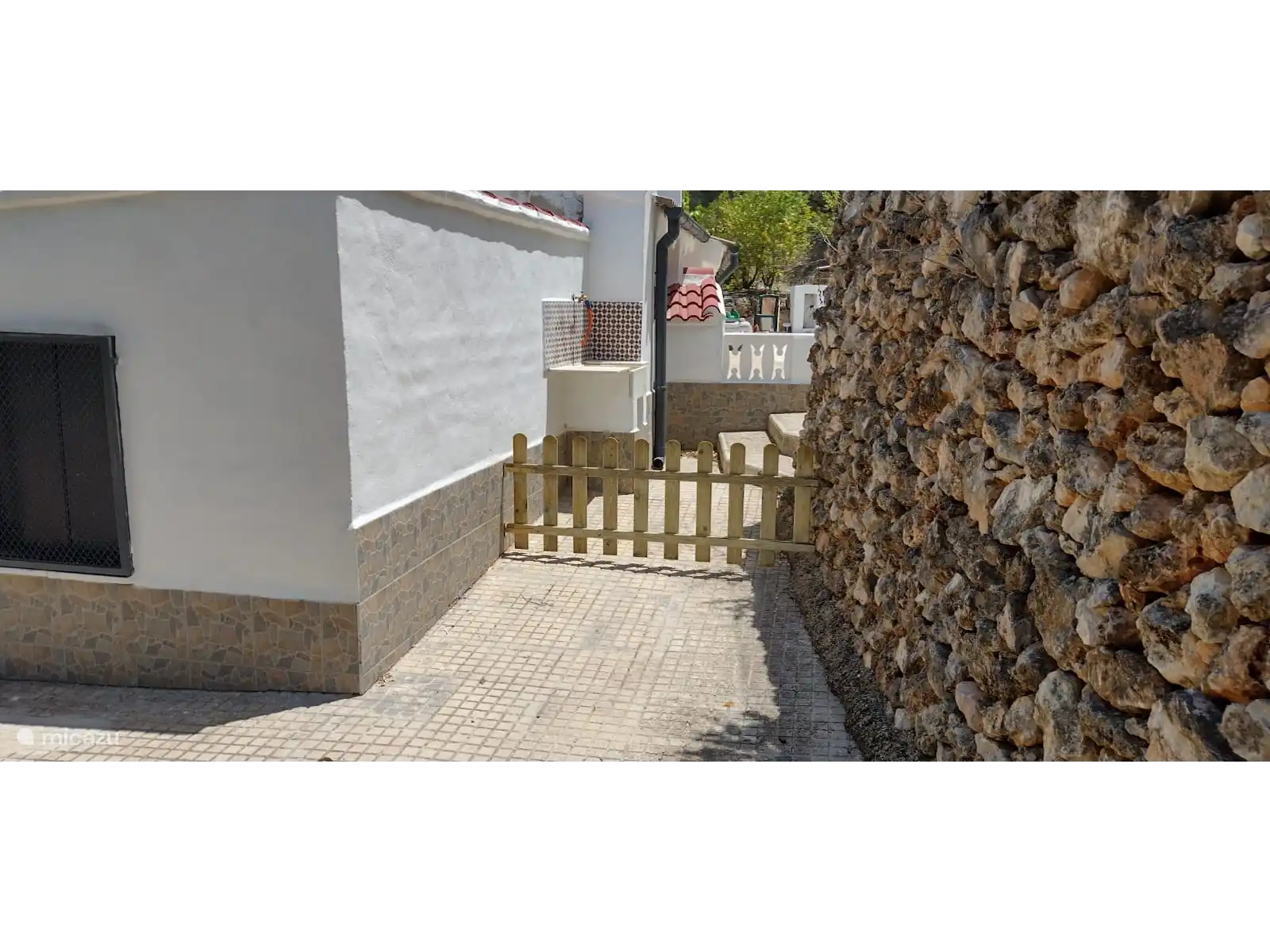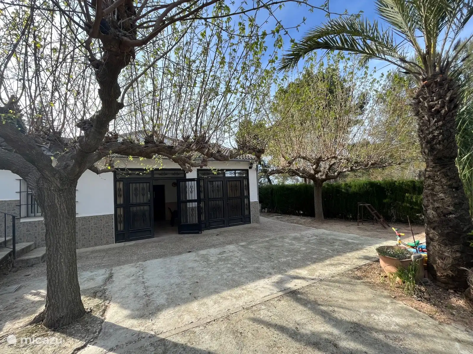La villa est à un niveau et entièrement clôturée avec une clôture en maille et une belle haie verte. Le jardin de 3200 m2 comprend 3 terrasses et, montant dans le jardin, de nombreux oliviers, orangers, citronniers et même des palmiers. Cela crée beaucoup d’espace assis et de détente, et on ressent vraiment l’impression d’espagnol tout au long du jeu. Logiquement, il y a aussi beaucoup d’espace de parking en sécurité derrière la clôture sur place, jusqu’à 6 voitures peuvent y être garées.