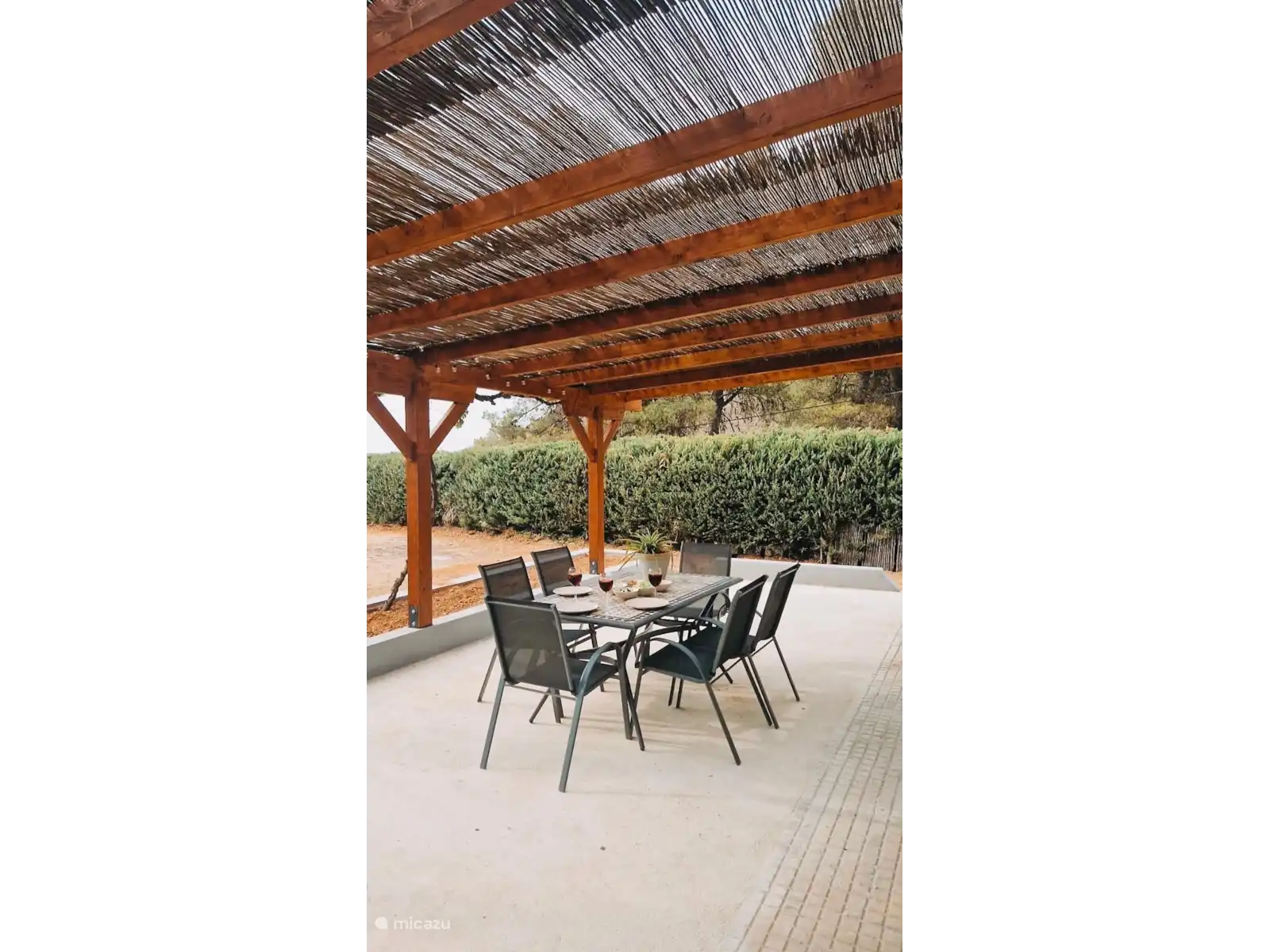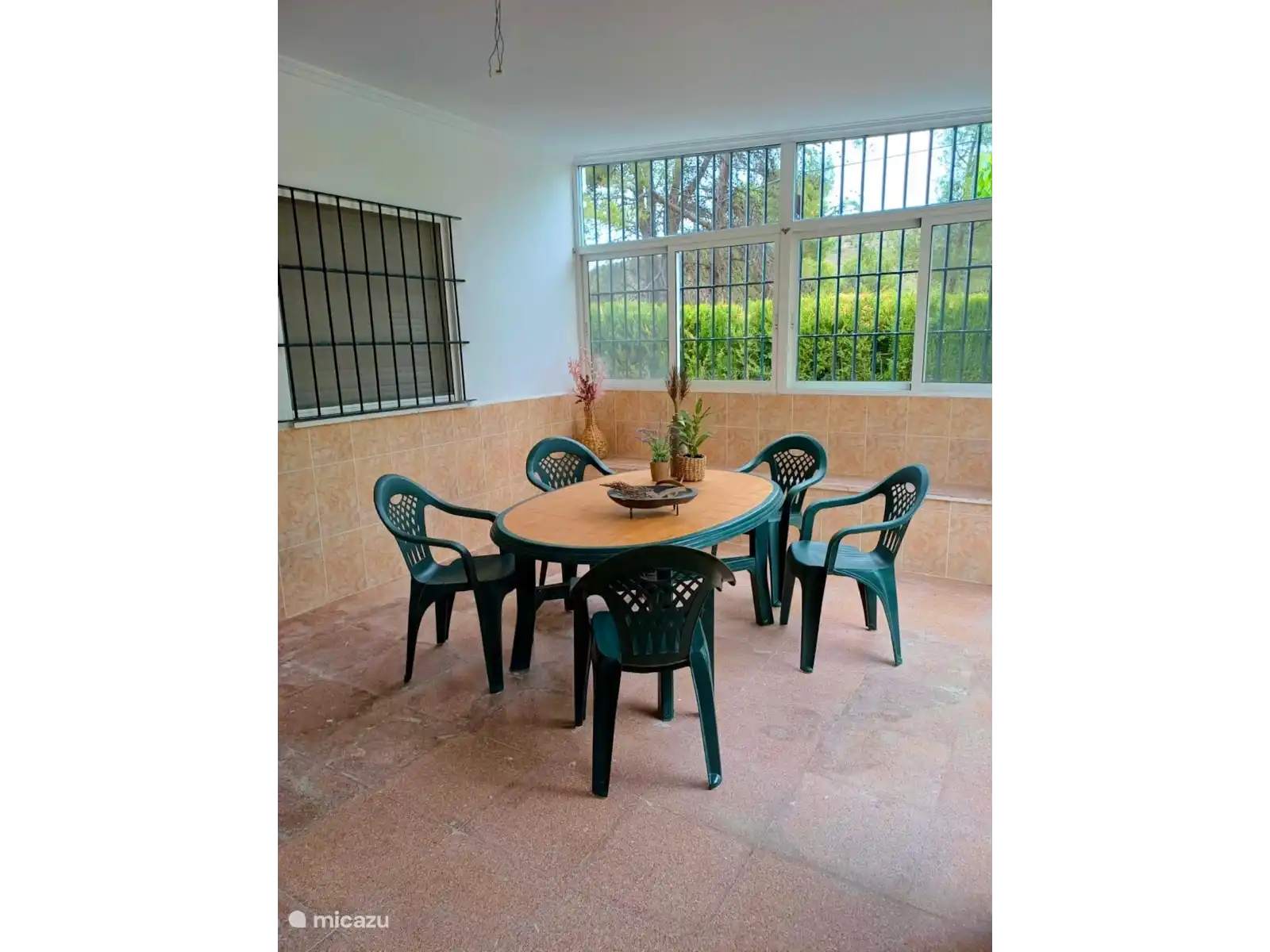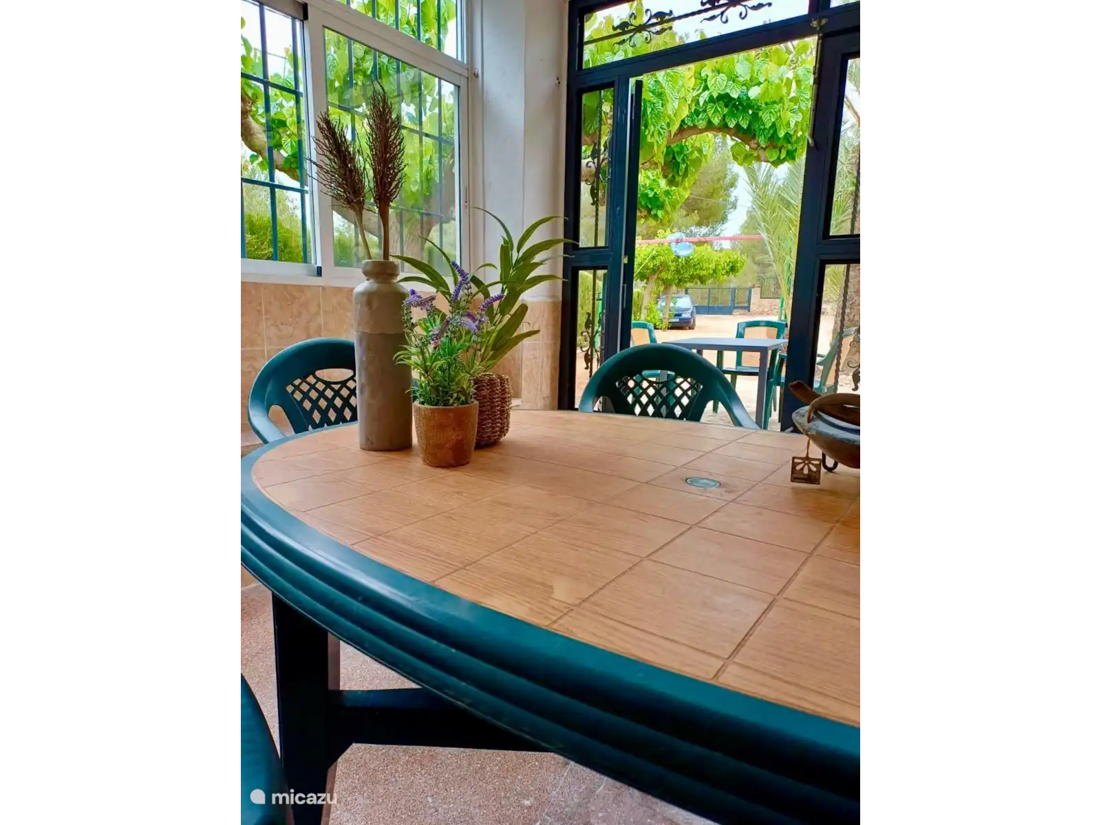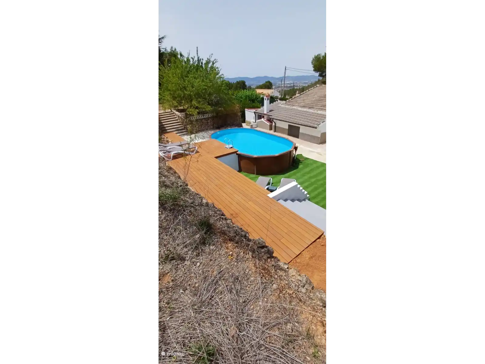 La villa est à un niveau et entièrement clôturée avec une clôture en maille et une belle haie verte. Le jardin de 3200 m2 comprend 3 terrasses et, montant dans le jardin, de nombreux oliviers, orangers, citronniers et même des palmiers. Cela crée beaucoup d’espace assis et de détente, et on ressent vraiment l’impression d’espagnol tout au long du jeu. Logiquement, il y a aussi beaucoup d’espace de parking en sécurité derrière la clôture sur place, jusqu’à 6 voitures peuvent y être garées.
