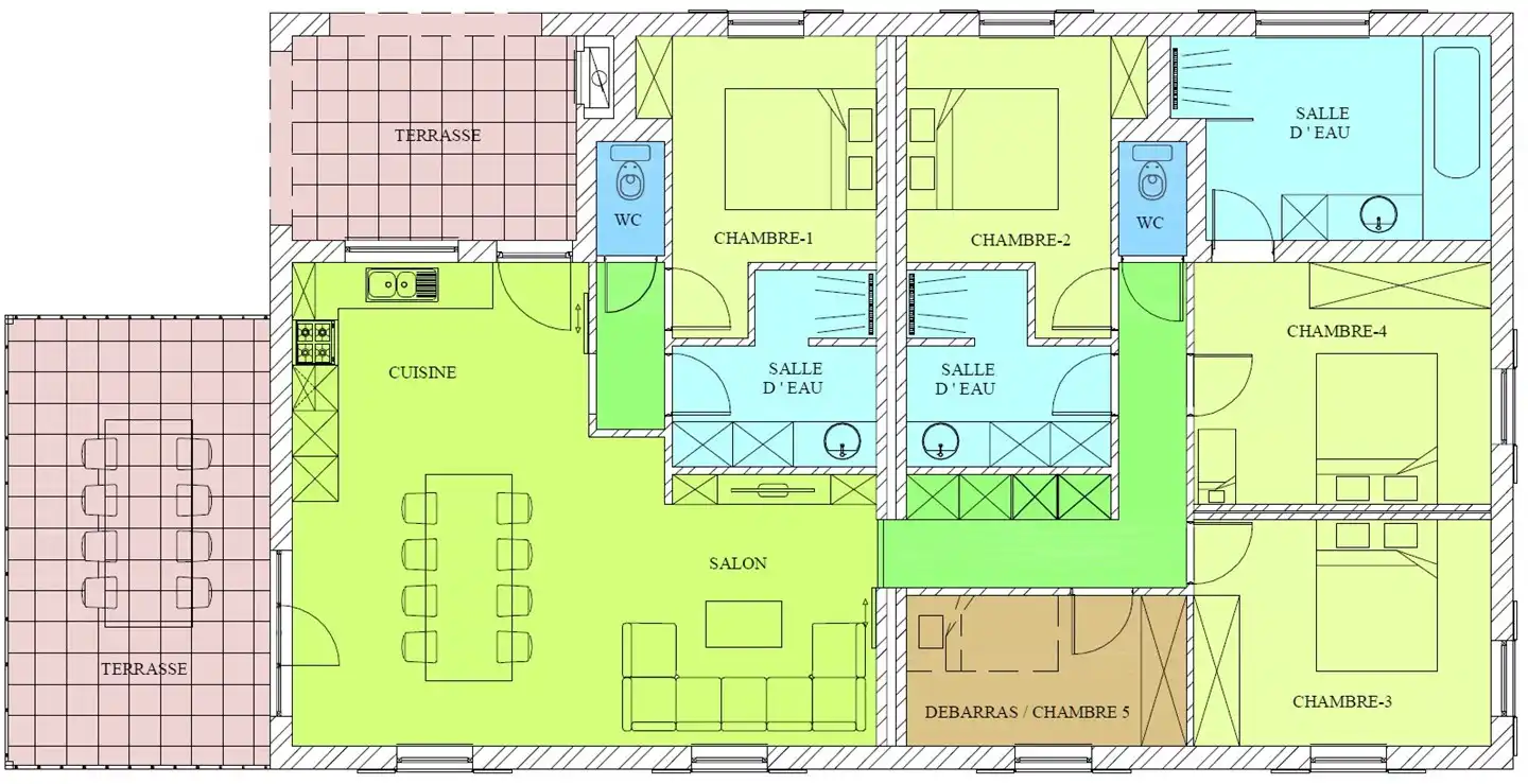 Il y a également 4 chambres avec sommier 160x200, 1 chambre avec lits superposés et la maison est équipée de 3 salles de bain (lavabo et douche) et 2 x WC séparés.