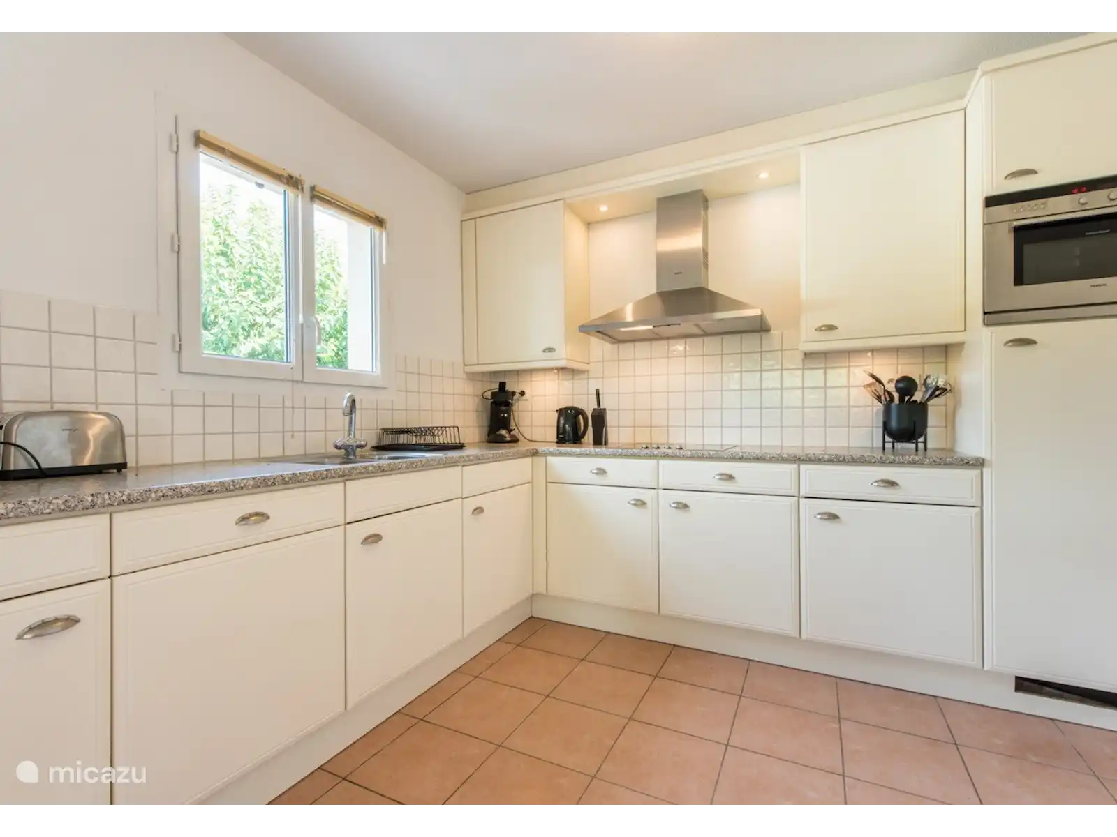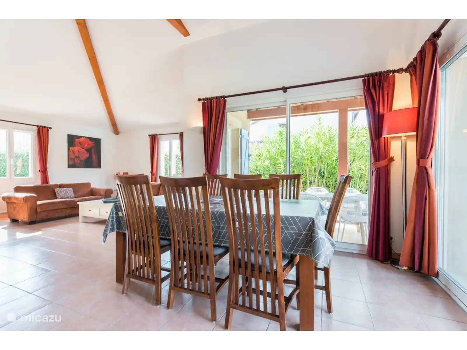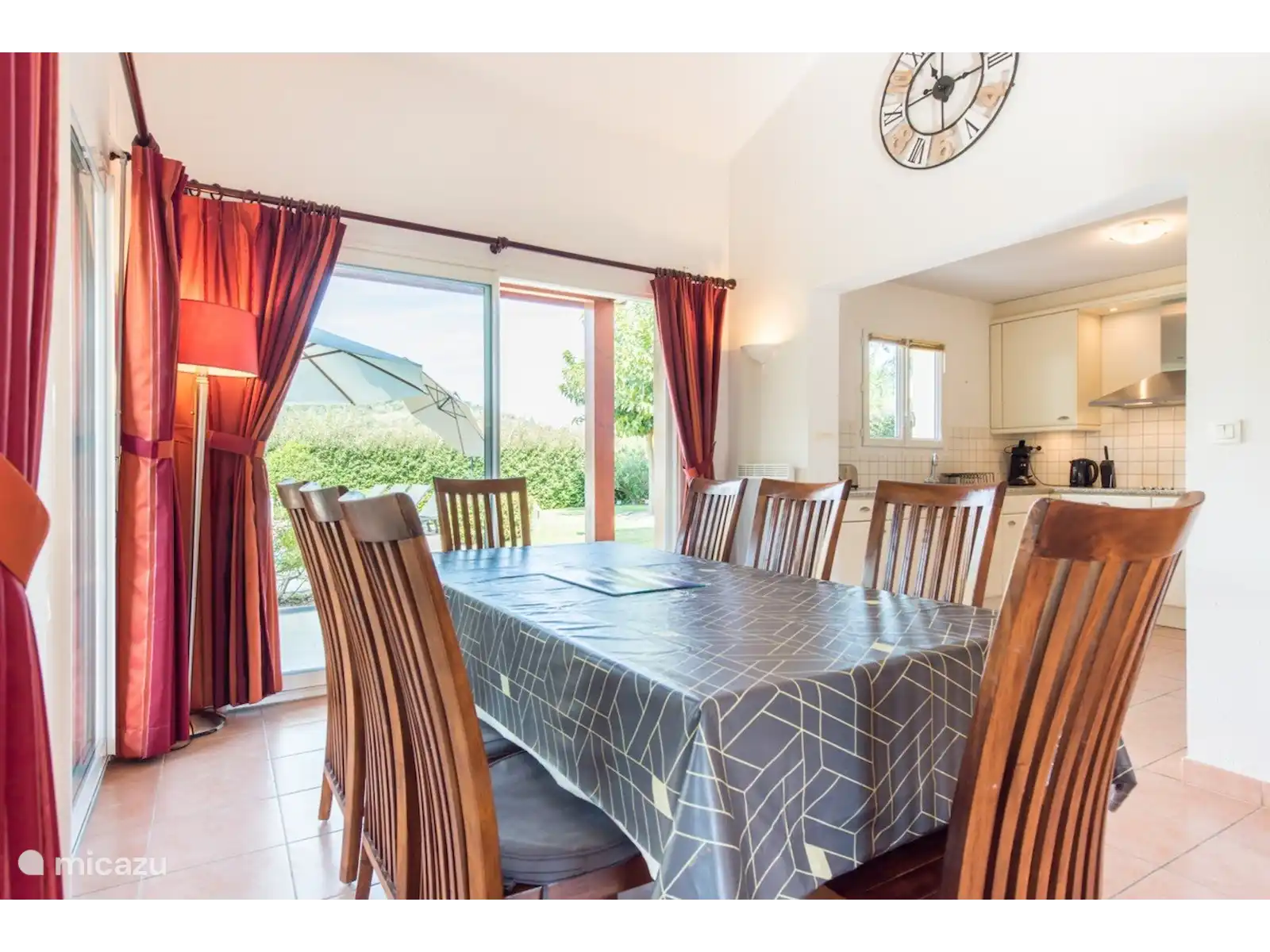 Extérieur : jardin avec terrasse couverte avec table à manger et chaises, piscine privée (9 x 4 m, profondeur 1,50 m) avec escalier romain. À l’arrière du jardin, il y a un coin salon supplémentaire, un endroit merveilleux pour profiter d’une planche de collations françaises.