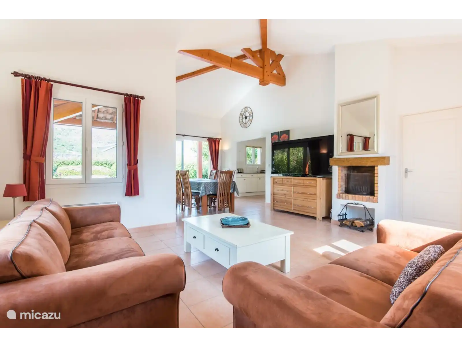 Salon spacieux avec coin salon et cheminée et télévision. Salle à manger avec coin repas et doubles portes coulissantes qui donnent accès à la terrasse couverte. Cuisine ouverte avec lave-vaisselle, réfrigérateur, four et micro-ondes. Machine à laver et sèche-linge à disposition.
