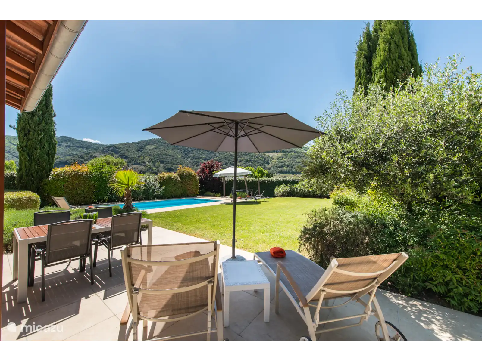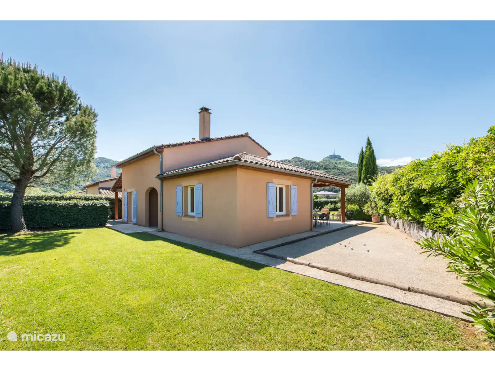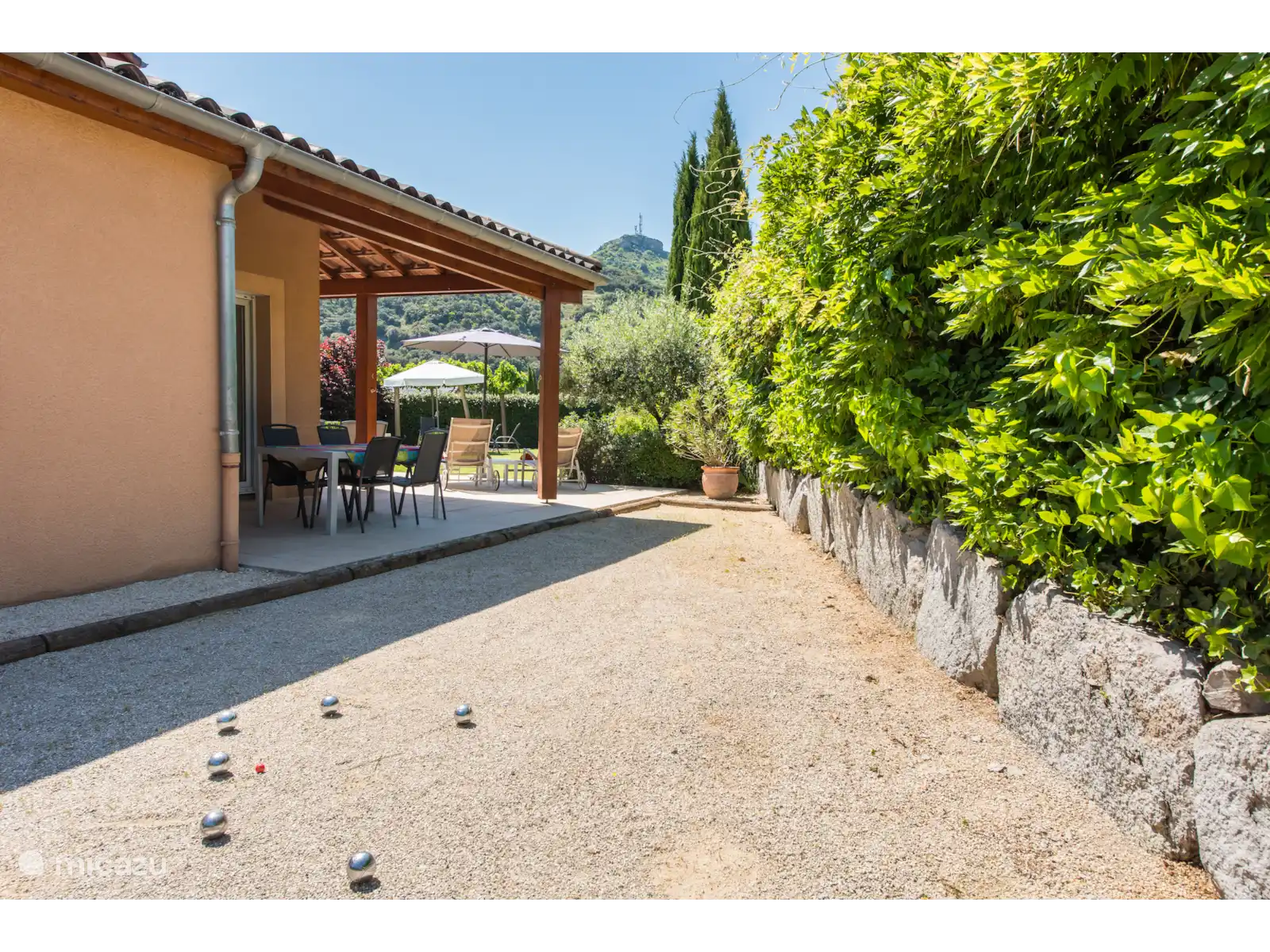Il y a aussi un terrain de jeu de boules français original dans le jardin. À l’arrière du jardin, vous trouverez un coin salon ombragé supplémentaire sous les arbres. Cette belle villa offre beaucoup d’intimité dans le jardin. La villa se trouve sur un terrain spacieux de 1000m2 avec un espace de stationnement pour 3 voitures.
