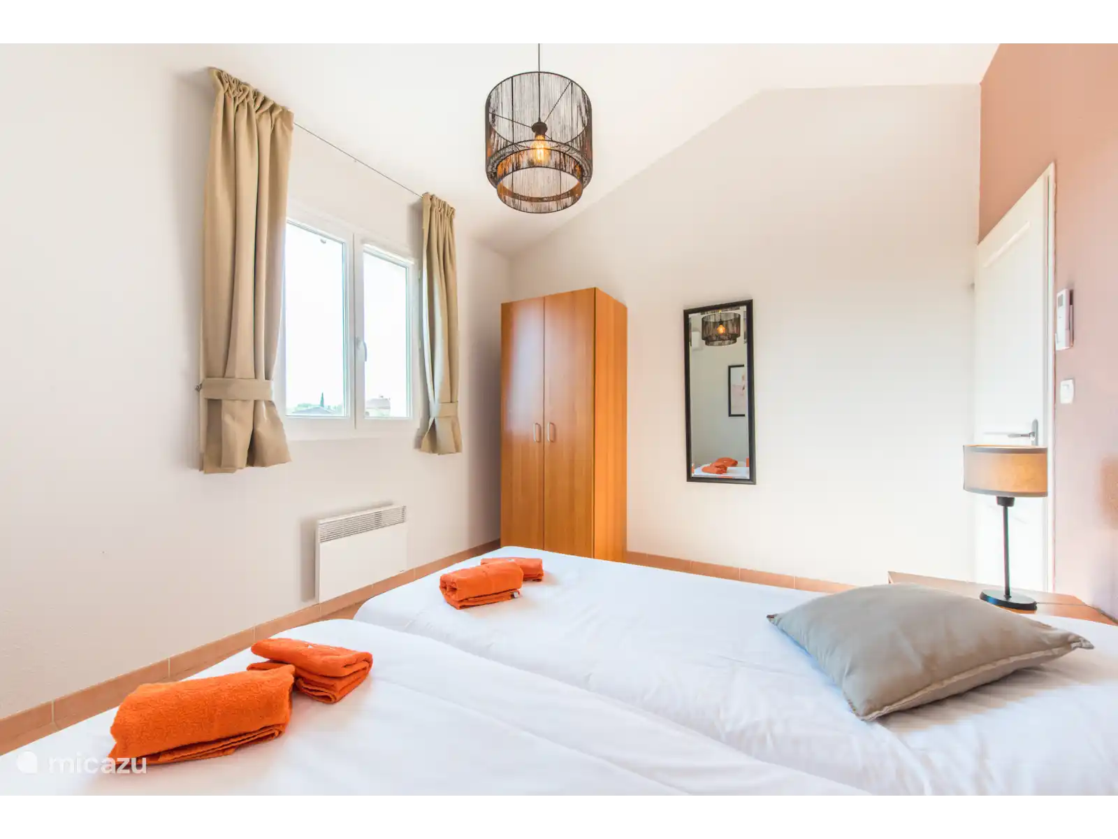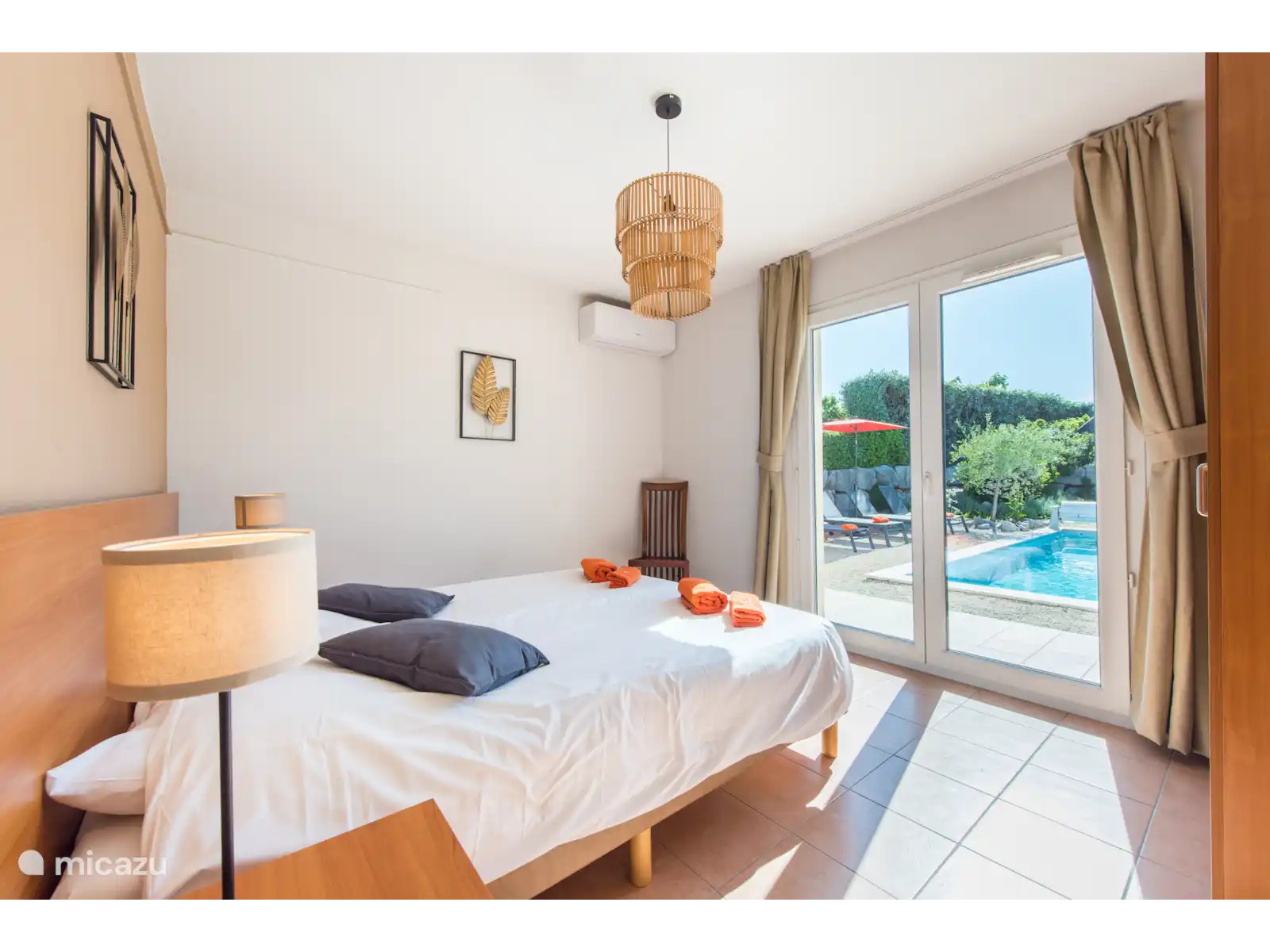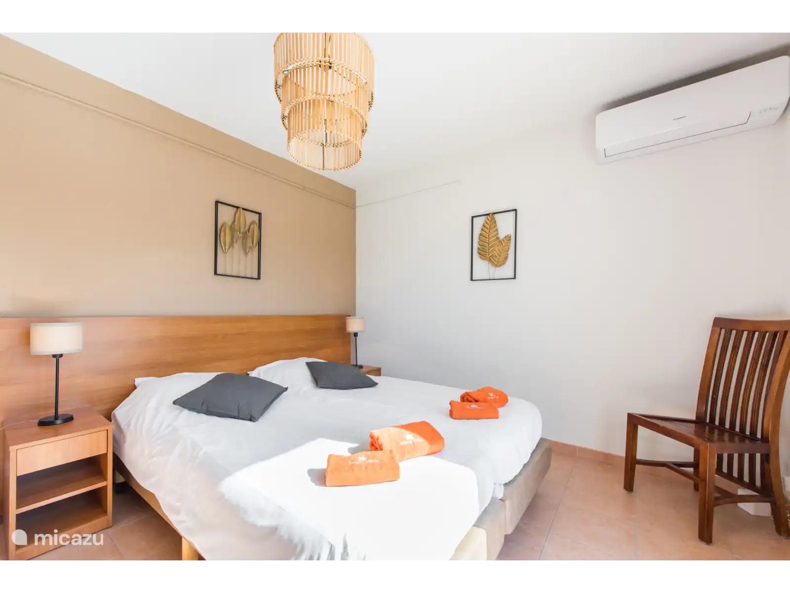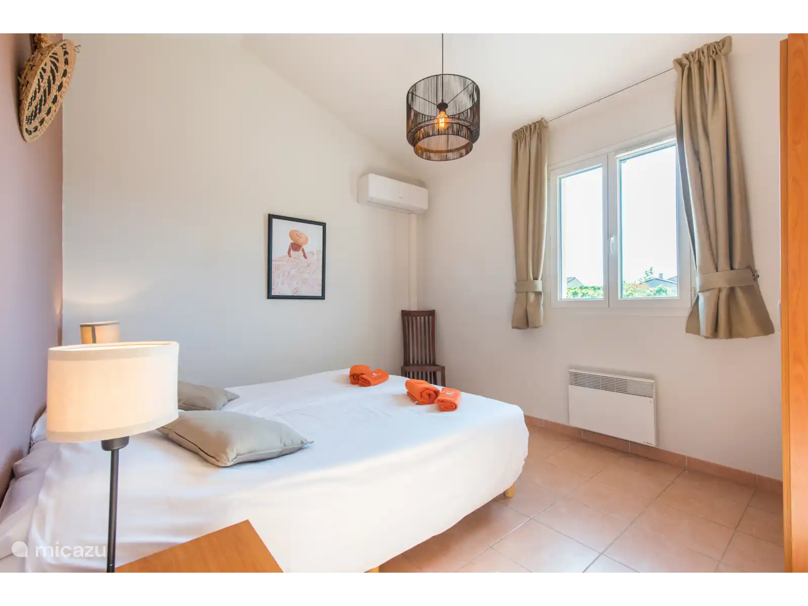 des chambres pour deux personnes (les lits peuvent être poussés écartés) avec climatisation et deux salles de bains, l’une avec baignoire et douche et l’autre avec douche. Les lits sont faits à l’arrivée. Il y a une chambre supplémentaire au premier étage avec un lit simple.